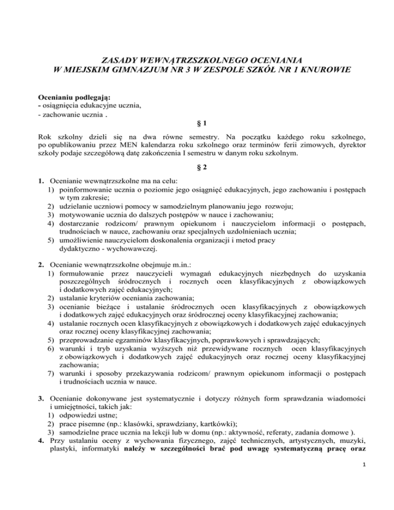 ZASADY WEWNĄTRZSZKOLNEGO OCENIANIA W MIEJSKIM GIMNAZJUM NR 3 W ZESPOLE SZKÓŁ NR 1 KNUROWIE Ocenianiu podlegają: - osiągnięcia edukacyjne ucznia, - zachowanie ucznia . §1 Rok szkolny dzieli się na dwa równe semestry. Na początku każdego roku szkolnego, po opublikowaniu przez MEN kalendarza roku szkolnego oraz terminów ferii zimowych, dyrektor szkoły podaje szczegółową datę zakończenia I semestru w danym roku szkolnym. §2 1. Ocenianie wewnątrzszkolne ma na celu: 1) poinformowanie ucznia o poziomie jego osiągnięć edukacyjnych, jego zachowaniu i postępach w tym zakresie; 2) udzielanie uczniowi pomocy w samodzielnym planowaniu jego rozwoju; 3) motywowanie ucznia do dalszych postępów w nauce i zachowaniu; 4) dostarczanie rodzicom/ prawnym opiekunom i nauczycielom informacji o postępach, trudnościach w nauce, zachowaniu oraz specjalnych uzdolnieniach ucznia; 5) umożliwienie nauczycielom doskonalenia organizacji i metod pracy dydaktyczno - wychowawczej. 2. Ocenianie wewnątrzszkolne obejmuje m.in.: 1) formułowanie przez nauczycieli wymagań edukacyjnych niezbędnych do uzyskania poszczególnych śródrocznych i rocznych ocen klasyfikacyjnych z obowiązkowych i dodatkowych zajęć edukacyjnych; 2) ustalanie kryteriów oceniania zachowania; 3) ocenianie bieżące i ustalanie śródrocznych ocen klasyfikacyjnych z obowiązkowych i dodatkowych zajęć edukacyjnych oraz śródrocznej oceny klasyfikacyjnej zachowania; 4) ustalanie rocznych ocen klasyfikacyjnych z obowiązkowych i dodatkowych zajęć edukacyjnych oraz rocznej oceny klasyfikacyjnej zachowania; 5) przeprowadzanie egzaminów klasyfikacyjnych, poprawkowych i sprawdzających; 6) warunki i tryb uzyskania wyższych niż przewidywane rocznych ocen klasyfikacyjnych z obowiązkowych i dodatkowych zajęć edukacyjnych oraz rocznej oceny klasyfikacyjnej zachowania; 7) warunki i sposoby przekazywania rodzicom/ prawnym opiekunom informacji o postępach i trudnościach ucznia w nauce. 3. Ocenianie dokonywane jest systematycznie i dotyczy różnych form sprawdzania wiadomości i umiejętności, takich jak: 1) odpowiedzi ustne; 2) prace pisemne (np.: klasówki, sprawdziany, kartkówki); 3) samodzielne prace ucznia na lekcji lub w domu (np.: aktywność, referaty, zadania domowe ). 4. Przy ustalaniu oceny z wychowania fizycznego, zajęć technicznych, artystycznych, muzyki, plastyki, informatyki należy w szczególności brać pod uwagę systematyczną pracę oraz 1 wysiłek wkładany przez ucznia w wywiązywanie się z obowiązków wynikających ze specyfiki tych zajęć, przy czym: 1) przy ustalaniu oceny z wychowania fizycznego, oprócz wysiłku wkładanego przez ucznia w wywiązywanie się z obowiązków wynikających ze specyfiki tych zajęć, bierze się pod uwagę również systematyczność udziału w lekcjach oraz aktywność ucznia w działaniach na rzecz sportu szkolnego i kultury fizycznej; 2) uczeń, który z przyczyn zdrowotnych zwolniony jest z wykonywania części ćwiczeń fizycznych lub zwolniony jest całkowicie z wychowania fizycznego, przynosi zwolnienie od lekarza ze wskazaniem przyczyny zwolnienia częściowego / całkowitego; przy zwolnieniu częściowym lekarz wskazuje ćwiczenia, z jakich uczeń jest zwolniony. 5. Przy dokonywaniu oceny rocznej, uwzględnia się ocenę semestralną z I i II semestru, przy czym przy ocenie niepełnej, decydujący wpływ na ocenę roczną ma ocena z II semestru. §3 1. Poziom opanowania przez ucznia wiedzy i umiejętności określonych podstawami programowymi z poszczególnych przedmiotów ocenia się w stopniach szkolnych według następującej skali: 1) celujący cel 6; 2) bardzo dobry bdb 5; 3) dobry db 4; 4) dostateczny dst 3; 5) dopuszczający dop 2; 6) niedostateczny ndst 1. 2. Ustala się następujące ogólne kryteria stopni: 1) stopień celujący otrzymuje uczeń, który rozwiązuje problemy w sposób twórczy i samodzielny, posiada pełen zakres wiedzy i umiejętności objętych podstawą programową i wybranym programem nauczania z danego przedmiotu; rozwija własne uzdolnienia; biegle posługuje się zdobytymi wiadomościami w rozwiązywaniu problemów teoretycznych i praktycznych; rozwiązuje zadania o skomplikowanym stopniu trudności; proponuje rozwiązania nietypowe; potrafi kojarzyć i łączyć wiadomości z różnych dziedzin wiedzy lub osiąga sukcesy w konkursach i olimpiadach przedmiotowych, zawodach sportowych i innych, kwalifikując się do finałów na szczeblu wojewódzkim, regionalnym albo krajowym lub posiada inne porównywalne osiągnięcia; 2) stopień bardzo dobry otrzymuje uczeń, który opanował pełen zakres wiedzy i umiejętności objętych podstawą programową i wybranym programem nauczania z danego przedmiotu; sprawnie posługuje się zdobytymi wiadomościami, rozwiązuje samodzielnie problemy teoretyczne i praktyczne; potrafi zastosować posiadaną wiedzę do rozwiązywania problemów w nowych sytuacjach; 3) stopień dobry otrzymuje uczeń, który nie opanował w pełni wiadomości i umiejętności objętych podstawą programową i wybranym programem nauczania z danego przedmiotu, ale opanował je na poziomie umożliwiającym samodzielne rozwiązywanie typowych zadań teoretycznych i praktycznych; poprawnie stosuje wiadomości; 4) stopień dostateczny otrzymuje uczeń, który opanował wiadomości i umiejętności objęte podstawą programową i wybranym programem nauczania z danego przedmiotu na poziomie nieprzekraczającym wymagań koniecznych oraz rozwiązuje typowe zadania teoretyczne i praktyczne o średnim stopniu trudności; 5) stopień dopuszczający otrzymuje uczeń, który ma braki w opanowaniu wiadomości określonych podstawą programową, ale braki te nie uniemożliwiają uzyskania przez ucznia podstawowej wiedzy z danego przedmiotu w ciągu dalszej nauki; rozwiązuje z pomocą nauczyciela typowe zadania teoretyczne i praktyczne o niewielkim stopniu trudności; 2 6) stopień niedostateczny otrzymuje uczeń, który 