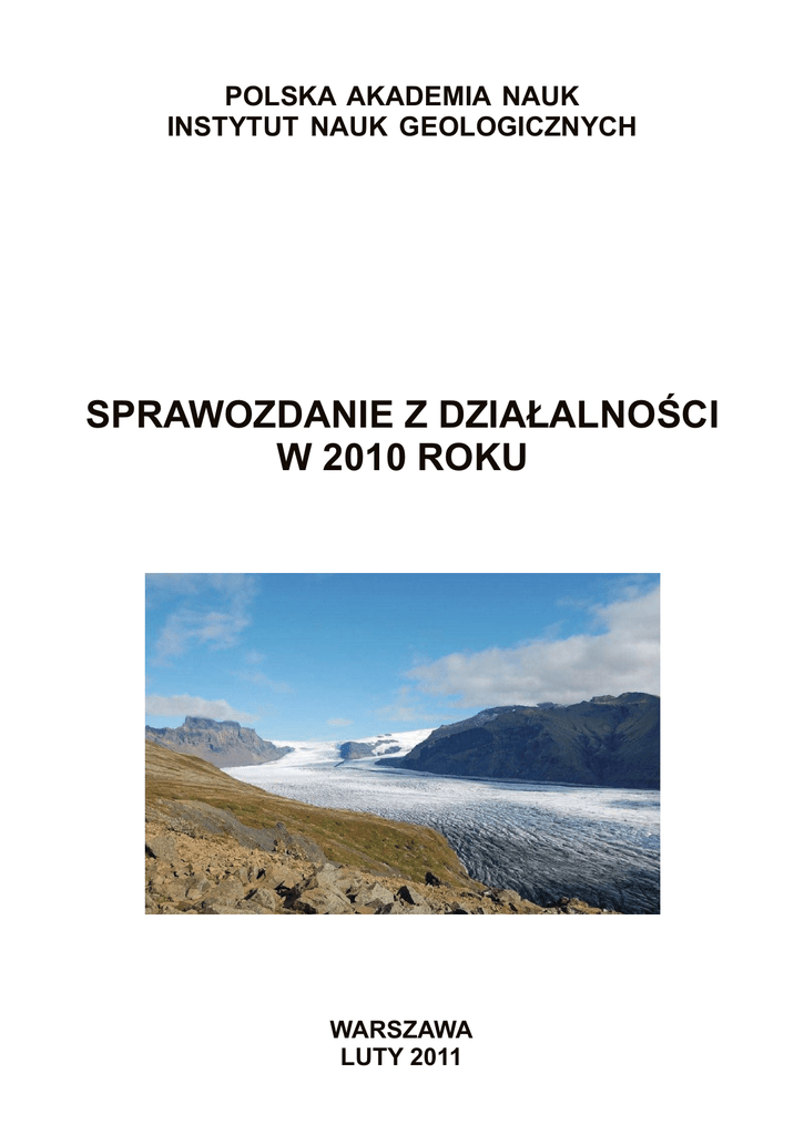 POLSKA AKADEMIA NAUK INSTYTUT NAUK GEOLOGICZNYCH SPRAWOZDANIE Z DZIA£ALNOŒCI W 2010 ROKU WARSZAWA LUTY 2011 Instytut Nauk Geologicznych Polskiej Akademii Nauk ul. Twarda 51/55 00-818 Warszawa INTERNET: http: //www.ing.pan.pl Opracowanie: dr Anna Morawska Sk³ad i druk Dzia³ Informacji i Wydawnictw Instytutu Nauk Geologicznych PAN Leszek Chudzikiewicz Luty 2011 r. Zdjêcie na ok³adce: Lodowiec Vatnajökull, Park Narodowy Skaftafell, Islandia (fot. Edyta Zawisza) 1 SPIS TREŒCI I. ORGANIZACJA INSTYTUTU. . . . . . . . . . . . . . . . . . . . . . . . . . . . . . . . . . . . 3 II. KADRA . . . . . . . . . . . . . . . . . . . . . . . . . . . . . . . . . . . . . . . . . . . . . . . 6 III. BADANIA STATUTOWE W 2010 ROKU. . . . . . . . . . . . . . . . . . . . . . . . . . . . . 9 Wyniki realizacji zadañ statutowych (abstrakty) . . . . . . . . . . . . . . . . . . . . . . . . . . . 9 IV. PROJEKTY BADAWCZE . . . . . . . . . . . . . . . . . . . . . . . . Projekty badawcze zakoñczone w 2010 r., realizowane w Instytucie . . . . Projekty badawcze w toku realizowane w Instytucie . . . . . . . . . . . . Projekty miêdzynarodowe niewspó³finansowane, prowadzone w Instytucie Udzia³ w projektach badawczych prowadzonych poza Instytutem . . . . . . . . . . . . . . . . . . . . . . . . . . . . . . . . . . . . . . . . . . . . . . . . . . . . . . . . . . . . . . . . . 27 27 29 35 35 V. KONSORCJA NAUKOWE . . . . . . . . . . . . . . . . . . . . . . . . . . . . . . . . . . . . 44 VI. EKSPERTYZY, ZLECENIA . . . . . . . . . . . . . . . . . . . . . . . . . . . . . . . . . . . 46 VII. WSPÓ£PRACA MIÊDZYNARODOWA . . . . . . . . . . . . . . . . Udzia³ w miêdzynarodowych programach badawczych. . . . . . . . . . . Zg³oszenia do miêdzynarodowych programów badawczych . . . . . . . . Wykaz tematów realizowanych w 2010 r. na podstawie umów . . . . . . . Sprawozdanie z realizacji tematów . . . . . . . . . . . . . . . . . . . . . Wspó³praca miêdzynarodowa realizowana bez umów . . . . . . . . . . . Cz³onkostwo z wyboru w miêdzynarodowych organizacjach naukowych . Miêdzynarodowa wymiana osobowa . . . . . . . . . . . . . . . . . . . . . . . . . . . . . . . . . . . . . . . . . . . . . . . . . . . . . . . . . . . . . . . . . . . . . . . . . . . . . . . . . . . . . . . . . . . . . . . . . . . . . . . . . . . . . . . . . . . . 48 48 50 50 51 55 60 61 VIII. UPOWSZECHNIANIE WYNIKÓW BADAÑ . . . . . Konferencje i warsztaty wspó³organizowane przez Instytut. Udzia³ pracowników w konferencjach . . . . . . . . . . . Konferencje krajowe . . . . . . . . . . . . . . . . . . . Konferencje miêdzynarodowe zorganizowane w kraju . . Konferencje zagraniczne . . . . . . . . . . . . . . . . . Seminaria naukowe Instytutu . . . . . . . . . . . . . . . . Referaty wyg³oszone poza Instytutem. . . . . . . . . . . . . . . . . . . . . . . . . . . . . . . . . . . . . . . . . . . . . . . . . . . . . . . . . . . . . . . . . . . . . . . . . . . . . . . . . . . . . . . . . . . . . . . . . . . . . . . . . . . . . . . . . . . . . . . . . . . . . . . . . . . . . . . . . . . . . . . . . . . . 65 65 67 67 68 70 73 74 IX. DZIA£ALNOŒÆ DYDAKTYCZNA I POPULARYZATORSKA Dzia³alnoœæ pracowników . . . . . . . . . . . . . . . . . . . . . . Studium Doktoranckie. . . . . . . . . . . . . . . . . . . . . . . . Muzeum Geologiczne w Krakowie . . . . . . . . . . . . . . . . . . . . . . . . . . . . . . . . . . . . . . . . . . . . . . . . . . . . . . . . . . . . . . . . . . . . . . . . . . . . . . . . . 76 76 77 78 X. DZIA£ALNOŒÆ WSPOMAGAJ¥CA BADANIA Dzia³alnoœæ laboratoriów . . . . . . . . . . . . . . Biblioteki . . . . . . . . . . . . . . . . . . . . . . Dzia³ informacji i wydawnictw . . . . . . . . . . . . . . . . . . . . . . . . . . . . . . . . . . . . . . . . . . . . . . . . . . . . . . . . . . . . . . . . . . . . . . . . . . . 80 80 82 83 . . . . . . . . . . . . . . . . . . . . . . . . . . . . . . . . . . . . . . . . . . . . . . . . . . . . . . . . XI. SPIS PUBLIKACJI 2010 . . . . . . . . . . . . . . . . . . . . . . . . . . . . . . . . . . . . . 84 Prace opublikowane . . . . . . . . . . . . . . . . . . . . . . . . . . . . . . . . . . . . . . . . . 84 Prace przyjête do druku . . . . . . . . . . . . . . . . . . . . . . . . . . . . . . . . . . . . . . . 89 2 3 I. ORGANIZACJA INSTYTUTU DYREKCJA Adres dyrekcji: Instytut Nauk Geologicznych Polskiej Akademii Nauk ul. Twarda 51/55, 00-818 Warszawa, tel. (48-22) 697-87-00, fax: (48-22) 620-62-23 http://www.ing.pan.pl, e-mail: [email protected] Dyrektor: prof. dr hab. Marek Lewandowski e-mail: [email protected] Sekretariat naukowy: mgr El¿bieta Gogacz e-mail: [email protected] Zastêpca dyrektora ds. administracyjno-ekonomicznych: Hanna Martyniak e-mail: [email protected] G³ówny ksiêgowy: Miros³awa Bachman e-mail: [email protected] Stanowisko ds. kadr: mgr in¿. Ewa Markiewicz e-mail: [email protected] RADA NAUKOWA Przewodnicz¹cy: prof. dr hab. Jan Dowgia³³o Zastêpca przewodnicz¹cego: prof. dr hab. Andrzej ¯elaŸniewicz – cz³onek koresp. PAN Sekretarz: dr Hubert Wierzbowski Cz³onkowie: dr hab. Robert Anczkiewicz, prof. dr hab. Nonna Bakun-Czubarow, prof. dr in¿. Krzysztof Birkenmajer – cz³onek rzecz. PAN, prof. dr hab. Jan Burchart – cz³onek koresp. PAN, prof. dr hab. Ryszard Gradziñski – cz³onek rzecz. PAN, prof. dr hab. Stanis³aw Ha³as, dr hab. Helena Hercman, prof. dr hab. Jerzy Jankowski – cz³onek rzecz. PAN, prof. dr hab. Krzysztof Jaworowski, prof. dr hab. in¿. Janusz Kotlarczyk – cz³onek rzecz. PAN, dr hab. Krzysztof Krajewski, dr hab. Monika Kusiak, prof. dr hab. Jan Kutek – cz³onek rzecz. PAN, dr hab. Pawe³ Leœniak, prof. dr hab. Marek Lewandowski, prof. dr hab. Teresa Madeyska, dr Izabella Nowak, prof. dr hab. Szczepan Porêbski, prof. dr hab. Andrzej Pszczó³kowski, prof. dr hab. Ewa S³aby, prof. dr hab. Leszek Starkel – cz³onek rzecz. PAN prof. dr hab. Krystyna Szeroczyñska, prof. dr hab. Micha³ Szulczewski – cz³onek rzecz. PAN, prof. dr h