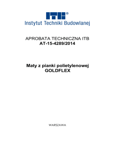 APROBATA TECHNICZNA ITB AT-15-4289/2014 Maty z pianki polietylenowej GOLDFLEX WARSZAWA Aprobata techniczna została opracowana w Zakładzie Aprobat Technicznych przez mgr inż. Martę SIDOR Projekt okładki: Ewa Kossakowska GW V Kopiowanie aprobaty technicznej jest dozwolone jedynie w całości Wykonano z oryginałów bez opracowania wydawniczego © Copyright by Instytut Techniki Budowlanej Warszawa 2014 ISBN 978-83-249-7820-5 Dział Upowszechniania Wiedzy 02-656 Warszawa, ul. Ksawerów 21, tel.: 22 843 35 19 Format pdf Wydano we wrześniu 2014 r. zam. 745/2014 Seria: APROBATY TECHNICZNE Egzemplarz archiwalny APROBATA TECHNICZNA ITB AT-15-4289/2014 Na podstawie rozporządzenia Ministra Infrastruktury z dnia 8 listopada 2004 r. w sprawie aprobat technicznych oraz jednostek organizacyjnych upoważnionych do ich wydawania (Dz. U. Nr 249, poz. 2497), w wyniku postępowania aprobacyjnego dokonanego w Instytucie Techniki Budowlanej w Warszawie, na wniosek firmy: GOLDFOAM Spółka z o.o. 00-801 Warszawa, ul. Chmielna 100 stwierdza się przydatność do stosowania w budownictwie wyrobów pod nazwą: Maty z pianki polietylenowej GOLDFLEX w zakresie i na zasadach określonych w Załączniku, który jest integralną częścią niniejszej Aprobaty Technicznej ITB. Termin ważności: 28 lipca 2019 r. Zastępca Dyrektora ds. Współpracy z Gospodarką Marek Kaproń Załącznik: Postanowienia ogólne i techniczne Warszawa, 28 lipca 2014 r. Aprobata Techniczna ITB AT-15-4289/2014 z lipca 2014 r. jest nowelizacją Aprobaty Technicznej ITB AT-15-4289/2014 z marca 2014 r. Dokument Aprobaty Technicznej ITB AT-15-4289/2014 zawiera 17 stron. Tekst tego dokumentu można kopiować tylko w całości. Publikowanie lub upowszechnianie w każdej innej formie fragmentów tekstu Aprobaty Technicznej wymaga pisemnego uzgodnienia z Instytutem Techniki Budowlanej. AT-15-4289/2014 2/17 ZAŁĄCZNIK POSTANOWIENIA OGÓLNE I TECHNICZNE SPIS TREŚCI 1. PRZEDMIOT APROBATY ................................................................................................... 3 2. PRZEZNACZENIE, ZAKRES I WARUNKI STOSOWANIA ............................................. 4 3. WŁAŚCIWOŚCI TECHNICZNE. WYMAGANIA .................................................................. 6 3.1. Surowce........................................................................................................................ 6 3.2. Właściwości techniczno-użytkowe................................................................................ 6 3.3. Właściwości akustyczne ............................................................................................... 8 4. PAKOWANIE, PRZECHOWYWANIE I TRANSPORT ........................................................ 9 5. OCENA ZGODNOŚCI ....................................................................................................... 10 5.1. Zasady ogólne ............................................................................................................ 10 5.2. Wstępne badanie typu ................................................................................................ 10 5.3. Zakładowa kontrola produkcji ..................................................................................... 11 5.4. Badania gotowych wyrobów ....................................................................................... 11 5.5. Częstotliwość badań................................................................................................... 12 5.6. Metody badań ............................................................................................................. 12 5.7. Pobieranie próbek do badań ...................................................................................... 13 5.8. Ocena wyników badań ............................................................................................... 13 6. USTALENIA FORMALNO - PRAWNE ............................................................................. 13 7. TERMIN WAŻNOŚCI ....................................................................................................... 14 INFORMACJE DODATKOWE .............................................................................................. 14 RYSUNKI ............................................................................................................................... 16 AT-15-4289/2014 3/17 1. PRZEDMIOT APROBATY Przedmiotem Aprobaty Technicznej ITB są maty z pianki polietylenowej GOLDFLEX, produkowane przez firmę GOLDFOAM Spółka z o.o., 00-801 Warszawa, ul. Chmielna 100. Niniejsza Aprobata obejmuje maty GOLDFLEX typu: − GF2 jednowarstwowe, grubości 2 mm, − GF3 jednowarstwowe, grubości 3 mm, − GF3 jednostronnie laminowane, grubości 3 mm, − GF5 jednowarstwowe, grubości 5 mm, − GF8 jednowarstwowe, grubości 8 mm, − GF10 jednowarstwowe, grubości 10 mm, − PS3 dwustronnie laminowane, grubości 11 mm, − GF15 jednowarstwowe, grubości 15 mm. Maty GOLDFLEX typu GF2, GF3, GF5, GF8, GF10 i GF15 wykonywane są z elastycznej pianki polietylenowej, posiadającej strukturę porowatą o zamkniętych porach. Maty GOLDFLEX typu GF3 laminowane są wykonywane z pianki polietylenowej, posiadającej strukturę porowatą o zamkniętych porach i są laminowane jednostronnie folią polietylenową (LDPE). Maty GOLDFLEX typu PS3 są wykonywane z dwóch połączonych ze sobą warstw pianki polietylenowej, posiadającej strukturę porowatą o zamkniętych porach i są laminowane dwustronnie folią polietylenową (LDPE) oraz folią z politereftalanu etylenu (PET) metalizowanego aluminium (rys. 1). Pianka polietylenowa otrzymywana jest z granulatu polietylenowego o niskiej gęstości (LDPE). Maty GOLDFLEX objęte Aprobatą dostarczane są w zrolowanych lub nawiniętych na papierową tuleję odcinkach o długości 50, 100 lub 175 m i szerokości 1000 lub 1250 mm. Mogą być dostarczane maty o innych długościach i szerokościach, po uzgodnieni