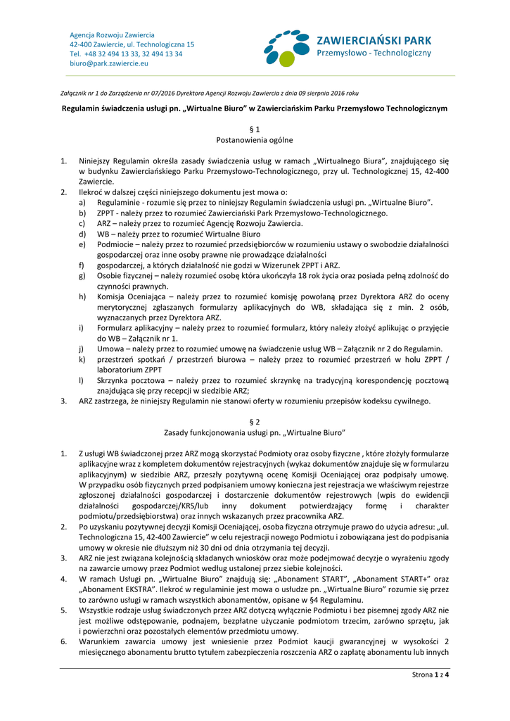 Agencja Rozwoju Zawiercia 42-400 Zawiercie, ul. Technologiczna 15 Tel. +48 32 494 13 33, 32 494 13 34 [email protected] Załącznik nr 1 do Zarządzenia nr 07/2016 Dyrektora Agencji Rozwoju Zawiercia z dnia 09 sierpnia 2016 roku Regulamin świadczenia usługi pn. „Wirtualne Biuro” w Zawierciańskim Parku Przemysłowo Technologicznym §1 Postanowienia ogólne 1. 2. 3. Niniejszy Regulamin określa zasady świadczenia usług w ramach „Wirtualnego Biura”, znajdującego się w budynku Zawierciańskiego Parku Przemysłowo-Technologicznego, przy ul. Technologicznej 15, 42-400 Zawiercie. Ilekroć w dalszej części niniejszego dokumentu jest mowa o: a) Regulaminie - rozumie się przez to niniejszy Regulamin świadczenia usługi pn. „Wirtualne Biuro”. b) ZPPT - należy przez to rozumieć Zawierciański Park Przemysłowo-Technologicznego. c) ARZ – należy przez to rozumieć Agencję Rozwoju Zawiercia. d) WB – należy przez to rozumieć Wirtualne Biuro e) Podmiocie – należy przez to rozumieć przedsiębiorców w rozumieniu ustawy o swobodzie działalności gospodarczej oraz inne osoby prawne nie prowadzące działalności f) gospodarczej, a których działalność nie godzi w Wizerunek ZPPT i ARZ. g) Osobie fizycznej – należy rozumieć osobę która ukończyła 18 rok życia oraz posiada pełną zdolność do czynności prawnych. h) Komisja Oceniająca – należy przez to rozumieć komisję powołaną przez Dyrektora ARZ do oceny merytorycznej zgłaszanych formularzy aplikacyjnych do WB, składająca się z min. 2 osób, wyznaczanych przez Dyrektora ARZ. i) Formularz aplikacyjny – należy przez to rozumieć formularz, który należy złożyć aplikując o przyjęcie do WB – Załącznik nr 1. j) Umowa – należy przez to rozumieć umowę na świadczenie usług WB – Załącznik nr 2 do Regulamin. k) przestrzeń spotkań / przestrzeń biurowa – należy przez to rozumieć przestrzeń w holu ZPPT / laboratorium ZPPT l) Skrzynka pocztowa – należy przez to rozumieć skrzynkę na tradycyjną korespondencję pocztową znajdująca się przy recepcji w siedzibie ARZ; ARZ zastrzega, że niniejszy Regulamin nie stanowi oferty w rozumieniu przepisów kodeksu cywilnego. §2 Zasady funkcjonowania usługi pn. „Wirtualne Biuro” 1. 2. 3. 4. 5. 6. Z usługi WB świadczonej przez ARZ mogą skorzystać Podmioty oraz osoby fizyczne , które złożyły formularze aplikacyjne wraz z kompletem dokumentów rejestracyjnych (wykaz dokumentów znajduje się w formularzu aplikacyjnym) w siedzibie ARZ, przeszły pozytywną ocenę Komisji Oceniającej oraz podpisały umowę. W przypadku osób fizycznych przed podpisaniem umowy konieczna jest rejestracja we właściwym rejestrze zgłoszonej działalności gospodarczej i dostarczenie dokumentów rejestrowych (wpis do ewidencji działalności gospodarczej/KRS/lub inny dokument potwierdzający formę i charakter podmiotu/przedsiębiorstwa) oraz innych wskazanych przez pracownika ARZ. Po uzyskaniu pozytywnej decyzji Komisji Oceniającej, osoba fizyczna otrzymuje prawo do użycia adresu: „ul. Technologiczna 15, 42-400 Zawiercie” w celu rejestracji nowego Podmiotu i zobowiązana jest do podpisania umowy w okresie nie dłuższym niż 30 dni od dnia otrzymania tej decyzji. ARZ nie jest związana kolejnością składanych wniosków oraz może podejmować decyzje o wyrażeniu zgody na zawarcie umowy przez Podmiot według ustalonej przez siebie kolejności. W ramach Usługi pn. „Wirtualne Biuro” znajdują się: „Abonament START”, „Abonament START+” oraz „Abonament EKSTRA”. Ilekroć w regulaminie jest mowa o usłudze pn. „Wirtualne Biuro” rozumie się przez to zarówno usługi w ramach wszystkich abonamentów, opisane w §4 Regulaminu. Wszystkie rodzaje usług świadczonych przez ARZ dotyczą wyłącznie Podmiotu i bez pisemnej zgody ARZ nie jest możliwe odstępowanie, podnajem, bezpłatne użyczanie podmiotom trzecim, zarówno sprzętu, jak i powierzchni oraz pozostałych elementów przedmiotu umowy. Warunkiem zawarcia umowy jest wniesienie przez Podmiot kaucji gwarancyjnej w wysokości 2 miesięcznego abonamentu brutto tytułem zabezpieczenia roszczenia ARZ o zapłatę abonamentu lub innych Strona 1 z 4 Agencja Rozwoju Zawiercia 42-400 Zawiercie, ul. Technologiczna 15 Tel. +48 32 494 13 33, 32 494 13 34 [email protected] Załącznik nr 1 do Zarządzenia nr 07/2016 Dyrektora Agencji Rozwoju Zawiercia z dnia 09 sierpnia 2016 roku 7. 1. 2. 3. 4. 5. 6. 7. 1. 2. 3. roszczeń na rachunek Bank Pekao S.A. nr 97 1240 4272 1111 0010 6559 3821. Wpłacona kaucja w formie gotówki nie podlega oprocentowaniu ani waloryzacji. Kaucja zostanie zwrócona po rozwiązaniu umowy w terminie 7 dni od otrzymania wniosku o jej zwrot, chyba że zostanie wykorzystana zgodnie z celem jej ustanowienia. Lokatorzy wynajmujący powierzchnię w ZPPT nie mają możliwości korzystania z usługi pn. „Wirtualne Biuro”. §3 Wirtualne Biuro oraz warunki jego udostępniania ARZ nie ponosi odpowiedzialności za przesyłki pocztowe i mienie pozostawione w skrzynce pocztowej. Odbiór oraz przechowanie korespondencji poleconej w WB – może nastąpić wyłącznie za pocztowym upoważnieniem imiennym dla pracownika ARZ lub złożeniu oświadczenia zezwalającego na włożenie przesyłki poleconej do skrzynki pocztowej, bez potwierdzenia odbioru. Umowa na świadczenie usługi pn. „Wirtualne Biuro” może zostać zawarta na okres nie dłuższy niż 3 lata. Po tym okresie Podmiot może wystąpić o przedłużenie umowy na kolejne okresy, nie dłuższe jednak niż 3 lata. W celu przedłużenia okresu korzystania z usługi pn. „Wirtualne Biuro” Podmiot zobowiązany jest przedłożyć w ARZ pisemny wniosek wraz z uzasadnieniem, co najmniej na miesiąc przed zakończeniem obowiązywania umowy. Ustalone umową wynagrodzenie podlegać będzie waloryzacji. Podstawą waloryzacji wynagrodzenia – nie częściej niż raz do roku - będzie wskaźnik wzrostu cen na towary i