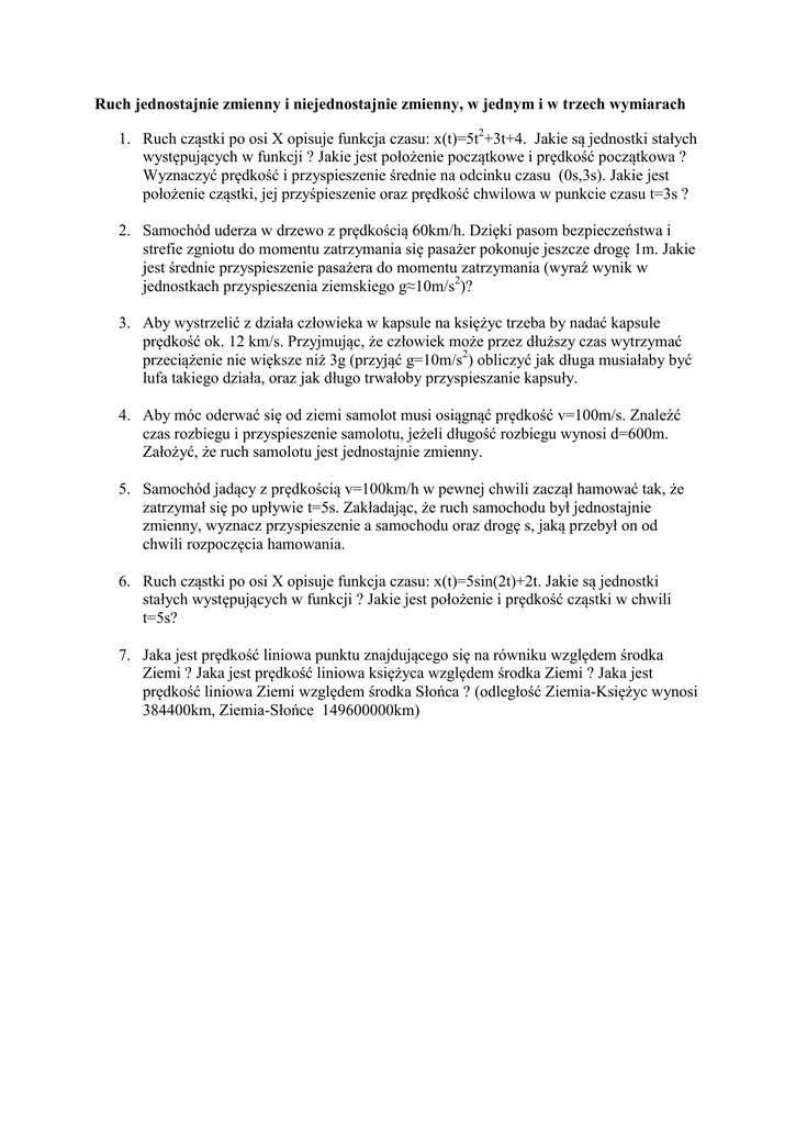 Ruch jednostajnie zmienny i niejednostajnie zmienny, w jednym i w trzech wymiarach 1. Ruch cząstki po osi X opisuje funkcja czasu: x(t)=5t2+3t+4. Jakie są jednostki stałych występujących w funkcji ? Jakie jest położenie początkowe i prędkość początkowa ? Wyznaczyć prędkość i przyspieszenie średnie na odcinku czasu (0s,3s). Jakie jest położenie cząstki, jej przyśpieszenie oraz prędkość chwilowa w punkcie czasu t=3s ? 2. Samochód uderza w drzewo z prędkością 60km/h. Dzięki pasom bezpieczeństwa i strefie zgniotu do momentu zatrzymania się pasażer pokonuje jeszcze drogę 1m. Jakie jest średnie przyspieszenie pasażera do momentu zatrzymania (wyraź wynik w jednostkach przyspieszenia ziemskiego g≈10m/s2)? 3. Aby wystrzelić z działa człowieka w kapsule na księżyc trzeba by nadać kapsule prędkość ok. 12 km/s. Przyjmując, że człowiek może przez dłuższy czas wytrzymać przeciążenie nie większe niż 3g (przyjąć g=10m/s2) obliczyć jak długa musiałaby być lufa takiego działa, oraz jak długo trwałoby przyspieszanie kapsuły. 4. Aby móc oderwać się od ziemi samolot musi osiągnąć prędkość v=100m/s. Znaleźć czas rozbiegu i przyspieszenie samolotu, jeżeli długość rozbiegu wynosi d=600m. Założyć, że ruch samolotu jest jednostajnie zmienny. 5. Samochód jadący z prędkością v=100km/h w pewnej chwili zaczął hamować tak, że zatrzymał się po upływie t=5s. Zakładając, że ruch samochodu był jednostajnie zmienny, wyznacz przyspieszenie a samochodu oraz drogę s, jaką przebył on od chwili rozpoczęcia hamowania. 6. Ruch cząstki po osi X opisuje funkcja czasu: x(t)=5sin(2t)+2t. Jakie są jednostki stałych występujących w funkcji ? Jakie jest położenie i prędkość cząstki w chwili t=5s? 7. Jaka jest prędkość liniowa punktu znajdującego się na równiku względem środka Ziemi ? Jaka jest prędkość liniowa księżyca względem środka Ziemi ? Jaka jest prędkość liniowa Ziemi względem środka Słońca ? (odległość Ziemia-Księżyc wynosi 384400km, Ziemia-Słońce 149600000km)