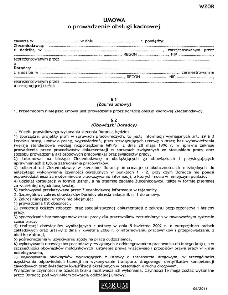 WZÓR UMOWA o prowadzenie obsługi kadrowej zawarta w ………………………..…………. w dniu ……………………….…………… r. pomiędzy: Zleceniodawcą: ……………………………………………………………………………………………………………………………….…………… z siedzibą w ……………………………………………………………………………………………………, zarejestrowanym przez …………………………………………………………………………….……………, REGON ……………….………, NIP ………………………….., reprezentowanym przez ………………………………………………………………………………………………………………………………. a Doradcą: ………………………………………………………………………………………………………………………..…………………………….. z siedzibą w ……………………………………………………………………………………………………………………., zarejestrowanym ……………………………………………………………………………………………., REGON ……………………, NIP ………….……………….., reprezentowanym przez ……………..……………………………………………………………………………………………….………………. o następującej treści: §1 (Zakres umowy) 1. Przedmiotem niniejszej umowy jest prowadzenie przez Doradcę obsługi kadrowej Zleceniodawcy. §2 (Obowiązki Doradcy) 1. W celu prawidłowego wykonania zlecenia Doradca będzie: 1) sporządzał projekty pism w sprawach pracowniczych, to jest: informacji wymaganych art. 29 § 3 kodeksu pracy, umów o pracę, wypowiedzeń, pism rozwiązujących umowę o pracę bez wypowiedzenia (wersja standardowa według rozporządzenia MPiPS z dnia 28 maja 1996 r. w sprawie zakresu prowadzenia przez pracodawców dokumentacji w sprawach związanych ze stosunkiem pracy oraz sposobu prowadzenia akt osobowych pracownika) oraz świadectw pracy, 2) informował na bieŜąco Zleceniodawcę o obciąŜających go obowiązkach i przysługujących uprawnieniach z tytułu zatrudniania pracowników, 3) odbierał od Zleceniodawcy w siedzibie Doradcy informacje o okolicznościach niezbędnych do naleŜytego wykonywania czynności określonych w punktach 1 - 2, przy czym Doradca nie ponosi odpowiedzialności za nieterminowe przekazywanie informacji, o których mowa w niniejszym punkcie, 4) udzielał konsultacji w formie ustnej, a na pisemne Ŝądanie Zleceniodawcy, takŜe w formie pisemnej za wcześniej uzgodnioną kwotę, 5) zachowywał przekazywane przez Zleceniodawcę informacje w tajemnicy. 2. Szczegółowy zakres obowiązków Doradcy określa załącznik nr 1 do umowy. 3. Zakres niniejszej umowy nie obejmuje: 1) prowadzenia list obecności, 2) ewidencji odzieŜy roboczej oraz specjalistycznej dokumentacji z zakresu bezpieczeństwa i higieny pracy, 3) sporządzania harmonogramów czasu pracy dla pracowników zatrudnionych w równowaŜnym systemie czasu pracy, 4) realizacji obowiązków wynikających z ustawy w dnia 5 kwietnia 2002 r. o europejskich radach zakładowych oraz ustawy z dnia 7 kwietnia 2006 r. o informowaniu pracowników i przeprowadzaniu z nimi konsultacji, 5) pośredniczenia w uzyskiwaniu zgody na pracę cudzoziemca, 6) wykonywania obowiązków pracodawcy związanych z oddelegowaniem pracownika do innego kraju, a w szczególności obowiązków meldunkowych, ustalenia prawa właściwego i przepisów prawa pracy w kraju oddelegowania, 7) wykonywania obowiązków wynikających z ustawy o transporcie drogowym, w szczególności uzyskiwania odpowiednich licencji na wykonywanie transportu drogowego, certyfikatów kompetencji zawodowych oraz świadectw kwalifikacji określonych w przepisach o ruchu drogowym. Wyłączenie czynności nie oznacza braku moŜliwości ich wykonania. Czynności te mogą zostać wykonane przez Doradcę pod warunkiem zawarcia oddzielnej umowy. 06/2011 WZÓR 4. Z tytułu sporządzenia i uaktualnienia regulaminów: pracy, wynagradzania, zakładowego funduszu świadczeń socjalnych Doradca zastrzega sobie prawo do oddzielnego wynagrodzenia, określonego odrębnym porozumieniem. §3 (Forma i sposób przekazywania informacji) 1. Zleceniodawca zobowiązuje się do pisemnego przekazywania informacji, potrzebnych do prawidłowego wykonania zlecenia. 2. Za zachowanie formy pisemnej uwaŜa się takŜe wiadomość przesłaną faksem z podpisem osoby upowaŜnionej, nadaną na numer faksu Doradcy …………………………. lub mailem na adres mailowy …………………………………………. 3. Doradca przekazuje Zleceniodawcy pisemne informacje w swojej siedzibie lub poprzez wysłanie faksu na numer Zleceniodawcy ………………………… lub mailem (format pdf) na wskazany przez Zleceniodawcę adres mailowy, tj. ………………….……….. §4 (Obowiązki Zleceniodawcy) 1. W celu umoŜliwienia Doradcy prawidłowego wykonania zlecenia Zleceniodawca zobowiązany jest do: 1) udzielania informacji oraz dostarczania Doradcy wszelkich kompletnych dokumentów stanowiących podstawę wykonywania czynności, o których mowa w § 2. W przypadku dostarczenia dokumentów przez osobę trzecią, osoba ta w sprawach związanych z przedmiotem umowy winna być pisemnie upowaŜniona przez Zleceniodawcę do udzielania wyjaśnień oraz ich podpisywania; 2) niezwłocznego informowania Doradcy, o wszelkich zdarzeniach powodujących zmiany w stanie lub warunkach zatrudnienia, w szczególności o zawarciu, rozwiązaniu lub wygaśnięciu umów o pracę, lub o proponowanych zmianach w regulaminach, 3) stosowania się do wskazówek i zaleceń Doradcy wynikających z jego zobowiązań określonych niniejszą umową. 2. Na treść informacji, któr