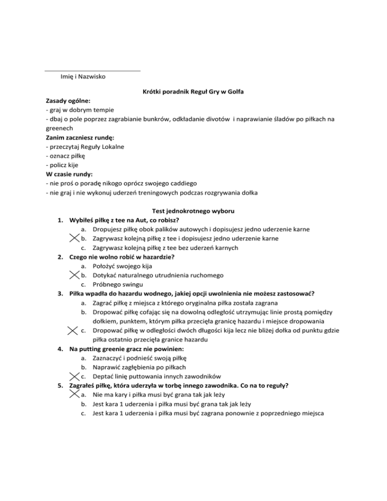 Imię i Nazwisko Krótki poradnik Reguł Gry w Golfa Zasady ogólne: - graj w dobrym tempie - dbaj o pole poprzez zagrabianie bunkrów, odkładanie divotów i naprawianie śladów po piłkach na greenech Zanim zaczniesz rundę: - przeczytaj Reguły Lokalne - oznacz piłkę - policz kije W czasie rundy: - nie proś o poradę nikogo oprócz swojego caddiego - nie graj i nie wykonuj uderzeń treningowych podczas rozgrywania dołka 1. 2. 3. 4. 5. Test jednokrotnego wyboru Wybiłeś piłkę z tee na Aut, co robisz? a. Dropujesz piłkę obok palików autowych i dopisujesz jedno uderzenie karne b. Zagrywasz kolejną piłkę z tee i dopisujesz jedno uderzenie karne c. Zagrywasz kolejną piłkę z tee bez uderzeń karnych Czego nie wolno robić w hazardzie? a. Położyć swojego kija b. Dotykać naturalnego utrudnienia ruchomego c. Próbnego swingu Piłka wpadła do hazardu wodnego, jakiej opcji uwolnienia nie możesz zastosować? a. Zagrać piłkę z miejsca z którego oryginalna piłka została zagrana b. Dropować piłkę cofając się na dowolną odległość utrzymując linie prostą pomiędzy dołkiem, punktem, którym piłka przecięła granicę hazardu i miejsce dropowania c. Dropować piłkę w odległości dwóch długości kija lecz nie bliżej dołka od punktu gdzie piłka ostatnio przecięła granice hazardu Na putting greenie gracz nie powinien: a. Zaznaczyć i podnieść swoją piłkę b. Naprawić zagłębienia po piłkach c. Deptać linię puttowania innych zawodników Zagrałeś piłkę, która uderzyła w torbę innego zawodnika. Co na to reguły? a. Nie ma kary i piłka musi być grana tak jak leży b. Jest kara 1 uderzenia i piłka musi być grana tak jak leży c. Jest kara 1 uderzenia i piłka musi być zagrana ponownie z poprzedniego miejsca