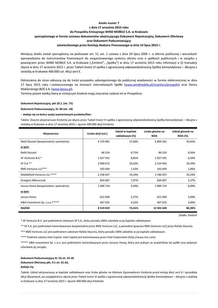 Aneks numer 7 z dnia 17 września 2015 roku do Prospektu Emisyjnego WIND MOBILE S.A. w Krakowie sporządzonego w formie zestawu dokumentów obejmującego Dokument Rejestracyjny, Dokument Ofertowy oraz Dokument Podsumowujący zatwierdzonego przez Komisję Nadzoru Finansowego w dniu 14 lipca 2015 r. Niniejszy Aneks został sporządzony na podstawie art. 51 ust. 1 ustawy z dnia 29 lipca 2005 r. o ofercie publicznej i warunkach wprowadzania do instrumentów finansowych do zorganizowanego systemu obrotu oraz o spółkach publicznych i w związku z powzięciem przez WIND MOBILE S.A. w Krakowie („Emitent”, „Spółka”) w dniu 17 września 2015 roku informacji o (i) transakcji zbycia w dniu 17 września 2015 r. przez Tadwil Invest VI spółka z ograniczoną odpowiedzialnością Spółka Komandytowo – Akcyjna z siedzibą w Krakowie 400.000 szt. Akcji serii E. Odniesienia do stron odnoszą się do treści prospektu udostępnionego do publicznej wiadomości w formie elektronicznej w dniu 17 lipca 2015 roku i zamieszczonego na stronach internetowych Spółki (www.windmobile.pl/investors/prospekt) oraz Domu Maklerskiego BOŚ S.A. (www.bossa.pl). Terminy pisane wielką literą w niniejszym Aneksie mają znaczenie nadane im w Prospekcie. Dokument Rejestracyjny, pkt 18.1. (str. 75) Dokument Podsumowujący, lit. B6 (str. 10) - dodaje się na końcu wyżej wymienionych punktów/liter: Tabela: Znaczni akcjonariusze Emitenta po zbyciu przez Tadwil Invest VI spółka z ograniczoną odpowiedzialnością Spółka Komandytowo – Akcyjna z siedzibą w Krakowie w dniu 17 września 2015 r. łącznie 400.000 akcji Emitenta Akcjonariusz Rafał Styczeń (bezpośrednio i pośrednio): Liczba akcji (szt.) Udział w kapitale zakładowym (%) Liczba głosów na WZA Udział głosach na WZA (%) 4 370 481 37,66% 6 804 301 43,65% 86 524 0,75% 86 524 0,56% IIF Ventures B.V.* 1 027 591 8,85% 1 027 591 6,59% IIF S.A.** 3 090 672 26,63% 5 524 492 35,44% 165 694 1,43% 165 694 1,06% 2 238 927 19,29% 3 786 937 24,29% 820 687 7,07% 820 687 5,27% 1 089 724 9,39% 1 089 724 6,99% 622 699 5,37% 622 699 3,99% w tym: Rafał Styczeń RMS Ventures LLC*** Middlefield Ventures Inc.**** Grzegorz Młynarczyk Janusz Homa (bezpośrednio i pośrednio): w tym: Janusz Homa H&H Investment Sp. z o.o.***** RAZEM 467 025 4,02% 467 025 3,00% 8 519 819 73,41% 12 501 649 80,20% Źródło: Emitent * IIF Ventures B.V. jest podmiotem zależnym IIF S.A., który posiada 100% udziałów w jej kapitale zakładowym. ** IIF S.A. jest podmiotem kontrolowanym bezpośrednio przez RMS Ventures LLC, a pośrednio (poprzez RMS Ventures LLC) przez Rafała Stycznia. *** RMS Ventures LLC jest podmiotem zależnym Rafała Stycznia, który posiada 100% udziałów w jej kapitale zakładowym. **** Podmiot zależny Intel Capital. Intel Capital jest kontrolowany przez Intel Corporation (http://www.intc.com). ***** H&H Investment Sp. z o.o. jest podmiotem kontrolowanym przez Janusza Homę, który jest jednym ze wspólników tej spółki oraz jedynym członkiem jej zarządu. Dokument Podsumowujący lit. E6 str. 25-26 Dokument Ofertowy pkt. 9.1 str. 61-62, dodaje się: Tabela: Udział akcjonariuszy w kapitale zakładowym oraz liczba głosów na Walnym Zgromadzeniu Emitenta przed emisją Akcji serii K i sprzedażą Akcji Zbywanych, po uwzględnieniu zbycia przez Tadwil Invest VI spółka z ograniczoną odpowiedzialnością Spółka Komandytowo – Akcyjna z siedzibą w Krakowie w dniu 17 września 2015 r. łącznie 400.000 akcji Emitenta Aneks nr 7 – Prospekt emisyjny WIND MOBILE SA Akcjonariusz Rafał Styczeń (bezpośrednio i pośrednio), w tym: Liczba akcji (szt.) Udział w kapitale zakładowym (%) Liczba głosów na WZA Udział głosach na WZA (%) 4 370 481 37,66% 6 804 301 43,65% 86 524 0,75% 86 524 0,56% IIF Ventures B.V.* 1 027 591 8,85% 1 027 591 6,59% IIF S.A.** 3 090 672 26,63% 5 524 492 35,44% 165 694 1,43% 165 694 1,06% 2 238 927 19,29% 3 786 937 24,29% 820 687 7,07% 820 687 5,27% 1 089 724 9,39% 1 089 724 6,99% 622 699 5,37% 622 699 3,99% Rafał Styczeń RMS Ventures LLC*** Middlefield Ventures Inc.**** Grzegorz Młynarczyk Janusz Homa (bezpośrednio i pośrednio), w tym: Janusz Homa H&H Investment Sp. z o.o.***** Pozostali akcjonariusze RAZEM 467 025 4,02% 467 025 3,00% 3 085 685 26,58% 3 085 685 19,79% 11 605 504 100,00% 15 587 334 100,00% Źródło: Emitent * IIF Ventures B.V. jest podmiotem zależnym IIF S.A., który posiada 100% udziałów w jej kapitale zakładowym. ** IIF S.A. jest podmiotem kontrolowanym bezpośrednio przez RMS Ventures LLC, a pośrednio (poprzez RMS Ventures LLC) przez Rafała Stycznia. *** RMS Ventures LLC jest podmiotem zależnym Rafała Stycznia, który posiada 100% udziałów w jej kapitale zakładowym. **** Podmiot zależny Intel Capital. Intel Capital jest kontrolowany przez Intel Corporation (http://www.intc.com). ***** H&H Investment Sp. z o.o. jest podmiotem kontrolowanym przez Janusza Homę, który jest jednym ze wspólników tej spółki oraz jedynym członkiem jej zarządu. (…) Tabela: Rozwodnienie w wyniku Oferty Publicznej, po uwzględnieniu zbycia przez Tadwil Invest VI spółka z ograniczoną odpowiedzialnością Spółka Komandytowo – Akcyjna z siedzibą w Krakowie w dniu 17 września 2015 r. łącznie 400.000 akcji Emitenta Akcjonariusz Rafał Styczeń (bezpośrednio i pośrednio), w tym: Liczba akcji (szt.) Udział w kapitale zakładowym (%) Liczba głosów na WZA Udział głosach na WZA (%) 4 120 481 33,35% 6 554 301 40,12% 86 524 0,70% 86 524 0,53% IIF Ventures B.V.* 1 027 591 8,32% 1 027 591 6,29% IIF S.A.** 2 840 672 22,99% 5 274 492 32,28% 165 694 1,34% 165 694 1,01% 2 238 927 18,12% 3 786 937 23,18% Grzegorz Młynarczyk 700 687 5,67% 700 687 4,29% Janusz Homa (bezpośrednio i pośrednio), w tym: 839 724 6,80% 839 724 5,14% Janusz Homa 592 699 4,80% 592 699 3,63% Rafał Styczeń RMS Ventures LLC*** Middlefield Ventures Inc.**** H&H Investment Sp. z o.o.***** Pozostali akcjonariusze RAZEM 247 025 2,00% 247 025 