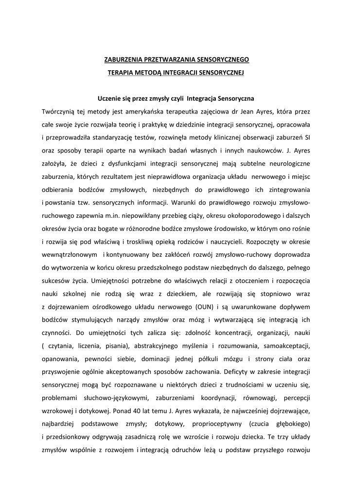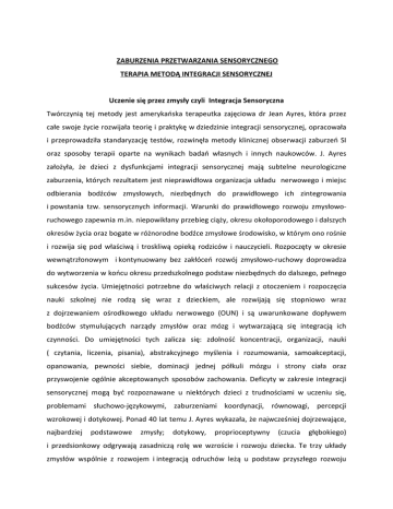 ZABURZENIA PRZETWARZANIA SENSORYCZNEGO TERAPIA METODĄ INTEGRACJI SENSORYCZNEJ Uczenie się przez zmysły czyli Integracja Sensoryczna Twórczynią tej metody jest amerykańska terapeutka zajęciowa dr Jean Ayres, która przez całe swoje życie rozwijała teorię i praktykę w dziedzinie integracji sensorycznej, opracowała i przeprowadziła standaryzację testów, rozwinęła metody klinicznej obserwacji zaburzeń SI oraz sposoby terapii oparte na wynikach badań własnych i innych naukowców. J. Ayres założyła, że dzieci z dysfunkcjami integracji sensorycznej mają subtelne neurologiczne zaburzenia, których rezultatem jest nieprawidłowa organizacja układu nerwowego i miejsc odbierania bodźców zmysłowych, niezbędnych do prawidłowego ich zintegrowania i powstania tzw. sensorycznych informacji. Warunki do prawidłowego rozwoju zmysłoworuchowego zapewnia m.in. niepowikłany przebieg ciąży, okresu okołoporodowego i dalszych okresów życia oraz bogate w różnorodne bodźce zmysłowe środowisko, w którym ono rośnie i rozwija się pod właściwą i troskliwą opieką rodziców i nauczycieli. Rozpoczęty w okresie wewnątrzłonowym i kontynuowany bez zakłóceń rozwój zmysłowo-ruchowy doprowadza do wytworzenia w końcu okresu przedszkolnego podstaw niezbędnych do dalszego, pełnego sukcesów życia. Umiejętności potrzebne do właściwych relacji z otoczeniem i rozpoczęcia nauki szkolnej nie rodzą się wraz z dzieckiem, ale rozwijają się stopniowo wraz z dojrzewaniem ośrodkowego układu nerwowego (OUN) i są uwarunkowane dopływem bodźców stymulujących narządy zmysłów oraz mózg i wytwarzającą się integracją ich czynności. Do umiejętności tych zalicza się: zdolność koncentracji, organizacji, nauki ( czytania, liczenia, pisania), abstrakcyjnego myślenia i rozumowania, samoakceptacji, opanowania, pewności siebie, dominacji jednej półkuli mózgu i strony ciała oraz przyswojenie ogólnie akceptowanych sposobów zachowania. Deficyty w zakresie integracji sensorycznej mogą być rozpoznawane u niektórych dzieci z trudnościami w uczeniu się, problemami słuchowo-językowymi, zaburzeniami koordynacji, równowagi, percepcji wzrokowej i dotykowej. Ponad 40 lat temu J. Ayres wykazała, że najwcześniej dojrzewające, najbardziej podstawowe zmysły; dotykowy, proprioceptywny (czucia głębokiego) i przedsionkowy odgrywają zasadniczą rolę we wzroście i rozwoju dziecka. Te trzy układy zmysłów wspólnie z rozwojem i integracją odruchów leżą u podstaw przyszłego rozwoju dziecka. Są one gotowe do funkcjonowania jeszcze przed urodzeniem w okresie prenatalnym, ale doskonalą się w ciągu pierwszych lat życia wraz z rozwojem ośrodkowego układu nerwowego. Metoda terapii integracji sensorycznej kierowana jest w pierwszej kolejności do dzieci z trudnościami w uczeniu się, ale jest również stosowana jako metoda komplementarna w usprawnianiu dzieci z mózgowym porażeniem dziecięcym, upośledzonych umysłowo, autystycznych, zespołem Aspergera, FAS, kruchego chromosomu X , nadpobudliwością psychoruchową i niewidomych. Terapia i teoria integracji sensorycznej może być wykorzystywana również w działalności profilaktycznej. Stymulując prawidłowy rozwój dzieci już od wieku niemowlęcego, szczególnie w przypadku tzw. grupy ryzyka okołoporodowego, zapobiegamy późniejszym nieprawidłowościom rozwojowym. Diagnoza Podstawą do prowadzenia terapii jest przeprowadzenie diagnozy na którą składają się: Wywiad Obserwacja Kliniczna Południowo-Kalifornijskie Testy Integracji Sensorycznej (SCSIT) Testy Praksji (SIPT) 1. Deficyty integracji sensorycznej występujące u dzieci z trudnościami w uczeniu się obejmują zaburzenia w rejestracji i przetwarzaniu bodźców głównie w obrębie trzech podstawowych układów sensorycznych: przedsionkowego, proprioceptywnego i dotykowego. Deficyty te przejawiają się dysfunkcjami w zakresie: reakcji posturalnych (obronnych, równoważnych i posturalnych w tle), funkcji okoruchowych, napięcia mięśniowego, schematu ciała, trudności w planowaniu ruchu, dysfunkcji w obustronnej koordynacji ruchowej i sekwencyjności. Zaburzenia te skutkują trudnościami w nauce czytania, obniżonym poziomem graficznym, błędami podczas pisania polegającymi na zamianie liter podobnych ale ułożonych inaczej w przestrzeni (b-d ; p-b; itp.), kłopotami w różnicowaniu prawo lewo i słabej obustronnej koordynacji ruchowej. Tym typowym trudnościom towarzyszą również często zaburzenia emocjonalne, trudności w koncentracji uwagi i nadpobudliwość psychoruchowa. 2. U dzieci z MPDZ mamy do czynienia z różnymi typami zaburzeń integracji sensorycznej. - Zaburzenia w zakresie przetwarzania bodźców dotykowych: w zależności od postaci MPDZ występują zakłócenia integracji somatosensorycznej oraz modulacji bodźców dotykowych, przyczyniające się do nieprawidłowego rozwoju schematu ciała, planowania motorycznego i obronności dotykowej - Zaburzenia w zakresie przetwarzania bodźców przedsionkowo-proprioceptywnych: w zależności od postaci MPDZ występują dysfunkcje przedsionkowo- proprioceptywne. Zaburzenia te powodują słabą percepcję pozycji ciała w przestrzeni, słabą percepcję ruchu w przestrzeni, niebezpieczeństwo grawitacyjne, nietolerancję ruchu, wpływają pośrednio na percepcję słuchową, wzrokową i funkcje mowy. - Zaburzenia rejestracji i modulacji bodźców sensorycznych: powodują trudności w możliwościach organizacji zachowania, wpływają na poziom pobudzenia i koncentracji dzieci z MPDZ. 3. Badania procesów sensorycznych u dzieci autystycznych wskazują na nieprawidłowe reakcje tych dzieci na bodźce wzrokowe, przedsionkowe i słuchowe. Ayers opisała dwa typy dysfunkcji integracji sensorycznej u dzieci autystycznych: - Zaburzenia rejestracji bodźców sensorycznych: dotyczące przede wszystkim bodźców wzrokowych i słuchowych, ale czasem również węchowych, s