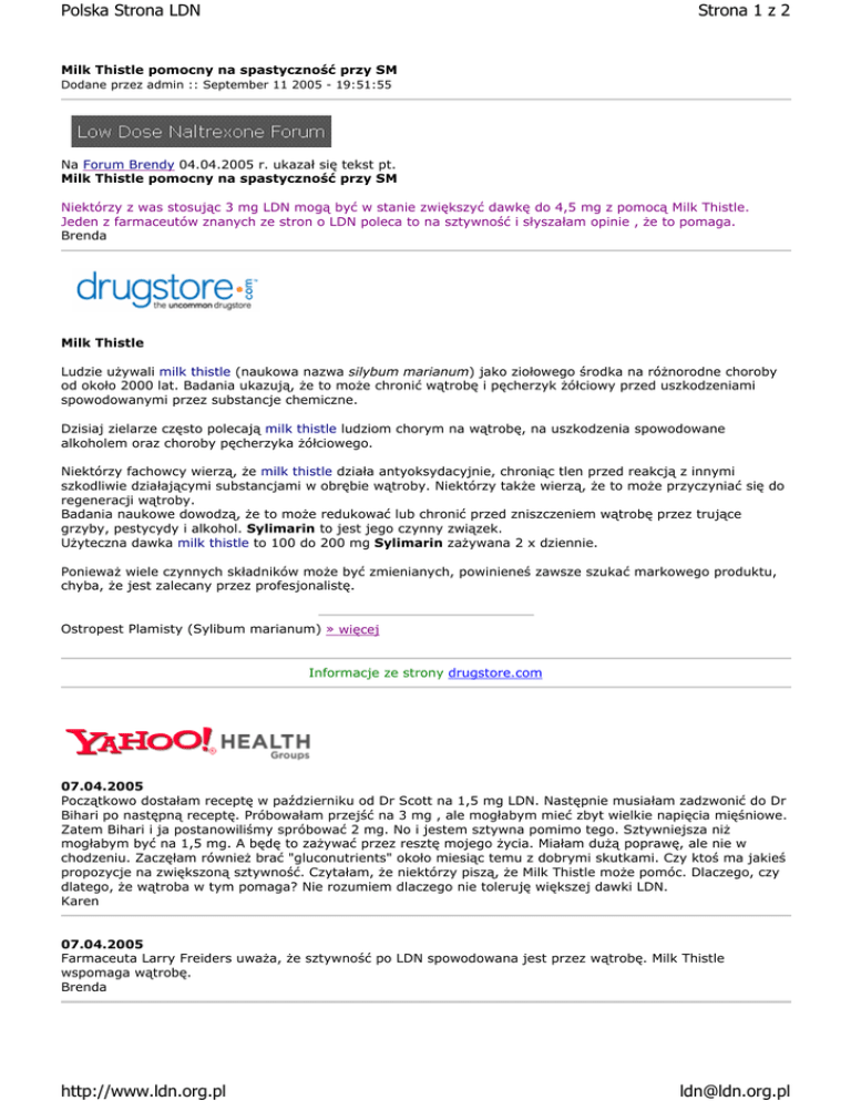 Polska Strona LDN Strona 1 z 2 Milk Thistle pomocny na spastyczność przy SM Dodane przez admin :: September 11 2005 - 19:51:55 Na Forum Brendy 04.04.2005 r. ukazał się tekst pt. Milk Thistle pomocny na spastyczność przy SM Niektórzy z was stosując 3 mg LDN mogą być w stanie zwiększyć dawkę do 4,5 mg z pomocą Milk Thistle. Jeden z farmaceutów znanych ze stron o LDN poleca to na sztywność i słyszałam opinie , że to pomaga. Brenda Milk Thistle Ludzie używali milk thistle (naukowa nazwa silybum marianum) jako ziołowego środka na różnorodne choroby od około 2000 lat. Badania ukazują, że to może chronić wątrobę i pęcherzyk żółciowy przed uszkodzeniami spowodowanymi przez substancje chemiczne. Dzisiaj zielarze często polecają milk thistle ludziom chorym na wątrobę, na uszkodzenia spowodowane alkoholem oraz choroby pęcherzyka żółciowego. Niektórzy fachowcy wierzą, że milk thistle działa antyoksydacyjnie, chroniąc tlen przed reakcją z innymi szkodliwie działającymi substancjami w obrębie wątroby. Niektórzy także wierzą, że to może przyczyniać się do regeneracji wątroby. Badania naukowe dowodzą, że to może redukować lub chronić przed zniszczeniem wątrobę przez trujące grzyby, pestycydy i alkohol. Sylimarin to jest jego czynny związek. Użyteczna dawka milk thistle to 100 do 200 mg Sylimarin zażywana 2 x dziennie. Ponieważ wiele czynnych składników może być zmienianych, powinieneś zawsze szukać markowego produktu, chyba, że jest zalecany przez profesjonalistę. Ostropest Plamisty (Sylibum marianum) » więcej Informacje ze strony drugstore.com 07.04.2005 Początkowo dostałam receptę w październiku od Dr Scott na 1,5 mg LDN. Następnie musiałam zadzwonić do Dr Bihari po następną receptę. Próbowałam przejść na 3 mg , ale mogłabym mieć zbyt wielkie napięcia mięśniowe. Zatem Bihari i ja postanowiliśmy spróbować 2 mg. No i jestem sztywna pomimo tego. Sztywniejsza niż mogłabym być na 1,5 mg. A będę to zażywać przez resztę mojego życia. Miałam dużą poprawę, ale nie w chodzeniu. Zaczęłam również brać "gluconutrients" około miesiąc temu z dobrymi skutkami. Czy ktoś ma jakieś propozycje na zwiększoną sztywność. Czytałam, że niektórzy piszą, że Milk Thistle może pomóc. Dlaczego, czy dlatego, że wątroba w tym pomaga? Nie rozumiem dlaczego nie toleruję większej dawki LDN. Karen 07.04.2005 Farmaceuta Larry Freiders uważa, że sztywność po LDN spowodowana jest przez wątrobę. Milk Thistle wspomaga wątrobę. Brenda http://www.ldn.org.pl [email protected] Polska Strona LDN Strona 2 z 2 07.04.2005 Jeżeli Larry ma rację i spastyczność pojawia się w związku z zatruciem watroby to może dokładne oczyszczenie okrężnicy mogłoby pomóc Karen, dużo wody z limonką, herbata z mniszkiem, kwas liponowy. To są najlepsze płyny oczyszczające , a kwas liponowy jest podawany pacjentom z wirusowym zapaleniem wątroby typu C i zwykle poprawia funkcjonowanie wątroby testowane w ciągu 6 tygodni przy zastosowaniu dawki 600 mg dziennie. Czasami, kiedy narząd jest zupełnie zatruty, zioła takie jak Milk Thistle są dobrym sposobem, aby pobudzić organizm do działania. Karen, mam nadzieję, że ci pomogłam. Kathy 09.04.2005 Czy ktoś z was utrzymał poprawę na LDN. Ja jestem porażona skurczami pomimo 1,5 mg , ale miałam inne znaczące polepszenia w czasie zażywania LDN. Chcę chodzić samodzielnie, ale od kiedy zażywam LDN potrzebuję dwóch kuli zamiast jednej z powodu spastyczności. Aktualnie próbuję wspomóc wątrobę „combo”, które myślę, że jest zbyt silne ponieważ jestem niezmiernie zmęczona. Karen 09.04.2005 Czy próbowałaś Milk Thistle lub czegoś podobnego? Weź Milk Thistle i 3 mg LDN. Weź Milk Thistle znowu następnego ranka i znowu około 15.00. Nie używaj „combo”. Użyj tylko zwyczajnego Milk Thistle. Brenda 10.04.2005 1,5 mg nic nie robi z SM. Zwiększ dawkę na nie mniej niż 3 mg. Postęp choroby nie zatrzyma się jeśli dawki będą mniejsze niż 3 mg a czasem wymaga się 4,5 mg. Weź Milk Thistle ze sklepu ze zdrową żywnością, ale unikaj podobnych połączeń z innymi suplementami tylko sam Milk Thistle. Daj mężowi 1 kapsułkę Milk Thistle z jego nocną dawką LDN i może 1 kapsułkę w ciągu dnia. To pomoże przeciwdziałać spastyczności pojawiającej się wraz ze zwiększeniem dawki LDN. Brenda 11.04.2005 Dziękujemy Brendo, spróbujemy. Próbowaliśmy zwiększyć na 3 mg , ale po tym mąż nie mógł pracować. Więc wróciliśmy na 1,5 mg. Eksperymentujemy z LDN samodzielnie, bez wsparcia lekarza, więc próbujemy postępować zgodnie z informacjami jakie tu są przedstawiane. Jedyną rzeczą jaką chcą lekarze dla męża to aby zażywał copaxone przez resztę swojego życia. Dlaczego uważasz, że 1,5 mg nie działa? TFF 11.04.2005 Zmęczenie występuje prawdopodobnie tylko kilka dni dopóki organizm nie dostosuje się do wyższej dawki. Spróbujcie zwiększyć dawkę kiedy mąż nie będzie w pracy, w czasie wolnych dni. Spróbujcie 2 mg przez tydzień, potem 2,5mg przez tydzień i potem 3 mg. Używajcie Milk thistle, a jeśli mąż będzie miał zaburzenia snu użyjcie melatoniny ze sklepu ze zdrową żywnością. W mojej rozmowie dr Bihari powiedział, że u ludzi z SM dawki poniżej 3 mg w większości mogą nie zatrzymać postępu choroby. Ja jestem na LDN w związku z SM, a moja mama z powodu raka piersi. Brenda 17.04.2005 Witam wszystkich, Zaczęłam brać Milk Thistle pomagające na spastyczność. To pomaga, nie wyleczy całkowicie ale zdecydowanie warto go zażywać. Teraz jeszcze muszę zwiększyć dawkę do 2 mg. Mimo, że kiedy próbowałam rozmawiać z Dr Scott, powiedział mi aby pozostać przy 1,5 mg jeśli to działało. Karen P.S. Jestem na 1,5 mg od października i nie mam postępu choroby. Tłumaczenie Beata Janik http://www.ldn.org.pl [email protected]