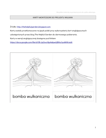 Wszystkie materiały są przeznaczone do użytku własnego. KARTY MONTESSORI DO PROJEKTU WULKAN Źródło: http://thehelpfulgarden.blogspot.com Karty zostały przetłumaczone na język polski przy wykorzystaniu kart anglojęzycznych udostępnionych przez blog The Helpful Garden do darmowego pobierania. Karty w wersji anglojęzycznej dostępne pod linkiem https://docs.google.com/file/d/0B-Jp2xvcHjp4elpwUjBHa1poMVk/edit 1 Wszystkie materiały są przeznaczone do użytku własnego. 2 Wszystkie materiały są przeznaczone do użytku własnego. 3 Wszystkie materiały są przeznaczone do użytku własnego. 4 Wszystkie materiały są przeznaczone do użytku własnego. 5 Wszystkie materiały są przeznaczone do użytku własnego. 6