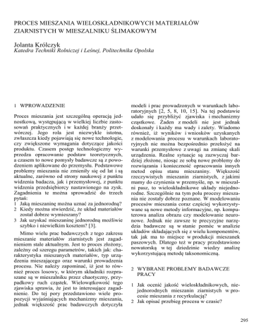PROCES MIESZANIA WIELOSKŁADNIKOWYCH MATERIAŁÓW ZIARNISTYCH W MIESZALNIKU ŚLIMAKOWYM Jolanta Królczyk Katedra Techniki Rolniczej i Leśnej, Politechnika Opolska 1 WPROWADZENIE Proces mieszania jest szczególną operacją jednostkową, występującą w wielkiej liczbie zastosowań praktycznych i w każdej branży przetwórczej. Jego rola jest niezwykle istotna, zwłaszcza kiedy pojawiają się nowe technologie, czy zwiększone wymagania dotyczące jakości produktu. Czasem postęp technologiczny wyprzedza opracowanie podstaw teoretycznych, a czasem to nowe pomysły badawcze są z powodzeniem aplikowane do przemysłu. Podstawowe problemy mieszania nie zmieniły się od lat i są aktualne, zarówno od strony naukowej z punktu widzenia badacza, jak i przemysłowej, z punktu widzenia przedsiębiorcy nastawionego na zysk. Zagadnienia te można sprowadzić do trzech pytań: 1 Jaką mieszaninę można uznać za jednorodną? 2 Kiedy można stwierdzić, że układ materiałów został dobrze wymieszany? 3 Jak uzyskać mieszaninę jednorodną możliwie szybko i niewielkim kosztem? [3]. Mimo wielu prac badawczych z tego zakresu mieszanie materiałów ziarnistych jest zagadnieniem stale aktualnym. Jest to proces złożony, zależny od szeregu parametrów, takich jak: charakterystyka mieszanych materiałów, typ urządzenia mieszającego oraz warunki prowadzenia procesu. Nie należy zapominać, iż jest to również proces losowy, w którym składniki rozpraszane są w mieszalniku przez chaotyczny, przypadkowy ruch cząstek. Wielowątkowość tego zjawiska sprawia, że jest to interesujące zagadnienie. Do tej pory przedstawiono wiele propozycji wyjaśniających mechanizmy mieszania, jednak większość prac badawczych dotyczyła modeli i prac prowadzonych w warunkach laboratoryjnych [2, 5, 8, 10, 15]. Na tej podstawie udało się przybliżyć zjawiska i mechanizmy cząstkowe. Żaden z modeli nie jest jednak doskonały i każdy ma wady i zalety. Wiadomo również, iż wyników i wniosków uzyskanych z modelowania procesu w warunkach laboratoryjnych nie można bezpośrednio przełożyć na warunki przemysłowe z uwagi na zmianę skali urządzenia. Realne sytuacje są zazwyczaj bardziej złożone, niosąc ze sobą nowe problemy do rozwiązania i konieczność opracowania innych metod opisu stanu mieszaniny. Większość rzeczywistych mieszanin ziarnistych, z jakimi mamy do czynienia w przemyśle, np. w mieszalni pasz, to wieloskładnikowe układy niejednorodne. Szczególnie na tym polu procesy mieszania nie zostały dobrze poznane. W modelowaniu procesów mieszania coraz częściej wykorzystywane są nowe metody informacyjne, np. komputerowa analiza obrazu czy modelowanie neuronowe. Jednak nie zawsze te precyzyjne narzędzia badawcze są w stanie pomóc w analizie układów składających się z wielu komponentów, tak jak ma to miejsce w produkcji mieszanek paszowych. Dlatego też w pracy przedstawiono nowatorską w tej dziedzinie wiedzy analizę wykorzystującą metodę taksonomiczną. 2 WYBRANE PROBLEMY BADAWCZE PRACY 1 Jak ocenić jakość wieloskładnikowych, nie- jednorodnych mieszanin ziarnistych w procesie mieszania z recyrkulacją? 2 Jak opisać przebieg procesu w czasie? 295 Proces mieszania wieloskładnikowych materiałów ziarnistych w mieszalniku ślimakowym 3 Czy można uzyskać mieszaninę zgodną ze wzorcem (składem zakładanym przez producenta)? 4 Jak długo prowadzić proces mieszania? 5 Czy można skrócić czas mieszania, aby uzyskać rozkład częstości badanych komponentów zgodny ze wzorcem? 3 CEL I ZAKRES PRACY Analiza aktualnego, dość ubogiego stanu wiedzy, wynikającego z niewielkiej liczby publikacji dotyczących opisu mieszania wieloskładnikowych, niejednorodnych mieszanin ziarnistych, skłoniła autorkę do podjęcia własnych badań eksperymentalnych, mających na celu poszerzenie wiedzy z tego zakresu. Dodatkowym aspektem prowadzonych badań była recyrkulacja składników, odbywająca się w trakcie procesu mieszania oraz prowadzenie procesu w warunkach przemysłowych. Zestawienie braków wiedzy, zaprezentowanych w problemach badawczych, skłoniło do poszukiwania nowych sposobów opisu procesu mieszania niejednorodnych, wieloskładnikowych mieszanin ziarnistych w urządzeniu z mieszadłem ślimakowym. Dodatkowym uzasadnieniem do podjęcia badań własnych jest brak metod obliczeniowych pozwalających na opisanie przebiegu tego procesu i stanu mieszanin materiałów ziarnistych podczas prowadzenia procesu z recyrkulacją składników. intensywności badanego zjawiska w oparciu o metody statystyczne pozwalające na bezwymiarowy opis poszczególnych faz mieszania, jeżeli takie można by zaobserwować. 4 METODYKA BADAŃ Badania eksperymentalne prowadzono w warunkach przemysłowych w mieszalni pasz Ovigor®. Do badań wykorzystano mieszalnik o działaniu okresowym z komorą nieruchomą i pionowym mieszadłem ślimakowym (rys. 1, tab. 1). Moc mieszadła wynosiła 5,5 kW. Prędkość mieszania była stała. Hipoteza pracy: Czas mieszania może być krótszy niż czas zalecony przez producenta mieszalnika (30 minut), przy jednoczesnym zachowaniu rozkładu częstości badanych ziaren zgodnego ze wzorcem wymaganym składem mieszanki pasz. Cel pracy: Celem pracy było zbadanie działania mieszalnika stosowanego do mieszania układów wieloskładnikowych, pracującego w warunkach przemysłowych. Przyczyną podjęcia się badań było zapytanie dotyczące możliwości poprawy ekonomiki procesu (skrócenie czasu mieszania z uwagi na konieczność zwiększenia produkcji). Podjęto próbę opisu procesu mieszania w oparciu o dyskretną analizę składu dla trzech wybranych mieszanek w odstępach 30 sekundowych w 30 minutowym przedziale czasu mieszania. Intencją pracy była ponadto próba opisu 296 www.statsoft.pl/czytelnia.html Rys. 1. Schemat mieszalnika pasz wykorzystanego do badań – mieszalnik o działaniu okresowym z komorą nieruchomą z pionowym mieszadłem ślimakow