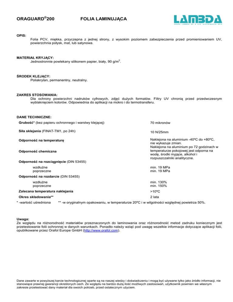 ORAGUARD®200 FOLIA LAMINUJĄCA OPIS: Folia PCV, miękka, przyczepna z jednej strony, z wysokim poziomem zabezpieczenia przed promieniowaniem UV, powierzchnia połysk, mat, lub satynowa. MATERIAŁ KRYJĄCY: 2 Jednostronnie powlekany silikonem papier, biały, 90 g/m . ŚRODEK KLEJĄCY: Poliakrylan, permanentny, neutralny. ZAKRES STOSOWANIA: Dla ochrony powierzchni nadruków cyfrowych, zdjęć duŜych formatów. Filtry UV chronią przed przedwczesnym wyblaknięciem kolorów. Odpowiednia do aplikacji na mokro i do termotransferu. DANE TECHNICZNE: Grubość* (bez papieru ochronnego i warstwy klejącej) 70 mikronów Siła sklejania (FINAT-TM1, po 24h) 10 N/25mm Odporność na temperaturę Naklejona na aluminium -40ºC do +80ºC, nie wykazuje zmian. Naklejona na aluminium po 72 godzinach w temperaturze pokojowej jest odporna na wodę, środki myjące, alkohol i rozpuszczalniki analityczne. Odporność chemiczna Odporność na rozciągnięcie (DIN 53455) wzdłuŜne poprzeczne min. 19 MPa min. 19 MPa Odporność na rozdarcie (DIN 53455) wzdłuŜne poprzeczne min. 130% min. 150% Zalecana temperatura naklejania >10ºC Okres składowania** 2 lata * -wartość uśredniona ** -w oryginalnym opakowaniu, w temperaturze 20ºC i w wilgotności względnej powietrza 50%. Uwaga: Ze względu na róŜnorodność materiałów przeznaczonych do laminowania oraz róŜnorodność metod zadruku koniecznym jest przetestowanie folii ochronnej w danych warunkach. Ponadto naleŜy wziąć pod uwagę wszelkie informacje dotyczące aplikacji folii, opublikowane przez Orafol Europe GmbH (http://www.orafol.com). Dane zawarte w powyŜszej karcie technologicznej oparte są na naszej wiedzy i doświadczeniu i mogą być uŜywane tylko jako źródło informacji, nie stanowiące prawnej gwarancji określonych cech. Ze względu na bardzo duŜą ilość moŜliwych zastosowań, uŜytkownik powinien we własnym zakresie przetestować dany materiał dla swoich potrzeb, przed ostatecznym uŜyciem.