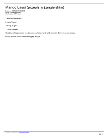 Mango Lassi (przepis w j.angielskim) Dodano: 2000-01-01 00:00:00 Język: English/Angielski Odwiedzono: 1320 razy. 2 Ripe Mango Pulps 2 cups Yogurt 1/2 cup Sugar 1 cup Ice Water Combine all ingredients in a blender and blend until fairly smooth. Serve in a sour glass. From: Robert Wierzbicki <[email protected]> Wirtualna Kuchni@ Polska - http://kuchnia.now.pl przepis nr 3691, plik wygenerowano 2017.03.02 23:28 1z1