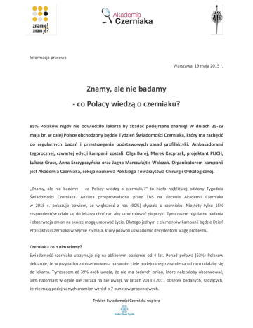 Informacja prasowa Warszawa, 19 maja 2015 r. Znamy, ale nie badamy - co Polacy wiedzą o czerniaku? 85% Polaków nigdy nie odwiedziło lekarza by zbadać podejrzane znamię! W dniach 25-29 maja br. w całej Polsce obchodzony będzie Tydzień Świadomości Czerniaka, który ma zachęcić do regularnych badań i przestrzegania podstawowych zasad profilaktyki. Ambasadorami tegorocznej, czwartej edycji kampanii zostali: Olga Barej, Marek Kacprzak, projektant PLICH, Łukasz Grass, Anna Szczypczyńska oraz Jagna Marczułajtis-Walczak. Organizatorem kampanii jest Akademia Czerniaka, sekcja naukowa Polskiego Towarzystwa Chirurgii Onkologicznej. „Znamy, ale nie badamy – co Polacy wiedzą o czerniaku?” to hasło najbliższej odsłony Tygodnia Świadomości Czerniaka. Ankieta przeprowadzona przez TNS na zlecenie Akademii Czerniaka w 2015 r. pokazuje bowiem, że większość z nas (90%) słyszała o czerniaku. Niestety tylko 15% respondentów udało się do lekarza choć raz, aby skontrolować pieprzyki. Tymczasem regularne badania i obserwacja zmian na skórze mogą uratować życie. Dlatego jednym z elementów kampanii będzie Dzień Profilaktyki Czerniaka w Sejmie 26 maja, który pozwoli uświadomić decydentom wagę problemu. Czerniak – co o nim wiemy? Świadomość czerniaka utrzymuje się na zbliżonym poziomie od 4 lat. Ponad połowa (63%) Polaków deklaruje, że w przypadku zaobserwowania na swoim ciele podejrzanego znamienia od razu udałaby się do lekarza. Tymczasem aż 39% osób uważa, że nie ma żadnych zmian, które należałoby obserwować, 14% natomiast w ogóle nie zwraca na nie uwagi. W latach 2013 i 2011 odsetek badanych, sądzących, że nie mają podejrzanych znamion wzrósł o 7 punktów procentowych. Tydzień Świadomości Czerniaka wspiera Polacy rzadziej prowadzą też samoobserwację skóry. W porównaniu z poprzednimi pomiarami wzrósł udział osób, które wykonują tę czynność raz na 2-3 miesiące lub rzadziej - 39% w stosunku do 34% w 2013 r. i 36% w 2011 r. Czerniak to jeden z najbardziej agresywnych nowotworów skóry. Wczesne wykrycie pozwala jednak na całkowite wyleczenie aż w 90% przypadków. Dlatego poprzez czwartą edycję Tygodnia Świadomości Czerniaka chcemy nauczyć Polaków jak prawidłowo badać skórę oraz jak ważna jest profilaktyka – mówi prof. Piotr Rutkowski, Kierownik Kliniki Nowotworów Tkanek Miękkich, Kości i Czerniaków Centrum Onkologii – Instytut im. Marii Skłodowskiej-Curie w Warszawie, przewodniczący Rady Naukowej Akademii Czerniaka. Co zwiększa ryzyko zachorowania? Respondenci potrafili prawidłowo wskazać trzy czynniki ryzyka - najczęściej wymienianymi w 2015 r. są korzystanie z solarium (37%), przebywanie na słońcu (36%) i skłonności genetyczne (25%). Jednak 17% badanych decydowało się na odpowiedź nie wiem, trudno powiedzieć. Pamiętajmy, że aby zmniejszyć ryzyko zachorowania wystarczy stosować kilka prostych zasad: • Raz w miesiącu dokładnie oglądaj swoją skórę – sprawdź, czy Twoje znamiona nie zmieniają się lub czy nie pojawiły się nowe • Jeśli zauważysz, że coś podejrzanego dzieje się z Twoim znamieniem, niezwłocznie udaj się do dermatologa lub chirurga-onkologa • Unikaj słońca w godzinach 11.00-16.00 • Nie opalaj się w solarium • Przynajmniej raz na rok odwiedzaj kontrolnie dermatologa lub chirurga-onkologa • Jeśli chcesz się opalać, rób to z głową – pamiętaj o stosowaniu filtrów UV, noszeniu czapki i okularów przeciwsłonecznych – wymienia prof. Rutkowski. Jeśli okaże się, że pieprzyk lub narośl niesie znamiona nowotworowe należy jak najszybciej ją wyciąć i rozpocząć leczenie Profilaktyka czerniaka jest niezwykle ważna. Dlatego koniecznie musimy przekazać Polakom wiedzę jak powinni się badać i czego unikać aby uchronić się przed chorobą. Walczymy również o dostęp do Tydzień Świadomości Czerniaka wspiera nowoczesnych terapii immunoonkologicznych, które pozwalają wrócić do zdrowia pacjentom z zaawansowanym czerniakiem. Aby przybliżyć chorym informacje nt. nowych metod leczenia, przygotowaliśmy cykl materiałów edukacyjnych w zakresie immunoonkologii, zamierzamy także uruchomić specjalny portal poświęcony tej dziedzinie – mówi Szymon Chrostowski, Prezes Fundacji Wygrajmy Zdrowie i Polskiej Koalicji Pacjentów Onkologicznych. Razem zmieniamy statystykę Tegoroczny Tydzień Świadomości Czerniaka będzie miał miejsce w dniach 25-29 maja. W jego ramach odbędzie się szereg wydarzeń, mających na celu propagowanie wiedzy o profilaktyce i modelowanie odpowiednich postaw wśród społeczeństwa. Przez cały tydzień na Facebooku rozgrywany będzie konkurs „Co wiesz o czerniaku?”, w którym nagrody to zaprojektowane przez ambasadorów kampanii daszki oraz zestawy kosmetyków chroniących przed słońcem. W ramach Dnia Profilaktyki Czerniaka w Sejmie, 26 maja posłowie będą mogli skorzystać z bezpłatnych badań dermoskopowych. Jako partner Akademii Czerniaka co roku z radością wspieramy Tydzień Świadomości Czerniaka. Kampanie takie jak ta pozwalają zwiększyć świadomość społeczną w zakresie profilaktyki i wpłynąć na poprawę statystyk. Czerniak to jedyny nowotwór, który możemy wykryć samodzielnie, wystarczy wiedzieć jak oglądać swoją skórę i na co zwracać uwagę. To właśnie chcemy przekazać Polakom – mówi Elżbieta Łapot, Market Access Manager Oncology, Bristol-Myers Sqiubb Services. Czwartą edycję Tygodnia Świadomości Czerniaka wspierają ambasadorzy: Olga Barej - piosenkarka, finalistka programów Szansa na Sukces i X Factor. Z przyjemnością zaangażowałam się w akcję Tygodnia Świadomości Czerniaka. Jako osoba o jasnej karnacji sama znajduję się w grupie ryzyka i wiem, że regularna kontrola skóry to konieczność. Cieszę się, że mogę uczestniczyć w budowaniu świadomości oraz zwracaniu uwagi jak ważna jest profilaktyka, w postaci wizyt u dermatolo