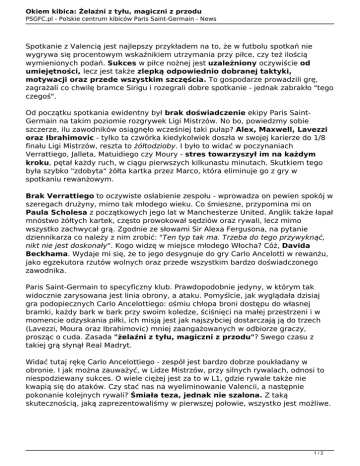 Okiem kibica: Żelaźni z tyłu, magiczni z przodu PSGFC.pl - Polskie centrum kibiców Paris Saint-Germain - News Spotkanie z Valencią jest najlepszy przykładem na to, że w futbolu spotkań nie wygrywa się procentowym wskaźnikiem utrzymania przy piłce, czy też ilością wymienionych podań. Sukces w piłce nożnej jest uzależniony oczywiście od umiejętności, lecz jest także zlepką odpowiednio dobranej taktyki, motywacji oraz przede wszystkim szczęścia. To gospodarze prowadzili grę, zagrażali co chwilę bramce Sirigu i rozegrali dobre spotkanie - jednak zabrakło "tego czegoś". Od początku spotkania ewidentny był brak doświadczenie ekipy Paris SaintGermain na takim poziomie rozgrywek Ligi Mistrzów. No bo, powiedzmy sobie szczerze, ilu zawodników osiągnęło wcześniej taki pułap? Alex, Maxwell, Lavezzi oraz Ibrahimovic - tylko ta czwórka kiedykolwiek doszła w swojej karierze do 1/8 finału Ligi Mistrzów, reszta to żółtodzioby. I było to widać w poczynaniach Verrattiego, Jalleta, Matuidiego czy Moury - stres towarzyszył im na każdym kroku, pętał każdy ruch, w ciągu pierwszych kilkunastu minutach. Skutkiem tego była szybko "zdobyta" żółta kartka przez Marco, która eliminuje go z gry w spotkaniu rewanżowym. Brak Verrattiego to oczywiste osłabienie zespołu - wprowadza on pewien spokój w szeregach drużyny, mimo tak młodego wieku. Co śmieszne, przypomina mi on Paula Scholesa z początkowych jego lat w Manchesterze United. Anglik także łapał mnóstwo żółtych kartek, często prowokował sędziów oraz rywali, lecz mimo wszystko zachwycał grą. Zgodnie ze słowami Sir Alexa Fergusona, na pytanie dziennikarza co należy z nim zrobić: "Ten typ tak ma. Trzeba do tego przywyknąć, nikt nie jest doskonały". Kogo widzę w miejsce młodego Włocha? Cóż, Davida Beckhama. Wydaje mi się, że to jego desygnuje do gry Carlo Ancelotti w rewanżu, jako egzekutora rzutów wolnych oraz przede wszystkim bardzo doświadczonego zawodnika. Paris Saint-Germain to specyficzny klub. Prawdopodobnie jedyny, w którym tak widocznie zarysowana jest linia obrony, a ataku. Pomyślcie, jak wyglądała dzisiaj gra podopiecznych Carlo Ancelottiego: ośmiu chłopa broni dostępu do własnej bramki, każdy bark w bark przy swoim koledze, ściśnięci na małej przestrzeni i w momencie odzyskania piłki, ich misją jest jak najszybciej dostarczają ją do trzech (Lavezzi, Moura oraz Ibrahimovic) mniej zaangażowanych w odbiorze graczy, prosząc o cuda. Zasada "żelaźni z tyłu, magiczni z przodu"? Swego czasu z takiej grą słynął Real Madryt. Widać tutaj rękę Carlo Ancelottiego - zespół jest bardzo dobrze poukładany w obronie. I jak można zauważyć, w Lidze Mistrzów, przy silnych rywalach, odnosi to niespodziewany sukces. O wiele ciężej jest za to w L1, gdzie rywale także nie kwapią się do ataków. Czy stać nas na wyeliminowanie Valencii, a następnie pokonanie kolejnych rywali? Śmiała teza, jednak nie szalona. Z taką skutecznością, jaką zaprezentowaliśmy w pierwszej połowie, wszystko jest możliwe. 1/2 Okiem kibica: Żelaźni z tyłu, magiczni z przodu PSGFC.pl - Polskie centrum kibiców Paris Saint-Germain - News Autor: kublu 2/2 Powered by TCPDF (www.tcpdf.org)