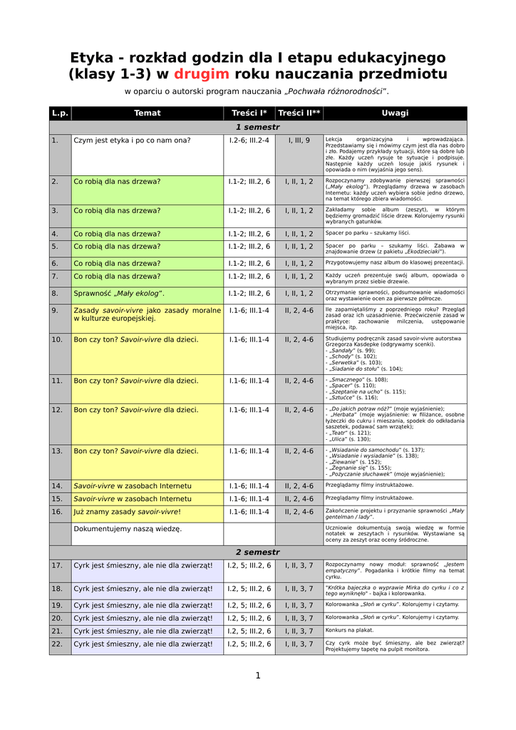 Etyka - rozkład godzin dla I etapu edukacyjnego (klasy 1-3) w drugim roku nauczania przedmiotu w oparciu o autorski program nauczania „Pochwała różnorodności”. L.p. Temat Treści I* Treści II** Uwagi 1 semestr 1. Czym jest etyka i po co nam ona? I.2-6; III.2-4 I, III, 9 Lekcja organizacyjna i wprowadzająca. Przedstawiamy się i mówimy czym jest dla nas dobro i zło. Podajemy przykłady sytuacji, które są dobre lub złe. Każdy uczeń rysuje te sytuacje i podpisuje. Następnie każdy uczeń losuje jakiś rysunek i opowiada o nim (wyjaśnia jego sens). 2. Co robią dla nas drzewa? I.1-2; III.2, 6 I, II, 1, 2 Rozpoczynamy zdobywanie pierwszej sprawności („Mały ekolog”). Przeglądamy drzewa w zasobach Internetu: każdy uczeń wybiera sobie jedno drzewo, na temat którego zbiera wiadomości. 3. Co robią dla nas drzewa? I.1-2; III.2, 6 I, II, 1, 2 Zakładamy sobie album (zeszyt), w którym będziemy gromadzić liście drzew. Kolorujemy rysunki wybranych gatunków. 4. Co robią dla nas drzewa? I.1-2; III.2, 6 I, II, 1, 2 Spacer po parku – szukamy liści. 5. Co robią dla nas drzewa? I.1-2; III.2, 6 I, II, 1, 2 Spacer po parku – szukamy liści. Zabawa znajdowanie drzew (z pakietu „Ekodzieciaki”). 6. Co robią dla nas drzewa? I.1-2; III.2, 6 I, II, 1, 2 Przygotowujemy nasz album do klasowej prezentacji. 7. Co robią dla nas drzewa? I.1-2; III.2, 6 I, II, 1, 2 Każdy uczeń prezentuje swój album, opowiada o wybranym przez siebie drzewie. 8. Sprawność „Mały ekolog”. I.1-2; III.2, 6 I, II, 1, 2 Otrzymanie sprawności, podsumowanie wiadomości oraz wystawienie ocen za pierwsze półrocze. 9. Zasady savoir-vivre jako zasady moralne w kulturze europejskiej. I.1-6; III.1-4 II, 2, 4-6 Ile zapamiętaliśmy z poprzedniego roku? Przegląd zasad oraz ich uzasadnienie. Przećwiczenie zasad w praktyce: zachowanie milczenia, ustępowanie miejsca, itp. 10. Bon czy ton? Savoir-vivre dla dzieci. I.1-6; III.1-4 II, 2, 4-6 Studiujemy podręcznik zasad savoir-vivre autorstwa Grzegorza Kasdepke (odgrywamy scenki). - „Sandały” (s. 99); - „Schody” (s. 102); - „Serwetka” (s. 103); - „Siadanie do stołu” (s. 104); 11. Bon czy ton? Savoir-vivre dla dzieci. I.1-6; III.1-4 II, 2, 4-6 - 12. Bon czy ton? Savoir-vivre dla dzieci. I.1-6; III.1-4 II, 2, 4-6 - „Do jakich potraw nóż?” (moje wyjaśnienie); - „Herbata” (moje wyjaśnienie: w filiżance, osobne łyżeczki do cukru i mieszania, spodek do odkładania saszetek, podawać sam wrzątek); - „Teatr” (s. 121); - „Ulica” (s. 130); 13. Bon czy ton? Savoir-vivre dla dzieci. I.1-6; III.1-4 II, 2, 4-6 - 14. Savoir-vivre w zasobach Internetu I.1-6; III.1-4 II, 2, 4-6 Przeglądamy filmy instruktażowe. 15. Savoir-vivre w zasobach Internetu I.1-6; III.1-4 II, 2, 4-6 Przeglądamy filmy instruktażowe. 16. Już znamy zasady savoir-vivre! I.1-6; III.1-4 II, 2, 4-6 Zakończenie projektu i przyznanie sprawności „Mały gentelman / lady”. w „Smacznego” (s. 108); „Spacer” (s. 110); „Szeptanie na ucho” (s. 115); „Sztućce” (s. 116); „Wsiadanie do samochodu” (s. 137); „Wsiadanie i wysiadanie” (s. 138); „Ziewanie” (s. 152); „Żegnanie się” (s. 155); „Pożyczanie słuchawek” (moje wyjaśnienie); Uczniowie dokumentują swoją wiedzę w formie notatek w zeszytach i rysunków. Wystawiane są oceny za zeszyt oraz oceny śródroczne. Dokumentujemy naszą wiedzę. 2 semestr 17. Cyrk jest śmieszny, ale nie dla zwierząt! I.2, 5; III.2, 6 I, II, 3, 7 Rozpoczynamy nowy moduł: sprawność „Jestem empatyczny”. Pogadanka i krótkie filmy na temat cyrku. 18. Cyrk jest śmieszny, ale nie dla zwierząt! I.2, 5; III.2, 6 I, II, 3, 7 "Krótka bajeczka o wyprawie Mirka do cyrku i co z tego wyniknęło" - bajka i kolorowanka. 19. Cyrk jest śmieszny, ale nie dla zwierząt! I.2, 5; III.2, 6 I, II, 3, 7 Kolorowanka „Słoń w cyrku”. Kolorujemy i czytamy. 20. Cyrk jest śmieszny, ale nie dla zwierząt! I.2, 5; III.2, 6 I, II, 3, 7 Kolorowanka „Słoń w cyrku”. Kolorujemy i czytamy. 21. Cyrk jest śmieszny, ale nie dla zwierząt! I.2, 5; III.2, 6 I, II, 3, 7 Konkurs na plakat. 22. Cyrk jest śmieszny, ale nie dla zwierząt! I.2, 5; III.2, 6 I, II, 3, 7 Czy cyrk może być śmieszny, ale bez zwierząt? Projektujemy tapetę na pulpit monitora. 1 L.p. Temat Treści I* Treści II** Uwagi 23. Cyrk jest śmieszny, ale nie dla zwierząt! I.2, 5; III.2, 6 I, II, 3, 7 Finalizujemy moduł. 24. Cyrk jest śmieszny, ale nie dla zwierząt! I.2, 5; III.2, 6 I, II, 3, 7 Podsumowanie modułu, „Jestem empatyczny”. 25. Zwierzęta w życiu człowieka. I.2, 5; III.2 I, II, 2, 5 Rozpoczęcie modułu „Jestem odpowiedzialny”. Opowiadamy o naszych zwierzętach domowych lub o tych, które chcielibyśmy mieć. Osoby, które posiadają zwierzę, opowiadają skąd się u nich wzięły. Każdy rysuje swojego realnego lub wymarzonego pupila. Przynosimy swoje domowe maskotki. 26. Adoptuj, nie kupuj! I.2, 5; III.2 I.2, 5; III.2 Oglądamy zdjęcia i filmy ze schronisk dla zwierząt. Czy chciałbyś przygarnąć zwierzę? 27. Adoptuj, nie kupuj! I.2, 5; III.2 I.2, 5; III.2 Teatrzyk: historie zwierząt schroniskowych z happy endem. 28. Adoptuj, nie kupuj! I.2, 5; III.2 I.2, 5; III.2 Film 29. Adoptuj, nie kupuj! I.2, 5; III.2 I.2, 5; III.2 Film 30. Jesteśmy odpowiedzialni oswoiliśmy. co I.2, 5; III.2 I.2, 5; III.2 Jak należy prawidłowo opiekować się zwierzęciem, które z nami mieszka? Film i pogadanka. 31. Finalizacja modułu odpowiedzialny”. „Jestem I.2, 5; III.2 I.2, 5; III.2 Sprawdzenie wiadomości z modułu. Indywidualna rozmowa z każdym uczniem. 32. Podsumowanie materiału rocznego. I.1-6, III.1-6 II, V, 9 za to, przyznanie Przyznanie dyplomów i sprawności odpowiedzialny”. Propozycje ocen. sprawności „Jestem Uczniowie dokumentują swoją wiedzę w formie notatek w zeszytach i rysunków. Wystawiane są oceny za zeszyt oraz oceny śródroczne. Dokumentujemy naszą wiedzę. Uwagi: Kolejność realizac