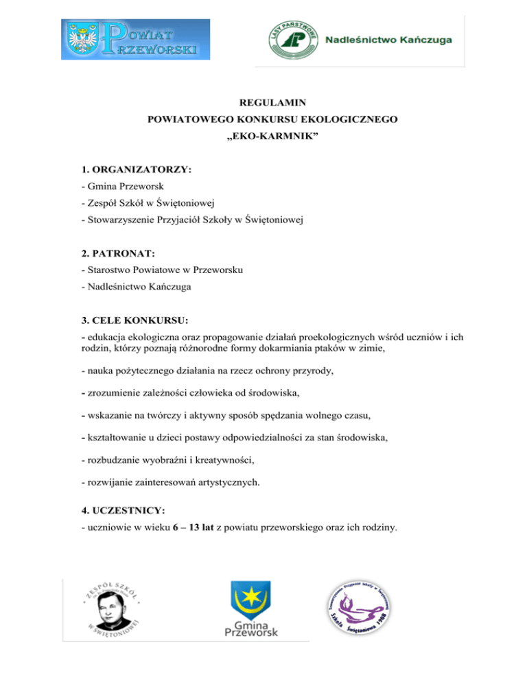 REGULAMIN POWIATOWEGO KONKURSU EKOLOGICZNEGO ,,EKO-KARMNIK” 1. ORGANIZATORZY: - Gmina Przeworsk - Zespół Szkół w Świętoniowej - Stowarzyszenie Przyjaciół Szkoły w Świętoniowej 2. PATRONAT: - Starostwo Powiatowe w Przeworsku - Nadleśnictwo Kańczuga 3. CELE KONKURSU: - edukacja ekologiczna oraz propagowanie działań proekologicznych wśród uczniów i ich rodzin, którzy poznają różnorodne formy dokarmiania ptaków w zimie, - nauka pożytecznego działania na rzecz ochrony przyrody, - zrozumienie zależności człowieka od środowiska, - wskazanie na twórczy i aktywny sposób spędzania wolnego czasu, - kształtowanie u dzieci postawy odpowiedzialności za stan środowiska, - rozbudzanie wyobraźni i kreatywności, - rozwijanie zainteresowań artystycznych. 4. UCZESTNICY: - uczniowie w wieku 6 – 13 lat z powiatu przeworskiego oraz ich rodziny. 5. PRZEDMIOT KONKURSU: Zadaniem konkursu jest wykonanie „karmnika dla ptaków” z desek lub podobnego naturalnego materiału oraz przesłaniu lub dostarczeniu karmnika wraz z deklaracją uczestnictwa w konkursie na adres Zespołu Szkół w Świętoniowej. 6. ZASADY UCZESTNICTWA: - uczestnicy zgłaszają do konkursu zrobione przez siebie karmniki z opisem /tabliczką: Konkurs na Eko-karmnik, imię i nazwisko wykonawcy/wykonawców, klasa, szkoła, nr telefonu do szkoły; - do konkursu można zgłaszać prace wykonane rodzinnie; - prace wykonane z desek lub podobnego naturalnego materiału, - karmniki mogą być zbite gwoździami, klejone lub stabilizowane techniką mieszaną, - zabrania się: pryskania lub malowania karmnika środkami bakteriobójczymi oraz grzybobójczymi. Jedynymi środkami chemicznymi przyzwolonymi do wykorzystania w karmniku jest bezzapachowa lakierobejca, bezzapachowa nietoksyczna farba, klej wikol do drewna oraz niewielkie ilości nietoksycznego silikonu w tubie służące do uszczelniania przestrzeni między deskami oraz wokół gwoździ (tym samym zapobiegające dostawaniu się wody deszczowej do wnętrza), - karmnik musi posiadać podstawowe zabezpieczenie przed drapieżnikami oraz zalegającym śniegiem, jakim jest daszek ze spadkiem pod kątem ostrym, aby uniemożliwiał drapieżnikom (koty, kuny) siedzenie na szczycie karmnika, - konstrukcja powinna być stabilna i zawierać element pozwalający na jego zamocowanie do drzewa, - prosimy o wstępną selekcję prac, każda szkoła może zgłosić dwie prace wyłonione w drodze wewnątrzszkolnego konkursu ( w wyjątkowych sytuacjach za zgodą organizatora prac może być więcej) - technika wykonania prac dowolna, jednak dobry karmnik powinien chronić karmę przed rozsypaniem, zamoknięciem i umożliwiać ptakom bezpieczne korzystanie z niego, - wymiary od 35x35 cm do 50x50cm, - do pracy należy dołączyć wypełnioną zgodę przedstawiciela ustawowego ucznia, który nie ukończył 18 lat, - nagrodzone prace przechodzą na własność organizatora – najlepsze będą eksponowane, - prace zostaną ocenione do dnia 21 listopada 2016 roku, a do dnia 25 listopada uczestnicy konkursu zostaną poinformowani telefonicznie o jego wynikach oraz terminie wręczenia nagród. 7. TERMIN: - konkurs trwa od 15.10.16 r. do 15.11.16 r. - termin dostarczenia prac do 15.11.16 r. miejsce: Zespół Szkół w Świętoniowej Świętoniowa100 37-200 Przeworsk. Dodatkowe informacje można uzyskać pod nr telefonu: 16-648-67-35 lub mailowo [email protected] 8. JURY: - w skład Jury konkursu wejdą przedstawiciele Organizatorów oraz nauczyciele Szkół Powiatu Przeworskiego. 9. NAGRODY: - w konkursie zostaną przyznane cenne nagrody główne i wyróżnienia ( sprzęt multimedialny, książki, gadżety elektroniczne) - lista laureatów zostanie zamieszczona na stronie internetowej Szkoły www.zsswietoniowa.szkolnastrona.pl do 25 listopada 2016 r., - laureaci konkursu zostaną powiadomieni o terminie i miejscu uroczystego wręczenia nagród. 10. KRYTERIA OCENY W KONKURSIE: Jury oceniać będzie zgłoszone karmniki biorąc pod uwagę: - zgodność z przedmiotem Konkursu; - oryginalność projektu przy zachowaniu funkcjonalności karmników; - estetyka i trwałość konstrukcji; - dobór materiałów. Karta zgłoszenia: ,,Konkurs Powiatowy Eko-Karmnik” Imię i nazwisko ucznia:………………………………………………………………………….. Data urodzenia wykonawcy/ klasa: ………………………………………………………………… Nazwa Szkoły którą reprezentuje wykonawca……………………………………………………… ……………………………………………………………………………………………………… Adres Szkoły ……………………………………………………………………………………… Email Szkoły:………………………………………………………………………………………… Numer Telefonu ………………………………. Pieczęć Szkoły …...……………………. Podpis Dyrektora …………………………………… OŚWIADCZENIE RODZICÓW/PRAWNYCH OPIEKUNÓW NIEPEŁNOLETNIEGO UCZESTNIKA KONKURSU ……………………………………………………………………………………………… (IMIĘ I NAZWISKO UCZESTNIKA KONKURSU POWIATOWEGO EKO-KARMNIK) Po zapoznaniu się i akceptacji regulaminu Konkursu Powiatowego Eko – Karmnik, wyrażam zgodę na udział mojego dziecka w konkursie oraz na upublicznienie danych osobowych celem popularyzacji konkursu. Oświadczam także, że zgłoszona do niniejszego konkursu praca jest wynikiem własnej twórczości .................................................................................................................... (imię i nazwisko uczestnika konkursu) i nie narusza praw autorskich oraz jakichkolwiek innych praw osób trzecich oraz nie została zgłoszona do innych konkursów o podobnej tematyce. (Ustawa z 29 sierpnia 1997 r. o ochronie danych osobowyc