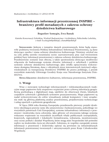 Budownictwo i Architektura 11 (2012) 83-98 Infrastruktura informacji przestrzennej INSPIRE – branżowy profil metadanych z zakresu ochrony dziedzictwa kulturowego Bogusław Szmygin, Ewa Banak Katedra Konserwacji Zabytków, Wydział Budownictwa i Architektury, Politechnika Lubelska, e-mail: [email protected], [email protected] Streszczenie: Jednym z tematów danych przestrzennych, które będą stanowiły podstawę tworzenia Polskiej Infrastruktury Informacji Przestrzennej, są dane dotyczące zasobu i stanu ochrony dziedzictwa kulturowego. Niniejszy artykuł ma na celu próbę szeroko rozumianej oceny zaawansowania prac nad tworzeniem polskiej bazy informacji przestrzennej z zakresu ochrony dziedzictwa kulturowego. Przedstawiony zostanie stan obecny, a także spostrzeżenia dotyczące możliwości włączenia do budowanego systemu zbiorów informacji o zabytkach i polskim systemie ochrony dziedzictwa kulturowego. Jako źródła opracowania wykorzystano dostępną literaturę, dane z oficjalnych stron internetowych instytucji odpowiedzialnych za transpozycję Dyrektywy INSPIRE do prawa polskiego, a przede wszystkim materiały Głównego Geodety Kraju oraz Narodowego Instytutu Dziedzictwa. Słowa kluczowe: dziedzictwo kulturowe, informacja przestrzenna, INSPIRE. 1.Wstęp Wraz z rozwojem technologii informacyjnych i telekomunikacyjnych tradycyjne mapy papierowe były stopniowo wypierane przez cyfrową informację geograficzną pochodzącą z digitalizacji map, satelitów do obserwacji Ziemi, lokalnych czujników cyfrowych i globalnych systemów pozycjonowania. Mapy papierowe są nadal wykorzystywane do celów wizualizacji, jednak komputery i inne urządzenia stały się główną platformą analizy przestrzennej, projektowania technicznego i usług opartych o położenie geograficzne. W lipcu 2004 roku Komisja Europejska przedstawiła pierwszy projekt dyrektywy określającej prawne ramy dla ustanowienia i funkcjonowania, jednolitego we wszystkich państwach Unii Europejskiej, systemu infrastruktury informacji o przestrzeni i środowisku życia człowieka. Jako główny cel stworzenia takiego systemu wskazano wspieranie na wszystkich szczeblach władz publicznych (europejskich, krajowych, regionalnych i lokalnych) formułowania, wdrażania, monitorowania oraz oceny polityk i działań Wspólnoty, które mogą mieć bezpośredni lub pośredni wpływ na środowisko życia jej obywateli. Założono, że wspólny europejski system informacji o przestrzeni i środowisku opierać się powinien na infrastrukturach informacji przestrzennej tworzonych i utrzymywanych przez Kraje Członkowskie Wspólnoty. 84 Bogusław Szmygin, Ewa Banak Dyrektywa 2007/2/WE ustanawiająca infrastrukturę informacji przestrzennej we Wspólnocie Europejskiej (Infrastructure for Spatial Information in the European Community - INSPIRE) [5] została przyjęta przez Parlament Europejski i Radę Europy w dniu 14 marca 2007 roku. Podstawę ustanowienia nowego systemu oraz cele i wymagania, które ma on spełnić wyrażono w Preambule Dyrektywy. Stwierdzono w niej między innymi, że: 1.Do formułowania i realizacji polityki w zakresie ochrony środowiska oraz innych polityk wspólnotowych, które muszą brać pod uwagę wymogi ochrony środowiska, potrzebne są informacje, w tym informacja przestrzenna. „Dla uwzględnienia tych wymogów konieczne jest zapewnienie odpowiedniej koordynacji pomiędzy podmiotami dostarczającymi informacje i użytkownikami tych informacji, tak aby możliwe było połączenie informacji i wiedzy pochodzących z różnych sektorów.” (punkt 1 Preambuły); 2.Rozwiązywanie problemów dotyczących możliwości uzyskania, jakości, organizacji, dostępności i wspólnego korzystania z informacji przestrzennej wymaga działań nastawionych na wymianę, wspólne korzystanie, dostęp i użytkowanie interoperacyjnych danych przestrzennych i usług dotyczących danych przestrzennych na różnych szczeblach organów publicznych i w różnych sektorach administracji. „Należy w związku z tym utworzyć infrastrukturę informacji przestrzennej we Wspólnocie.”(punkt 3 Preambuły); 3.Infrastruktury informacji przestrzennej w państwach członkowskich powinny być zaprojektowane tak, aby było możliwe między innymi: „ … łączenie w jednolity sposób danych przestrzennych pochodzących z różnych źródeł we Wspólnocie i wspólne korzystanie z nich przez wielu użytkowników;(…) aby łatwo było wyszukać dostępne dane przestrzenne, ocenić ich przydatność dla określonego celu oraz poznać warunki dotyczące ich wykorzystywania.” (punkt 6 Preambuły). Dyrektywa 2007/2/WE, zwana Dyrektywą INSPIRE, identyfikuje co powinno zostać osiągnięte oraz określa terminy, w których Kraje Członkowskie Wspólnoty mają wprowadzić do swojego prawodawstwa przepisy oraz procedury niezbędne dla utworzenia krajowych systemów informacji przestrzennych. Europejska Infrastruktura Informacji Przestrzennej docelowo ma opierać się na systemach i infrastrukturach ustanowionych i prowadzonych przez wszystkie Kraje Członkowskie. Powinny to być systemy wzajemnie ze sobą kompatybilne i dostosowane do użytkowania w kontekście całej Wspólnoty, a także w kontekście transgranicznym. Dla Polski oznacza to zobowiązanie terminowego utworzenia Polskiej Infrastruktury Informacji Przestrzennej, która będzie stanowiła część INSPIRE. 2. Infrastruktura Informacji przestrzennej w Europie (INSPIRE) Współcześnie informacje geograficzne są gromadzone, przetwarzane i wykorzystywane w tak zróżnicowanych obszarach jak: geodezja, gospodarka terenami, zagospodarowanie przestrzenne, statystyka, łagodzenie skutków klęsk żywiołowych, geologia, hydrologia, obrona cywilna, rolnictwo, ochrona środowiska przyrodniczego i kulturowego oraz wiele innych. Wyzwania związane z brakiem dostępności, Infrastruktura informacji przestrzennej INSPIRE ... 85 niską jakością, brakiem organizacji i współdzieleni