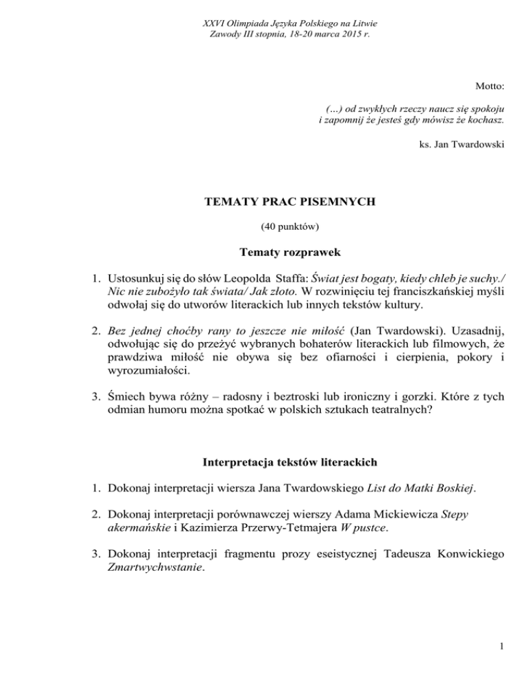 XXVI Olimpiada Języka Polskiego na Litwie Zawody III stopnia, 18-20 marca 2015 r. Motto: (…) od zwykłych rzeczy naucz się spokoju i zapomnij że jesteś gdy mówisz że kochasz. ks. Jan Twardowski TEMATY PRAC PISEMNYCH (40 punktów) Tematy rozprawek 1. Ustosunkuj się do słów Leopolda Staffa: Świat jest bogaty, kiedy chleb je suchy./ Nic nie zubożyło tak świata/ Jak złoto. W rozwinięciu tej franciszkańskiej myśli odwołaj się do utworów literackich lub innych tekstów kultury. 2. Bez jednej choćby rany to jeszcze nie miłość (Jan Twardowski). Uzasadnij, odwołując się do przeżyć wybranych bohaterów literackich lub filmowych, że prawdziwa miłość nie obywa się bez ofiarności i cierpienia, pokory i wyrozumiałości. 3. Śmiech bywa różny – radosny i beztroski lub ironiczny i gorzki. Które z tych odmian humoru można spotkać w polskich sztukach teatralnych? Interpretacja tekstów literackich 1. Dokonaj interpretacji wiersza Jana Twardowskiego List do Matki Boskiej. 2. Dokonaj interpretacji porównawczej wierszy Adama Mickiewicza Stepy akermańskie i Kazimierza Przerwy-Tetmajera W pustce. 3. Dokonaj interpretacji fragmentu prozy eseistycznej Tadeusza Konwickiego Zmartwychwstanie. 1 XXVI Olimpiada Języka Polskiego na Litwie Zawody III stopnia, 18-20 marca 2015 r. Jan Twardowski (1915-2006) List do Matki Boskiej W pierwszych słowach donoszę nic się nie zmieniło żółta pliszka się cieszy swoim czarnym dziobem łosoś wraca do rzeki w której się urodził mrówki się oblizują jak na nie przystało sarna leczy się ślazem1 więc mniej pokasłuje las tak rzeczywisty że staje się zjawą pszczoła nie zna Szopena ale jest muzyką śmierć jak zwykle niziutko układa na ziemi świętym można tu zostać nawet na podwórku rzucając kurom ziarno staroświecką modą znów najpiękniejszy w Polsce jest lipiec nad wodą a piękno jest najbliżej gdy czas się oddala żadna ryba nie traci nawet jednej łuski sroka z wąskim ogonem powtarza dowcipy rzeczy mają własną po umarłych pamięć więc pamięta mą matkę czajniczek rozbity dla słowika w czerwcu każda noc za mała ponieważ wierzy w miłość nie boi się ciała śpiewa że serce żywe a już nieśmiertelne bocian dalej podnosi tylko lewą nogę piszę list bo Cię tu przecież zobaczyć nie mogę myślę jednak że chyba czasem Ciebie słyszę bo skąd się nagle bierze ten szept kiedy zasnę Ze zbioru Niebieskie okulary (1980) 1 ślaz – dziko rosnąca roślina wykorzystywana w lecznictwie. 2 XXVI Olimpiada Języka Polskiego na Litwie Zawody III stopnia, 18-20 marca 2015 r. Adam Mickiewicz (1798-1855) Stepy akermańskie Wpłynąłem na suchego przestwór oceanu Wóz nurza się w zieloność i jak łódka brodzi, Śród fali łąk szumiących, śród kwiatów powodzi, Omijam koralowe ostrowy burzanu 2. Już mrok zapada, nigdzie drogi ni kurhanu; Patrzę w niebo, gwiazd szukam, przewodniczek łodzi; Tak z dala błyszczy obłok? tam jutrzenka wschodzi? To błyszczy Dniestr, to weszła lampa Akermanu 3. Stójmy! – jak cicho! – słyszę ciągnące żurawie, Których by nie dościgły źrenice sokoła; Słyszę, kędy się motyl kołysa na trawie, Kędy wąż śliską piersią dotyka się zioła. W takiej ciszy! – tak ucho natężam ciekawie, Że słyszałbym głos z Litwy. – Jedźmy, nikt nie woła. Ze zbioru Sonety krymskie (1826) Kazimierz Przerwa-Tetmajer (1865-1940) W pustce Ciche leżą kamienie pod skał ciemnym murem. Noc – wśród żlebu 4 się świeci wąski smug księżyca, jak ogromna, stężała w locie błyskawica, zamarznięta na skale w pustkowiu ponurem. Cicho… W złomach 5 jezioro czarne i zlodniałe; taka głusza, że słychać szelest kropel z śniegu sączących się w toń wodną po kamieniach z brzegu; śnieg pokrył ciemnym płatem ochmurzoną skałę. Chmury się dotykają prawie mego czoła; zimne, oślizgłe ręce moje ziębią … Nad jeziora lodową, przepaścistą głębią zasłuchałem się w przestrzeń … Idźmy … „Nikt nie woła” … Ze zbioru Poezje, t. 3 (1900) burzan – kępy chwastów rosnących w stepie. lampa Akermanu – latarnia morska na minarecie akermańskiego meczetu. 4 żleb – strome wcięcie w stoku górskim, wyżłobione przez zsuwające się okruchy skalne. 5 złom – odłupany kawał czegoś, zwłaszcza blok skalny. 2 3 3 XXVI Olimpiada Języka Polskiego na Litwie Zawody III stopnia, 18-20 marca 2015 r. Tadeusz Konwicki (1926-2015) Zmartwychwstanie [Narrator znajduje się w 4-osobowej sali szpitalnej, na oddziale kardiologii. Obok niego leży nowy pacjent, ślusarz z zawodu.] […] Ciągle było pełno słońca w naszym pokoju. Zupełnie jak w lecie, jak w lipcu albo sierpniu. Zdawało mi się, że słyszę gdzieś za ścianą plusk wody w basenie i krzyk dzieci. Obaj starcy zaczęli drzemać, nowy pacjent także zamknął powieki. Tylko ja nie mogłem drzemać, bo byłem zdrowy i to zdrowie nie dawało mi spać. […] Mój lekarz chodził po boksie zerkając na monitory, ciągle z tymi rękami w kieszeniach. I nagle zatrzymał się wpatrzony w lewy górny monitor. Niedostrzegalnym prawie ruchem wyjął ręce z kieszeni i klasnął w dłonie. Wtedy w drzwiach pokazała się głowa pielęgniarki. Coś powiedział niegłośno i nagle rozpętała się burza śnieżna. Nagle pięć albo sześć białych postaci dziewczęcych otoczyło łóżko nowo przybyłego pacjenta. Lekarz powiedział niegłośno: - Mamy dwadzieścia cztery sekundy. Nie jestem pewien, że to było tyle sekund. Ale tak mi się wydaje, że dał im termin tych dwudziestu paru sekund. To, co się teraz działo, właściwie jest nie do opisania. W jednej chwili te dziewczyny wbiły w pacjenta niezliczoną ilość igieł, coś z nim robiły, coś majstrowały pospiesznie z jego bezwładnym ciałem. To było naprawdę niesamowite i nigdy tego nie zapomnę, i nigdy już lepiej nie zrozumiem wagi i ciężaru czasu. Wtedy lekarz wskazał ten aparat do elektrycznego