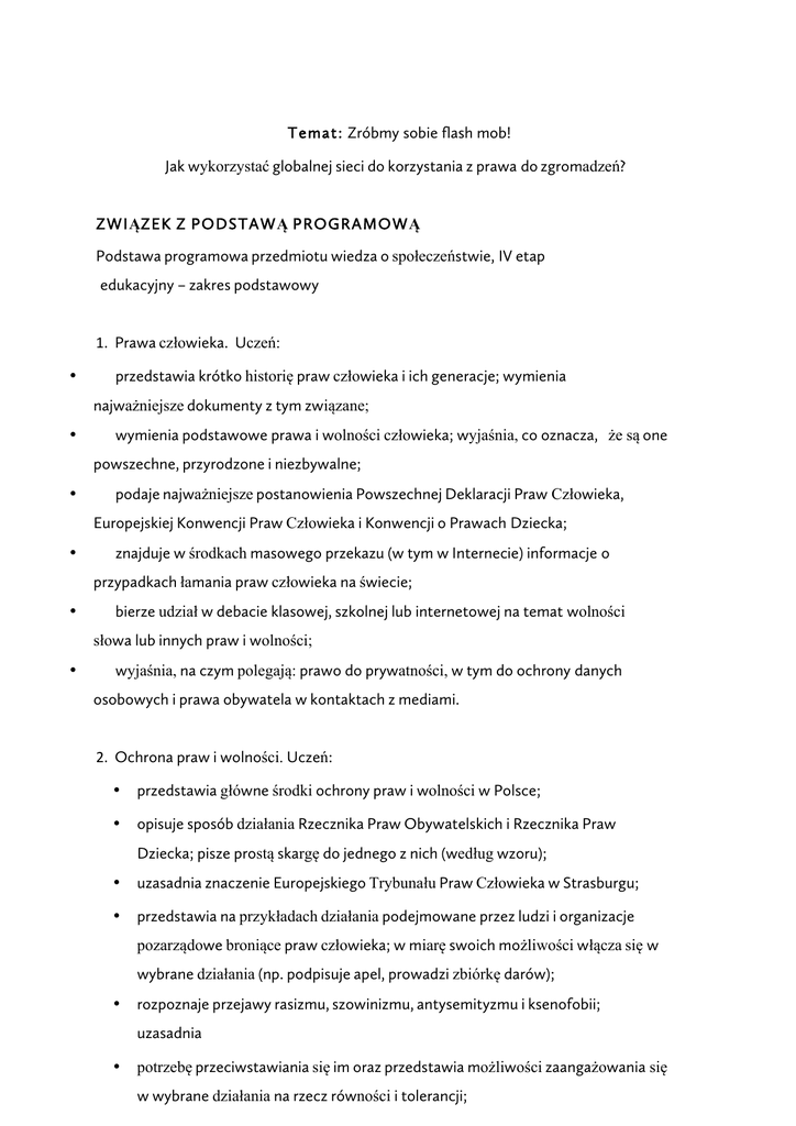 Temat: Zróbmy sobie flash mob! Jak wykorzystać globalnej sieci do korzystania z prawa do zgromadzeń? ZWIĄZEK Z PODSTAWĄ PROGRAMOWĄ Podstawa programowa przedmiotu wiedza o społeczeństwie, IV etap edukacyjny – zakres podstawowy 1. Prawa człowieka. Uczeń: • przedstawia krótko historię praw człowieka i ich generacje; wymienia najważniejsze dokumenty z tym związane; • wymienia podstawowe prawa i wolności człowieka; wyjaśnia, co oznacza, że są one powszechne, przyrodzone i niezbywalne; • podaje najważniejsze postanowienia Powszechnej Deklaracji Praw Człowieka, Europejskiej Konwencji Praw Człowieka i Konwencji o Prawach Dziecka; • znajduje w środkach masowego przekazu (w tym w Internecie) informacje o przypadkach łamania praw człowieka na świecie; • bierze udział w debacie klasowej, szkolnej lub internetowej na temat wolności słowa lub innych praw i wolności; • wyjaśnia, na czym polegają: prawo do prywatności, w tym do ochrony danych osobowych i prawa obywatela w kontaktach z mediami. 2. Ochrona praw i wolności. Uczeń: • przedstawia główne środki ochrony praw i wolności w Polsce; • opisuje sposób działania Rzecznika Praw Obywatelskich i Rzecznika Praw Dziecka; pisze prostą skargę do jednego z nich (według wzoru); • uzasadnia znaczenie Europejskiego Trybunału Praw Człowieka w Strasburgu; • przedstawia na przykładach działania podejmowane przez ludzi i organizacje pozarządowe broniące praw człowieka; w miarę swoich możliwości włącza się w wybrane działania (np. podpisuje apel, prowadzi zbiórkę darów); • rozpoznaje przejawy rasizmu, szowinizmu, antysemityzmu i ksenofobii; uzasadnia • potrzebę przeciwstawiania się im oraz przedstawia możliwości zaangażowania się w wybrane działania na rzecz równości i tolerancji; • znajduje informacje o naruszaniu praw człowieka w wybranej dziedzinie (np. prawa kobiet, prawa dziecka, wolność wyznania, prawo do edukacji, prawa humanitarne) i projektuje działania, które mogą temu zaradzić. 3. Państwo i władza demokratyczna. Uczeń: • Wymienia podstawowe cechy i funkcje państwa; wyjaśnia, czym jest władza państwowa; • Wskazuje różnice w sytuacji obywatela w ustroju demokratycznym autorytarnym, i totalitarnym; • Wyjaśnia zasady: większości, pluralizmu i poszanowania praw mniejszości w państwie demokratycznym; • Wskazuje najważniejsze tradycje demokracji (antyczna, europejska, amerykańska, polska); • Porównuje demokrację bezpośrednią z przedstawicielską oraz większościową z konstytucyjną (liberalną); • Wyjaśnia, czym są prawa człowieka i uzasadnia ich znaczenie we współczesnej demokracji; • Rozważa i ilustruje przykładami zalety i słabości demokracji. Liczba jednostek: Godzina lekcyjna (45 min) Cele: • Zapoznanie uczniów z istotnością prawa do zgromadzeń, użyteczności Internetu w korzystaniu z tego prawa oraz z przykładami ograniczenia i walki o to prawo. Po lekcji uczeń powinien: • Mieć świadomość posiadania prawa do zgromadzeń • Mieć świadomość istotności sieci globalnej w walce o prawa człowieka znając przykłady wykorzystania Internetu • Umieć wykorzystać Internet do zastosowania i obrony prawa do zgromadzeń • Znać przykłady łamania i walki o prawa do zgromadzeń na przykładzie Białorusi, Chin, Rosji, Stanów Zjednoczonych, krajów Bliskiego Wschodu. • Umieć zorganizować akcję (flash mob) mającą na celu zwrócenie uwagi na łamanie praw człowieka poprzez wykorzystanie Internetu Metody: • Wykład; • Rozmowa naprowadzająca; • Symulacja; Środki: • Zdjęcia z demonstracji; • Komputer; • Rzutnik; Przebieg lekcji Część pierwsza( 5 min) – zapoznanie z tematem: • Ustalenie czym według uczniów są prawa człowieka i jakie prawa człowieka znają, zaznaczenie że prawa człowieka są przyrodzone i niezbywalne o Rozwinięcie wiedzy o prawie do zgromadzeń • Rozmowa o wykorzystaniu Internetu do przekazywania informacji i organizacji imprez masowych • Rozmowa naprowadzająca o sytuacji politycznej na Białorusi Cześć druga (25 min): symulacja Po krótkiej informacji i pokazaniu kilku przykładów flash mobów klasie zostanie przedstawiona propozycja organizacji flash moba na wybrany przez nich temat. Zadaniem klasy będzie wspólne ustalenie tego tematu oraz organizacja akcji z wykorzystaniem Internetu (utworzenie wydarzenia na Facebooku, ogłoszenie na portalu Internetowym szkoły itd. – wybór należy do uczniów). Uczniowie będą poinformowani o zobowiązaniach prawnych co do organizacji flash moba (informacja o tym, że prawo polskie w zasadzie nie przewiduje żadnych regulacji dotyczących flash moba, chodzi przede wszystkim o to, aby stosować się do ogólnych zasadach bezpieczeństwa, takich jak kodeks cywilny i drogowy – flash moby nie są organizowane formalnie, to spotkanie na chwilę kilkudziesięciu osób, nie mające właściwie formy zgromadzenia). Po przestawieniu planu organizacji oraz zapoznaniu z regulacjami, klasa zostanie poinformowana, że w tej chwili przenosi się w realia białoruskie. Klasie zostanie zaproponowana organizacja tej samej akcji, ale na Białorusi. Uczniowie zostaną poinformowani o ścieżce, którą należy pokonać chcąc zorganizować taką samą akcję na Białorusi – uczniowie przygotowują wszyscy jak w Polsce, jednak na każdym kroku napotykają na ograniczenia, których często nie ma w przepisach prawa?– po wymyśleniu akcji są poinformowani o tym, że muszą napisać oddzielne pismo z prośbą o pozwolenie na organizację (zgromadzenie osób powyżej trzech, nawet nieformalne, musi zostać zgłoszone), muszą zostać przygotowane odpowiednie warunki bezpieczeństwa (policja, pogotowie) – jak w przypadku dużej imprezy masowej, czym flash mob w rzeczywistości nie jest; po kolei będą zakazywane kolejne lokalizacje. Zostaną również przedstawione konsekwencje wynikające z niestosowania się