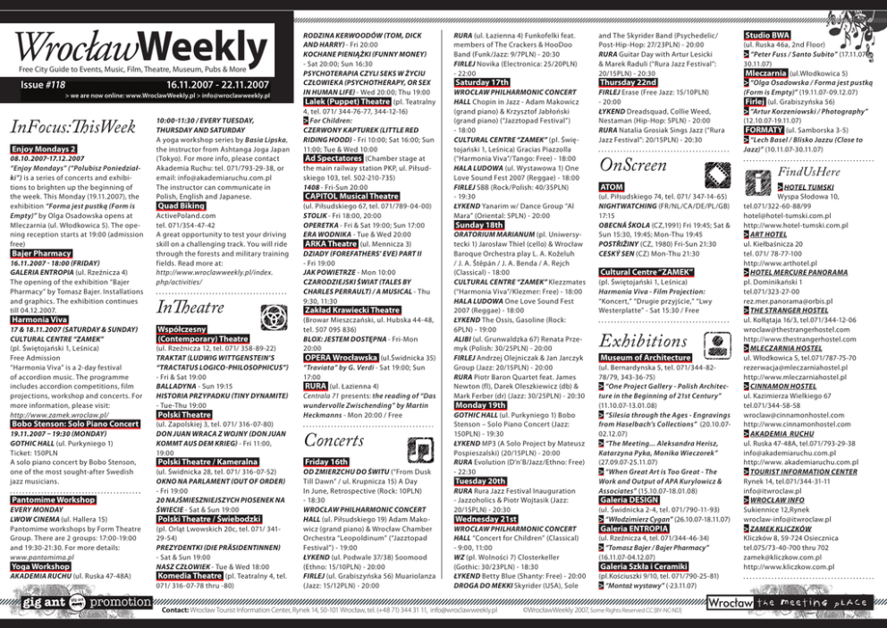 WrocławWeekly Free City Guide to Events, Music, Film, Theatre, Museum, Pubs & More Issue #118 16.11.2007 - 22.11.2007 > we are now online: www.WroclawWeekly.pl > [email protected] InFocus:ThisWeek Enjoy Mondays 2 08.10.2007-17.12.2007 “Enjoy Mondays” (“Polubisz Poniedziałki”) is a series of concerts and exhibitions to brighten up the beginning of the week. This Monday (19.11.2007), the exhibition “Forma jest pustką (Form is Empty)” by Olga Osadowska opens at Mleczarnia (ul. Włodkowica 5). The opening reception starts at 19:00 (admission free) Bajer Pharmacy 16.11.2007 - 18:00 (Friday) Galeria ENTROPIA (ul. Rzeźnicza 4) The opening of the exhibition “Bajer Pharmacy” by Tomasz Bajer. Installations and graphics. The exhibition continues till 04.12.2007. Harmonia Viva 17 & 18.11.2007 (Saturday & Sunday) Cultural Centre “ZAMEK” (pl. Świętojański 1, Leśnica) Free Admission “Harmonia Viva” is a 2-day festival of accordion music. The programme includes accordion competitions, film projections, workshop and concerts. For more information, please visit: http://www.zamek.wroclaw.pl/ Bobo Stenson: Solo Piano Concert 19.11.2007 – 19:30 (Monday) GOTHIC HALL (ul. Purkyniego 1) Ticket: 150PLN A solo piano concert by Bobo Stenson, one of the most sought-after Swedish jazz musicians. Pantomime Workshop Every Monday LWOW CINEMA (ul. Hallera 15) Pantomime workshops by Form Theatre Group. There are 2 groups: 17:00-19:00 and 19:30-21:30. For more details: www.pantomima.pl Yoga Workshop AKADEMIA RUCHU (ul. Ruska 47-48A) 10:00-11:30 / Every Tuesday, Thursday and Saturday A yoga workshop series by Basia Lipska, the instructor from Ashtanga Joga Japan (Tokyo). For more info, please contact Akademia Ruchu: tel. 071/793-29-38, or email: [email protected] The instructor can communicate in Polish, English and Japanese. Quad Biking ActivePoland.com tel. 071/354-47-42 A great opportunity to test your driving skill on a challenging track. You will ride through the forests and military training fields. Read more at: http://www.wroclawweekly.pl/index. php/activities/ InTheatre Rodzina Kerwoodów (Tom, Dick and Harry) - Fri 20:00 Kochane pieniążki (Funny Money) - Sat 20:00; Sun 16:30 Psychoterapia czyli seks w życiu człowieka (Psychotherapy, or sex in human life) - Wed 20:00; Thu 19:00 Lalek (Puppet) Theatre (pl. Teatralny 4, tel. 071/ 344-76-77, 344-12-16) > For Children: Czerwony Kapturek (Little Red Riding Hood) - Fri 10:00; Sat 16:00; Sun 11:00; Tue & Wed 10:00 Ad Spectatores (Chamber stage at the main railway station PKP, ul. Piłsudskiego 103, tel. 502-210-735) 1408 - Fri-Sun 20:00 CAPITOL Musical Theatre (ul. Piłsudskiego 67, tel. 071/789-04-00) Stolik - Fri 18:00, 20:00 Operetka - Fri & Sat 19:00; Sun 17:00 Era Wodnika - Tue & Wed 20:00 ARKA Theatre (ul. Mennicza 3) Dziady (Forefathers’ Eve) Part II - Fri 19:00 Jak powietrze - Mon 10:00 Czarodziejski świat (Tales by Charles Perrault) / A Musical - Thu 9:30, 11:30 Zakład Krawiecki Theatre Polski Theatre (Browar Mieszczański, ul. Hubska 44-48, tel. 507 095 836) BLOX: jestem dostępna - Fri-Mon 20:00 OPERA Wrocławska (ul.Świdnicka 35) “Traviata” by G. Verdi - Sat 19:00; Sun 17:00 RURA (ul. Łazienna 4) Centrala 71 presents: the reading of “Das wundervolle Zwischending” by Martin Heckmanns - Mon 20:00 / Free (ul. Zapolskiej 3, tel. 071/ 316-07-80) Don Juan wraca z wojny (Don Juan kommt aus dem Krieg) - Fri 11:00, 19:00 Concerts Współczesny (Contemporary) Theatre (ul. Rzeźnicza 12, tel. 071/ 358-89-22) Traktat (Ludwig Wittgenstein’s “Tractatus logico-philosophicus”) - Fri & Sat 19:00 Balladyna - Sun 19:15 Historia przypadku (Tiny Dynamite) - Tue-Thu 19:00 Polski Theatre / Kameralna (ul. Świdnicka 28, tel. 071/ 316-07-52) Okno na Parlament (Out of Order) - Fri 19:00 20 Najśmieszniejszych piosenek na świecie - Sat & Sun 19:00 Polski Theatre / Świebodzki (pl. Orląt Lwowskich 20c, tel. 071/ 34129-54) Prezydentki (Die Präsidentinnen) - Sat & Sun 19:00 Nasz człowiek - Tue & Wed 18:00 Komedia Theatre (pl. Teatralny 4, tel. 071/ 316-07-78 thru -80) Friday 16th OD ZMIERZCHU DO ŚWITU (“From Dusk Till Dawn” / ul. Krupnicza 15) A Day In June, Retrospective (Rock: 10PLN) - 18:30 WROCŁAW PHILHARMONIC CONCERT HALL (ul. Piłsudskiego 19) Adam Makowicz (grand piano) & Wrocław Chamber Orchestra “Leopoldinum” (“Jazztopad Festival”) - 19:00 ŁYKEND (ul. Podwale 37/38) Soomood (Ethno: 15/10PLN) - 20:00 FIRLEJ (ul. Grabiszyńska 56) Muariolanza (Jazz: 15/12PLN) - 20:00 RURA (ul. Łazienna 4) Funkofelki feat. members of The Crackers & HooDoo Band (Funk/Jazz: 9/7PLN) - 20:30 FIRLEJ Novika (Electronica: 25/20PLN) - 22:00 and The Skyrider Band (Psychedelic/ Post-Hip-Hop: 27/23PLN) - 20:00 RURA Guitar Day with Artur Lesicki & Marek Raduli (“Rura Jazz Festival”: 20/15PLN) - 20:30 WROCŁAW PHILHARMONIC CONCERT HALL Chopin in Jazz - Adam Makowicz (grand piano) & Krzysztof Jabłoński (grand piano) (“Jazztopad Festival”) - 18:00 CULTURAL CENTRE “ZAMEK” (pl. Świętojański 1, Leśnica) Gracias Piazzolla (“Harmonia Viva”/Tango: Free) - 18:00 HALA LUDOWA (ul. Wystawowa 1) One Love Sound Fest 2007 (Reggae) - 18:00 FIRLEJ SBB (Rock/Polish: 40/35PLN) - 19:30 ŁYKEND Yanarim w/ Dance Group “Al Mara” (Oriental: 5PLN) - 20:00 FIRLEJ Erase (Free Jazz: 15/10PLN) - 20:00 ŁYKEND Dreadsquad, Collie Weed, Nestaman (Hip-Hop: 5PLN) - 20:00 RURA Natalia Grosiak Sings Jazz (“Rura Jazz Festival”: 20/15PLN) - 20:30 Saturday 17th Sunday 18th ORATORIUM MARIANUM (pl. Uniwersytecki 1) Jarosław Thiel (cello) & Wrocław Baroque Orchestra play L. A. Koželuh / J. A. Štěpán / J. A. Benda / A. Rejch (Classical) - 18:00 CULTURAL CENTRE “ZAMEK” Klezzmates (“Harmonia Viva”/Klezmer: Free) - 18:00 HALA LUDOWA One Love Sound Fest 2007 (Reggae) - 18:00 ŁYKEND The Ossis, Gasoline (Rock: 6PLN) - 19:00 ALIBI (ul. Grunwaldzka 67) Renata Przemyk (Polish: 30/25PLN) - 20:00 FIRLEJ Andrzej Olejniczak & Jan Jarczyk Group (