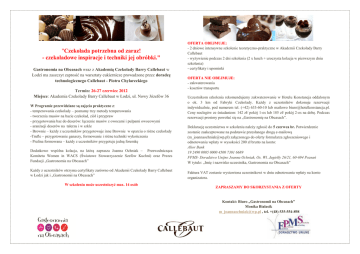 "Czekolada potrzebna od zaraz! - czekoladowe inspiracje i techniki jej obróbki." Gastronomia na Obcasach wraz z Akademią Czekolady Barry Callebaut w Łodzi ma zaszczyt zaprosić na warsztaty cukiernicze prowadzone przez doradcę technologicznego Callebaut - Piotra Chylareckiego Termin: 26-27 czerwiec 2012 Miejsce: Akademia Czekolady Barry Callebaut w Łodzi, ul. Nowy Józefów 36 W Programie przewidziane są zajęcia praktyczne z: - temperowania czekolady – poznamy trzy metody temperowania - tworzenia musów na bazie czekolad, ziół i przypraw - przygotowania baz do deserów: łączenie musów z owocami i pulpami owocowymi - aranżacji deserów na talerzu i w szkle - Brownie – każdy z uczestników przygotowuje inne Brownie w oparciu o różne czekolady -Trufle – przygotowanie ganaszy, formowanie i różne techniki wykończenia - Pralina formowana – każdy z uczestników przygotuje jedną foremkę Dodatkowo wspólna kolacja, na którą zaprasza Joanna Ochniak – Przewodnicząca Komitetu Women in WACS (Światowe Stowarzyszenie Szefów Kuchni) oraz Prezes Fundacji „Gastronomia na Obcasach” Każdy z uczestników otrzyma certyfikaty zarówno od Akademii Czekolady Barry Callebaut w Łodzi jak i „Gastronomii na Obcasach” W szkoleniu może uczestniczyć max. 14 osób OFERTA OBEJMUJE: - 2 dniowe intensywne szkolenie teoretyczno-praktyczne w Akademii Czekolady Barry Callebaut - wyżywienie podczas 2 dni szkolenia (2 x lunch + uroczysta kolacja w pierwszym dniu szkolenia) - certyfikaty i upominki OFERTA NIE OBEJMUJE: - zakwaterowania - kosztów transportu Uczestnikom szkolenia rekomendujemy zakwaterowanie w Hotelu Konstancja oddalonym o ok. 3 km od Fabryki Czekolady. Każdy z uczestników dokonuje rezerwacji indywidualnie, pod numerem tel. (+42) 633-60-10 lub mailowo [email protected]. Ceny noclegów ze śniadaniem: 142 zł/ pokój 1-os lub 185 zł/ pokój 2-os na dobę. Podczas rezerwacji prosimy powołać się na „Gastronomię na Obcasach”. Deklarację uczestnictwa w szkoleniu należy zgłosić do 5 czerwca br. Potwierdzenie zostanie zaakceptowane na podstawie przesłanego drogą e-mailową ([email protected]) załączonego do oferty formularza zgłoszeniowego i odnotowaniu wpłaty w wysokości 200 zł brutto na konto: Alior Bank 19 2490 0005 0000 4500 7301 6689 FPMS- Doradztwo Unijne Joanna Ochniak, Os. Wł. Jagiełły 26/21, 60-694 Poznań W tytule: „Imię i nazwisko uczestnika, Gastronomia na Obcasach” Faktura VAT zostanie wystawiona uczestnikowi w dniu odnotowania wpłaty na konto organizatora. ZAPRASZAMY DO SKORZYSTANIA Z OFERTY Kontakt: Biuro „Gastronomii na Obcasach” Monika Białasik [email protected] , tel. +(48) 535-554-898