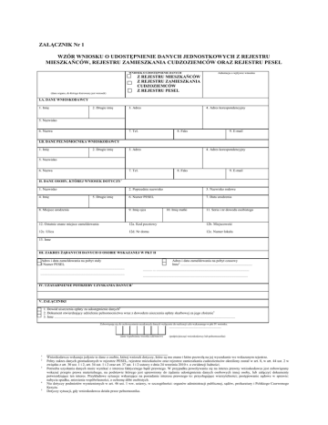 ZAŁĄCZNIK Nr 1 WZÓR WNIOSKU O UDOSTĘPNIENIE DANYCH JEDNOSTKOWYCH Z REJESTRU MIESZKAŃCÓW, REJESTRU ZAMIESZKANIA CUDZOZIEMCÓW ORAZ REJESTRU PESEL WNIOSEK O UDOSTĘPNIENIE DANYCH Z REJESTRU MIESZKAŃCÓW Z REJESTRU ZAMIESZKANIA CUDZOZIEMCÓW Z REJESTRU PESEL (dane organu, do którego kierowany jest wniosek) Adnotacja o wpływie wniosku I.A. DANE WNIOSKODAWCY 1. Imię 2. Drugie imię 3. Adres 4. Adres korespondencyjny 5. Nazwisko 6. Nazwa 7. Tel. 8. Faks 9. E-mail I.B. DANE PEŁNOMOCNIKA WNIOSKODAWCY 1. Imię 2. Drugie imię 3. Adres 4. Adres korespondencyjny 5. Nazwisko 6. Nazwa 7. Tel. 8. Faks 9. E-mail II. DANE OSOBY, KTÓREJ WNIOSEK DOTYCZY1 1. Nazwisko 4. Imię 5. Drugie imię 2. Poprzednie nazwisko 3. Nazwisko rodowe 6. Numer PESEL 7. Data urodzenia 8. Miejsce urodzenia 9. Imię ojca 10. Imię matki 12. Ostatnie znane miejsce zameldowania 12a. Kod pocztowy 12b. Miejscowość 12c. Ulica 12d. Nr domu 12e. Numer lokalu 11. Seria i nr dowodu osobistego 13. Inne III. ZAKRES ŻĄDANYCH DANYCH O OSOBIE WSKAZANEJ W PKT II Adres i data zameldowania na pobyt stały đ Numer PESEL .............................................................................................. .............................................................................................. Adres i data zameldowania na pobyt czasowy Inne2 ................................................................................ .......... ... ........................................................................................................ ..................................................................................................................... IV. UZASADNIENIE POTRZEBY UZYSKANIA DANYCH3 V. ZAŁĄCZNIKI đ 1. Dowód uiszczenia opłaty za udostępnienie danych4 đ 2. Dokument stwierdzający udzielenie pełnomocnictwa wraz z dowodem uiszczenia opłaty skarbowej za jego złożenie5 3. Inne .......................................................................................................................................................................................................... Zobowiązuję się do wykorzystania uzyskanych danych wyłącznie do realizacji celu wykazanego w pkt IV wniosku. ..................................................................... (data wypełnienia wniosku (dd/mm/rr) (podpis/pieczęć wnioskodawcy lub pełnomocnika) ____________________________________________ 1 2 3 4 5 Wnioskodawca wskazuje jedynie te dane o osobie, której wniosek dotyczy, które są mu znane i które pozwolą na jej wyszukanie we wskazanym rejestrze. Pełny zakres danych gromadzonych w rejestrze PESEL, rejestrze mieszkańców oraz rejestrze zamieszkania cudzoziemców określony został w art. 8, w art. 44 ust. 2 w związku z art. 30 ust. 1 i 2, art. 34 ust. 1 i 2 oraz art. 37 ust. 1 i 2 ustawy z dnia 24 września 2010 r. o ewidencji ludności. Potrzeba uzyskania danych może wynikać z interesu faktycznego bądź prawnego. W przypadku powoływania się na interes prawny wnioskodawca jest zobowiązany wskazać przepis prawa materialnego, na podstawie którego jest uprawniony do żądania udostępnienia danych osobowych innej osoby, lub załączyć dokumenty potwierdzające ten interes. Przykładowe sytuacje wskazujące na posiadanie interesu prawnego to: przysługujące wierzytelności; postępowanie sądowe w sprawie: nabycia spadku, zniesienia współwłasności, o ochronę dóbr osobistych. Nie dotyczy podmiotów wymienionych w art. 46 ust. 1 ww. ustawy, w szczególności: organów administracji publicznej, sądów, prokuratury i Polskiego Czerwonego Krzyża. Dotyczy sytuacji, gdy wnioskodawca działa przez pełnomocnika.