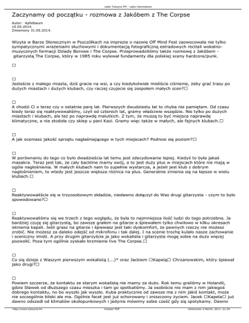radio Toksyna FM - radio internetowe Zaczynamy od początku - rozmowa z Jakóbem z The Corpse Autor: Apfelbaum 10.05.2014. Zmieniony 31.05.2014. Wizyta w Barze Słonecznym w Pszczółkach na imprezie o nazwie Off Mind Fest zaowocowała nie tylko sympatycznymi wrażeniami słuchowymi i dokumentacją fotograficzną estradowych recitali wokalnomuzycznych formacji Dziady Borowe i The Corpse. Przeprowadziliśmy także rozmowę z Jakóbem gitarzystą The Corpse, który w 1985 roku wylewał fundamenty dla polskiej sceny hardcore/punk. Jesteście z małego miasta, dziś gracie na wsi, a czy kiedykolwiek mieliście ciśnienie, żeby grać trasy po dużych miastach i dużych klubach, czy raczej czujecie się zespołem małych scen? A chodzi Ci o teraz czy o ostatnie parę lat. Pierwszych dwudziestu lat to chyba nie pamiętam. Od czasu kiedy teraz się reaktywowaliśmy, czyli od czterech lat, gramy właściwie wszędzie. Nie tylko po dużych miastach i klubach, ale też po naprawdę malutkich. Z tym, że muszą to być miejsca naprawdę klimatyczne, a nie stodoła czy sklep u pani Kazi. Gramy więc także w małych, ale fajnych klubach. A jak oceniasz jakość sprzętu nagłaśniającego w tych miejscach? Podnosi się poziom? W porównaniu do tego co było dwadzieścia lat temu jest zdecydowanie lepiej. Kiedyś to była jakaś masakra. Teraz jest tak, że cały backline mamy swój, a to jest duży plus w miejscach które nie mają w ogóle nagłośnienia. W małych klubach nam to zupełnie wystarcza, a jeżeli jest klub z dobrym nagłośnieniem, to wtedy jest jeszcze większa różnica na plus. Generalnie zmienia się na lepsze w wielu klubach. Reaktywowaliście się w trzyosobowym składzie, niedawno dołączył do Was drugi gitarzysta - czym to było spowodowane? Reaktywowaliśmy się we trzech z tego względu, że była to najmniejsza ilość ludzi do tego potrzebna. Ja bardziej czuję się gitarzystą, bo zawsze grałem na gitarze a śpiewałem tylko chwilowo w kilku okresach istnienia kapeli. Jeśli grasz na gitarze i śpiewasz jest taki dyskomfort, że pewnych rzeczy nie możesz zrobić. Nie możesz za daleko odejść od mikrofonu i tak dalej. I na scenie trochę kulało nasze zachowanie i sceniczny imidż. A przy drugim gitarzyście ja jako wokalista i gitarzysta mogę sobie na dużo więcej pozwolić. Poza tym ogólnie zyskało brzmienie live The Corpse. Co się dzieje z Waszym pierwszym wokalistą (...)* oraz Jackiem Kapelą Chrzanowskim, który śpiewał jako drugi? Powiem szczerze, że kontaktu ze starym wokalistą nie mamy za dużo. Rok temu graliśmy w Holandii, gdzie Sławek od dłuższego czasu mieszka i tam go spotkaliśmy. Ja osobiście nie mam z nim jakiegoś dobrego kontaktu, no bo wyszło jak wyszło. Kuba praktycznie od zawsze ma z nim jakiś kontakt, może nie szczególnie bliski ale ma. Ogólnie facet jest już schorowany i zniszczony życiem. Jacek Kapela już dawno odszedł od klimatów okołopunkowych i jedynie mówimy sobie cześć gdy się spotykamy. Dawno http://www.toksyna.fm Kreator PDF Utworzono 2 March, 2017, 21:29 radio Toksyna FM - radio internetowe już nie rozmawialiśmy na jakieś dotyczące nas tematy. W wywiadzie dołączonym do winyla mówisz, że na początku inspiracją dla Ciebie było Suicidal tendencies, Accused, Larm, a co jest nią dla Ciebie dzisiaj? Wiesz, u mnie to się za bardzo nie zmieniło, bo w dalszym ciągu słucham tych samych kapel plus kilka nowych, które się pojawiły i można ich gdzieś posłuchać. Naszą inspiracją w tej chwili nie są jakieś określone kapele, bo tak ja słucham oldschoolowego hardcore'a, sceny nowojorskiej, bostońskiej czy z Los Angeles. Drugi gitarzysta słucha całkiem innej muzyki, on jest wychowany w środowisku thrashowym, więc jakieś Mega Deathy, Slayery i te sprawy. Perkusista jest wychowany w grindcore'owym światku, więc słucha Napalm Death czy Extreme Noise Terror itd. A znowu basista siedzi w jakimś starszym punku, czyli Discharge, Broken Bones. Także u nas jest zlepek wszystkich stylów jakie mogą być w muzyce undergroundowej. Czyli koszulka Terroru, w której często się pokazujesz nie jest jedynym tropem? Nie, nie, broń Boże. Ogólnie kocham tę kapelę, bo naprawdę jakoś mnie rusza to co oni robią i podoba mi się bardzo. Zauważ, że każdy z nas, dziś na scenie będzie inaczej ubrany i prezentował odmienny styl. Jak oceniasz współczesną polską scenę hardcore? Czy coś interesującego w niej znajdujesz? Wiesz co, jest parę fajnych kapel. Przez ostatnie cztery lata zagraliśmy z masą polskich kapel, część z nich niestety już padła lub zawiesiła działalność, ale w większości były to bardzo fajne kapele. Nie będę wymieniał nazw, bo mogę kogoś pominąć. Jest naprawdę dużo młodych dobrych kapel, które zasługują na to, żeby gdzieś je zapraszać i żeby grały sobie po całej Polsce, bo naprawdę wstydu nie ma. Nawet w porównaniu do tych amerykańskich kapel, z którymi gdzieś tam gramy, to szczerze mówiąc one grają jako gwiazdy tylko dlatego, że są z zagranicy. A te polskie kapele, które z nimi czy z nami grają naprawdę nie mają się czego wstydzić. To są naprawdę fajne kapelki. Zatem generalnie jest lepiej niż gorzej? Scena trochę kuleje, z tego względu, że mało osób przychodzi na koncerty. Nie oszukujmy się, ludzie są teraz trochę rozleniwieni co do chodzenia na koncerty. Wolą tego posłuchać na jutubie, ale ogólnie jest okej. Od zawsze śpiewaliście po polsku, dziś wiele kapel posługuje się jedynie angielskim. Jakie jest Twoje podejście do kwestii języka w punk rocku? http://www.toksyna.fm Kreator PDF Utworzono 2 March, 2017, 21:29 radio Toksyna FM - radio internetowe Ja grałem w kapelach, które śpiewały i po polsku i po angielsku, także nie wypowiem się co jest lepsze, bo w jakim języku śpiewasz nie jest chyba ważne. Przecież wiadomo, że jeśli ktoś zaśpiewa po polsku, to w Polsce każdy zrozumie, a znow
