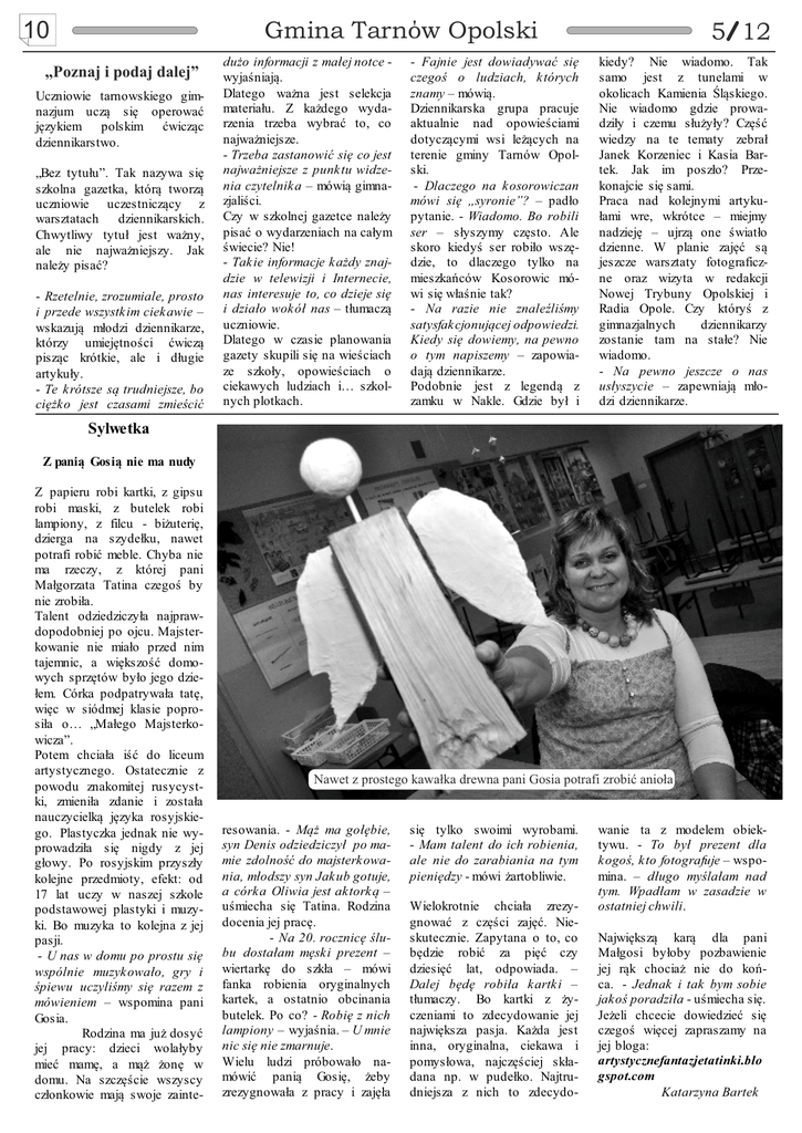 10 Gmina Tarnow Opolski ‰Poznaj i podaj dalej‘ „Poznaj i podaj dalej” Uczniowie tarnowskiego gimnazjum uczą się operować językiem polskim ćwicząc dziennikarstwo. „Bez tytułu”. Tak nazywa się szkolna gazetka, którą tworzą uczniowie uczestniczący z warsztatach dziennikarskich. Chwytliwy tytuł jest ważny, ale nie najważniejszy. Jak należy pisać? - Rzetelnie, zrozumiale, prosto i przede wszystkim ciekawie – wskazują młodzi dziennikarze, którzy umiejętności ćwiczą pisząc krótkie, ale i długie artykuły. - Te krótsze są trudniejsze, bo ciężko jest czasami zmieścić dużo informacji z małej notce wyjaśniają. Dlatego ważna jest selekcja materiału. Z każdego wydarzenia trzeba wybrać to, co najważniejsze. - Trzeba zastanowić się co jest najważniejsze z punktu widzenia czytelnika – mówią gimnazjaliści. Czy w szkolnej gazetce należy pisać o wydarzeniach na całym świecie? Nie! - Takie informacje każdy znajdzie w telewizji i Internecie, nas interesuje to, co dzieje się i działo wokół nas – tłumaczą uczniowie. Dlatego w czasie planowania gazety skupili się na wieściach ze szkoły, opowieściach o ciekawych ludziach i… szkolnych plotkach. - Fajnie jest dowiadywać się czegoś o ludziach, których znamy – mówią. Dziennikarska grupa pracuje aktualnie nad opowieściami dotyczącymi wsi leżących na terenie gminy Tarnów Opolski. - Dlaczego na kosorowiczan mówi się „syronie”? – padło pytanie. - Wiadomo. Bo robili ser – słyszymy często. Ale skoro kiedyś ser robiło wszędzie, to dlaczego tylko na mieszkańców Kosorowic mówi się właśnie tak? - Na razie nie znaleźliśmy satysfakcjonującej odpowiedzi. Kiedy się dowiemy, na pewno o tym napiszemy – zapowiadają dziennikarze. Podobnie jest z legendą z zamku w Nakle. Gdzie był i 5 12 kiedy? Nie wiadomo. Tak samo jest z tunelami w okolicach Kamienia Śląskiego. Nie wiadomo gdzie prowadziły i czemu służyły? Część wiedzy na te tematy zebrał Janek Korzeniec i Kasia Bartek. Jak im poszło? Przekonajcie się sami. Praca nad kolejnymi artykułami wre, wkrótce – miejmy nadzieję – ujrzą one światło dzienne. W planie zajęć są jeszcze warsztaty fotograficzne oraz wizyta w redakcji Nowej Trybuny Opolskiej i Radia Opole. Czy któryś z gimnazjalnych dziennikarzy zostanie tam na stałe? Nie wiadomo. - Na pewno jeszcze o nas usłyszycie – zapewniają młodzi dziennikarze. Sylwetka Z panią Gosią nie ma nudy Z papieru robi kartki, z gipsu robi maski, z butelek robi lampiony, z filcu - biżuterię, dzierga na szydełku, nawet potrafi robić meble. Chyba nie ma rzeczy, z której pani Małgorzata Tatina czegoś by nie zrobiła. Talent odziedziczyła najprawdopodobniej po ojcu. Majsterkowanie nie miało przed nim tajemnic, a większość domowych sprzętów było jego dziełem. Córka podpatrywała tatę, więc w siódmej klasie poprosiła o… „Małego Majsterkowicza”. Potem chciała iść do liceum artystycznego. Ostatecznie z powodu znakomitej rusycystki, zmieniła zdanie i została nauczycielką języka rosyjskiego. Plastyczka jednak nie wyprowadziła się nigdy z jej głowy. Po rosyjskim przyszły kolejne przedmioty, efekt: od 17 lat uczy w naszej szkole podstawowej plastyki i muzyki. Bo muzyka to kolejna z jej pasji. - U nas w domu po prostu się wspólnie muzykowało, gry i śpiewu uczyliśmy się razem z mówieniem – wspomina pani Gosia. Rodzina ma już dosyć jej pracy: dzieci wolałyby mieć mamę, a mąż żonę w domu. Na szczęście wszyscy członkowie mają swoje zainte- Nawet z prostego kawałka drewna pani Gosia potrafi zrobić anioła resowania. - Mąż ma gołębie, syn Denis odziedziczył po mamie zdolność do majsterkowania, młodszy syn Jakub gotuje, a córka Oliwia jest aktorką – uśmiecha się Tatina. Rodzina docenia jej pracę. - Na 20. rocznicę ślubu dostałam męski prezent – wiertarkę do szkła – mówi fanka robienia oryginalnych kartek, a ostatnio obcinania butelek. Po co? - Robię z nich lampiony – wyjaśnia. – U mnie nic się nie zmarnuje. Wielu ludzi próbowało namówić panią Gosię, żeby zrezygnowała z pracy i zajęła się tylko swoimi wyrobami. - Mam talent do ich robienia, ale nie do zarabiania na tym pieniędzy - mówi żartobliwie. Wielokrotnie chciała zrezygnować z części zajęć. Nieskutecznie. Zapytana o to, co będzie robić za pięć czy dziesięć lat, odpowiada. – Dalej będę robiła kartki – tłumaczy. Bo kartki z życzeniami to zdecydowanie jej największa pasja. Każda jest inna, oryginalna, ciekawa i pomysłowa, najczęściej składana np. w pudełko. Najtrudniejsza z nich to zdecydo- wanie ta z modelem obiektywu. - To był prezent dla kogoś, kto fotografuje – wspomina. – długo myślałam nad tym. Wpadłam w zasadzie w ostatniej chwili. Największą karą dla pani Małgosi byłoby pozbawienie jej rąk chociaż nie do końca. - Jednak i tak bym sobie jakoś poradziła - uśmiecha się. Jeżeli chcecie dowiedzieć się czegoś więcej zapraszamy na jej bloga: artystycznefantazjetatinki.blo gspot.com Katarzyna Bartek