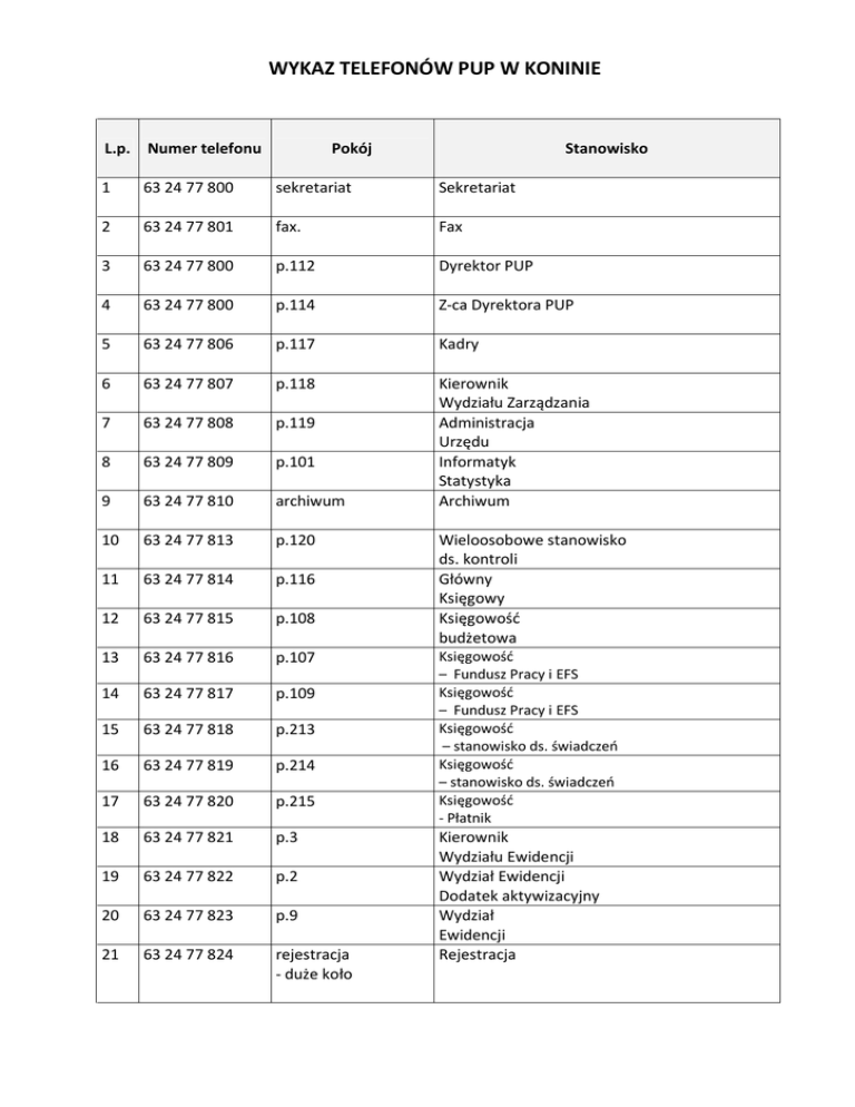 WYKAZ TELEFONÓW PUP W KONINIE L.p. Numer telefonu Pokój Stanowisko 1 63 24 77 800 sekretariat Sekretariat 2 63 24 77 801 fax. Fax 3 63 24 77 800 p.112 Dyrektor PUP 4 63 24 77 800 p.114 Z-ca Dyrektora PUP 5 63 24 77 806 p.117 Kadry 6 63 24 77 807 p.118 7 63 24 77 808 p.119 8 63 24 77 809 p.101 9 63 24 77 810 archiwum Kierownik Wydziału Zarządzania Administracja Urzędu Informatyk Statystyka Archiwum 10 63 24 77 813 p.120 11 63 24 77 814 p.116 12 63 24 77 815 p.108 13 63 24 77 816 p.107 14 63 24 77 817 p.109 15 63 24 77 818 p.213 16 63 24 77 819 p.214 17 63 24 77 820 p.215 18 63 24 77 821 p.3 19 63 24 77 822 p.2 20 63 24 77 823 p.9 21 63 24 77 824 rejestracja - duże koło Wieloosobowe stanowisko ds. kontroli Główny Księgowy Księgowość budżetowa Księgowość – Fundusz Pracy i EFS Księgowość – Fundusz Pracy i EFS Księgowość – stanowisko ds. świadczeń Księgowość – stanowisko ds. świadczeń Księgowość - Płatnik Kierownik Wydziału Ewidencji Wydział Ewidencji Dodatek aktywizacyjny Wydział Ewidencji Rejestracja 22 63 24 77 825 23 63 24 77 826 24 63 24 77 827 wyrejestrowania - duże koło składnica akt p.5 25 63 24 77 828 p.4 26 63 24 77 830 28 63 24 77 834 pośrednictwo pracy - małe koło p.105 29 63 24 77 837 p.126 30 63 24 77 838 p.125 31 63 24 77 839 p.127 32 63 24 77 840 p.100 33 63 24 77 842 p.103 34 63 24 77 843 p.104 35 63 24 77 844 p.223 36 63 24 77 845 p.106 Wyrejestrowania Składnica akt Kierownik Wydziału Pośrednictwa Pracy i Poradnictwa Zawodowego Wydział Pośrednictwa Pracy i Poradnictwa Zawodowego Pośrednictwo pracy dla osób bezrobotnych i poszukujących pracy - Przygotowanie zawodowe dorosłych - Stypendium z tytułu podjęcia dalszej nauki - Dofinansowanie do studiów podyplomowych - Bon na zasiedlenie Kierownik Wydziału Rynku Pracy Kierownik Wydziału Rozwoju Zawodowego - Staże - Bon stażowy Specjalista ds. programów - Dotacje dla osób bezrobotnych na rozpoczęcie działalności gospodarczej - Program Aktywizacja i Integracja - Zwrot kosztów dojazdów do pracy i na zajęcia z aktywnego poszukiwania pracy - Prace interwencyjne - Prace społecznie użyteczne - Bon zatrudnieniowy - Szkolenia - Bon szkoleniowy - Pożyczki szkoleniowe - Krajowy Fundusz Szkoleniowy - Roboty publiczne - Refundacja kosztów za skierowanego bezrobotnego do 30 roku życia - Refundacja składek ZUS – spółdzielnie socjalne - Wyposażenie lub doposażenie stanowiska pracy - Świadczenia aktywizacyjne - Refundacje ZUS za osoby bezrobotne zatrudnione po raz pierwszy w życiu, - Refundacja kosztów opieki nad dzieckiem do lat 7 lub osobą zależną - Dofinansowanie zatrudnienia osób bezrobotnych powyżej 50 r. życia - Refundacja składek KRUS, - Grant – telepraca - Agencje Zatrudnienia