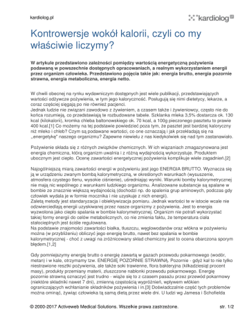 kardiolog.pl Kontrowersje wokół kalorii, czyli co my właściwie liczymy? W artykule przedstawiono zależności pomiędzy wartością energetyczną pożywienia podawaną w powszechnie dostępnych opracowaniach, a realnym wykorzystaniem energii przez organizm człowieka. Przedstawiono pojęcia takie jak: energia brutto, energia pozornie strawna, energia metaboliczna, energia netto. W chwili obecnej na rynku wydawniczym dostępnych jest wiele publikacji, przedstawiających wartości odżywcze pożywienia, w tym jego kaloryczność. Posługują się nimi dietetycy, lekarze, a coraz częściej sięgają po nie również pacjenci. Jednak ludzie nie związani zawodowo z żywieniem, a czasem także i żywieniowcy, często nie do końca rozumieją, co przedstawiają te rozbudowane tabele. Szklanka mleka 3,5% dostarcza ok. 130 kcal (kilokalorii), kromka chleba baltonowskiego ok. 70 kcal, a 100g pieczonego pasztetu to prawie 400 kcal.[1] Co możemy na tej podstawie powiedzieć poza tym, że pasztet jest bardziej kaloryczny niż mleko i chleb? Czym są podawane wartości, co one oznaczają i jak przekładają się na ,,energetykę" naszego organizmu? Zapewne niewielu z nas kiedykolwiek się nad tym zastanawiało. Pożywienie składa się z różnych związków chemicznych. W ich wiązaniach zmagazynowana jest energia chemiczna, którą organizm uwalnia i z różną wydajnością wykorzystuje. Produktem ubocznym jest ciepło. Ocenę zawartości energetycznej pożywienia komplikuje wiele zagadnień.[2] Najogólniejszą miarą zawartości energii w pożywieniu jest jego ENERGIA BRUTTO. Wyznacza się ją w urządzeniu zwanym bombą kalorymetryczną, w określonych warunkach (wysuszenie, atmosfera czystego tlenu, wysokie ciśnienie), uśredniając wyniki. Warunki bomby kalorymetrycznej nie mają nic wspólnego z warunkami ludzkiego organizmu. Analizowane substancje są spalane w bombie ze znacznie większą wydajnością (dochodzi np. do spalenia grup aminowych, podczas gdy człowiek wydala je w formie mocznika i nie uzyskuje z nich energii). Zaletą metody jest standaryzacja i obiektywizacja pomiaru. Jednak wartości te w istocie wcale nie odzwierciedlają energii uzyskiwanej przez nasze organizmy z pożywienia. Jest to energia wyzwolona jako ciepło spalania w bombie kalorymetrycznej. Organizm nie potrafi wykorzystać takiej formy energii do celów metabolicznych, co nie zmienia faktu, że temperatura ciała stałocieplnych jest ściśle regulowana. Na podstawie znajomości zawartości białka, tłuszczu, węglowodanów oraz włókna w pożywieniu można (w przybliżeniu) obliczyć jego energię brutto, nawet bez spalania w bombie kalorymetrycznej - choć z uwagi na zróżnicowany skład chemiczny jest to ocena obarczona sporym błędem.[1,2] Gdy pomniejszymy energię brutto o energię zawartą w gazach przewodu pokarmowego (wodór, metan) i w kale, otrzymamy tzw. ENERGIĘ POZORNIE STRAWNĄ. Pozornie - gdyż kał to nie tylko niestrawione resztki pożywienia, ale także soki trawienne, flora bakteryjna (kilkadziesiąt procent masy), produkty przemiany materii, złuszczone nabłonki przewodu pokarmowego. Energię pozornie strawną oznaczyć jest trudno - wiąże się to z czasem pasażu przez przewód pokarmowy (niektóre składniki nawet 7 dni), zmienną częstością wypróżnień, wpływem włókien ograniczających wchłanianie składników pożywienia i in.[3] Doświadczalnie część tych problemów można ominąć, żywiąc człowieka tą samą dietą przez wiele dni. U ludzi wg Jamesa i Schofielda © 2000-2017 Activeweb Medical Solutions. Wszelkie prawa zastrzeżone. str. 1/2 kardiolog.pl strawność energii pożywienia wynosi ok. 96% (cyt. za [2]). Fakt dostarczenia składnika pokarmowego do przewodu pokarmowego nie oznacza, że składnik ów będzie spalony. Grupy aminowe białek wydalane są jako mocznik (w przeciwnym razie powstawałby kwas azotowy), a niektórych związków organizm nie potrafi wykorzystać. Stosuje się zatem pojęcie ENERGII METABOLICZNEJ (ME) pożywienia, czyli tej jej części, która jest dostępna do wykorzystania przez organizm. ME definiuje się jako energię strawną minus ciepło spalania moczu wydalonego przy żywieniu daną dietą. Z badań Jamesa i Schofielda wynika, że przy przeciętnej diecie energia metaboliczna stanowi 91% energii brutto. Ale zdarza się, że rozpiętość wartości ME podawanych dla tych samych produktów wynosi od 20 do 270%.[2] Żaden szlak metaboliczny nie przebiega ze 100% wydajnością. W czasie procesów metabolicznych uwalnia się energia cieplna, której organizm nie potrafi wykorzystać. Sam fakt spożycia pożywienia (nawet szklanki wody) indukuje termogenezę (wytwarzanie ciepła); ma ona znaczenie w bilansie energii, a trudno ją dobrze oszacować. Odejmując od ME energię cieplną wyzwoloną w procesach metabolicznych otrzymujemy ENERGIĘ NETTO pożywienia, czyli tą, która faktycznie jest wykorzystana na pokrycie naszych potrzeb energetycznych. Miarą energii netto pożywienia może być w badaniach naukowych tłuszcz, zaoszczędzony w wyniku spożycia pożywienia.[4] Wcześniej organizm musi być jednak w stanie niedożywienia (brak zapasów glikogenu). Model taki ma jednak swoje ograniczenia. Dopiero energia netto mówi, jaka część dostarczonej energii faktycznie została wykorzystana przez organizm.[5] Jaki wniosek płynie z tych rozważań? Czy powinniśmy zarzucić liczenie kalorii jako czegoś nieprawdziwego, czy wręcz fałszywego? Czy fachowe publikacje namawiające do liczenia kalorii są zwykłym nadużyciem? Oczywiście - nie. Tabele zawartości kalorii w pożywieniu są potrzebne, ponieważ dostarczają pewnego obiektywnego punktu odniesienia dla wszystkich zainteresowanych. Z nich odczytujemy, że boczek dostarcza więcej energii niż szynka, a banan więcej niż jabłko. A zatem jeśli chcemy się odchudzić - lepiej wybrać szynkę oraz jabłko. Jednak warto wiedzieć, choćby dla własnej satysfakcji,