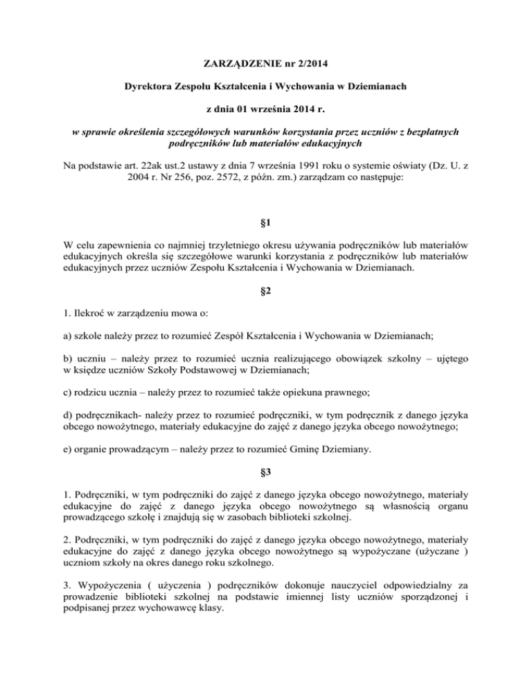 ZARZĄDZENIE nr 2/2014 Dyrektora Zespołu Kształcenia i Wychowania w Dziemianach z dnia 01 września 2014 r. w sprawie określenia szczegółowych warunków korzystania przez uczniów z bezpłatnych podręczników lub materiałów edukacyjnych Na podstawie art. 22ak ust.2 ustawy z dnia 7 września 1991 roku o systemie oświaty (Dz. U. z 2004 r. Nr 256, poz. 2572, z późn. zm.) zarządzam co następuje: §1 W celu zapewnienia co najmniej trzyletniego okresu używania podręczników lub materiałów edukacyjnych określa się szczegółowe warunki korzystania z podręczników lub materiałów edukacyjnych przez uczniów Zespołu Kształcenia i Wychowania w Dziemianach. §2 1. Ilekroć w zarządzeniu mowa o: a) szkole należy przez to rozumieć Zespół Kształcenia i Wychowania w Dziemianach; b) uczniu – należy przez to rozumieć ucznia realizującego obowiązek szkolny – ujętego w księdze uczniów Szkoły Podstawowej w Dziemianach; c) rodzicu ucznia – należy przez to rozumieć także opiekuna prawnego; d) podręcznikach- należy przez to rozumieć podręczniki, w tym podręcznik z danego języka obcego nowożytnego, materiały edukacyjne do zajęć z danego języka obcego nowożytnego; e) organie prowadzącym – należy przez to rozumieć Gminę Dziemiany. §3 1. Podręczniki, w tym podręczniki do zajęć z danego języka obcego nowożytnego, materiały edukacyjne do zajęć z danego języka obcego nowożytnego są własnością organu prowadzącego szkołę i znajdują się w zasobach biblioteki szkolnej. 2. Podręczniki, w tym podręczniki do zajęć z danego języka obcego nowożytnego, materiały edukacyjne do zajęć z danego języka obcego nowożytnego są wypożyczane (użyczane ) uczniom szkoły na okres danego roku szkolnego. 3. Wypożyczenia ( użyczenia ) podręczników dokonuje nauczyciel odpowiedzialny za prowadzenie biblioteki szkolnej na podstawie imiennej listy uczniów sporządzonej i podpisanej przez wychowawcę klasy. 4. Podręczniki na dany rok szkolny są wypożyczane w dniu i w godzinach uzgodnionych pomiędzy nauczycielem odpowiedzialnym za prowadzenie biblioteki szkolnej a wychowawcą klasy. Zapis ten stosuje się również do zwrotu podręczników. 5. Podręczniki są wypożyczane ( użyczane) uczniom nie później, niż do dnia 14 września danego roku szkolnego. 6. Wypożyczenie podręcznika może nastąpić również w innym terminie, w trakcie danego roku szkolnego. §6 Podręczniki podlegają zwrotowi do biblioteki szkolnej w przypadku skreślenia ucznia z księgi uczniów, przeniesienia ucznia do innej szkoły lub w przypadku innych zdarzeń losowych. §7 1. Po zakończeniu zajęć dydaktycznych w szkole uczniowie zwracają podręczniki do biblioteki szkolnej. Zwrot następuję nie później niż do 15 lipca danego roku. Uczniowie przystępujący do egzaminu klasyfikacyjnego, sprawdzającego lub poprawkowego zwracają podręcznik nie później niż do końca sierpnia danego roku. 2. Nadzór nad zadaniem, o którym mowa w ust.1 realizuje wychowawca ucznia oraz nauczyciel odpowiedzialny za prowadzenie biblioteki szkolnej. 3. Podczas zwrotu podręcznika do biblioteki- nauczyciele, o których mowa w ust.2 dokonują oględzin podręcznika, określając stopień jego zużycia. 4. W przypadku zgubienia podręcznika, znacznego zużycia, wykraczającego poza jego zwykle używanie, bądź jego zniszczenia, rodzice są zobowiązani do zwrotu kosztów zakupu nowego podręcznika. Wpłaty dokonuje się na konto szkoły. §8 1. Uczniowie są zobowiązani do używania podręcznika zgodnie z jego przeznaczeniem, do zachowania troski o jego walor użytkowy i estetyczny, do chronienia go przed zniszczeniem, bądź zagubieniem. 2. W przypadku zniszczenia lub zagubienia podręcznika uczeń lub rodzic jest zobowiązany poinformować nauczyciela wychowawcę i nauczyciela odpowiedzialnego za prowadzenie biblioteki szkolnej. §9 Zobowiązuje się nauczycieli wychowawców do zapoznania uczniów i ich rodziców z niniejszym zarządzeniem. §10 1. Zarządzenie ma zastosowanie: a) w roku szkolnym 2014/2015 do uczniów klas 1 szkoły podstawowej, b) w roku szkolnym 2015/2016 do uczniów klas 1,2 i 4 szkoły podstawowej, c) w roku szkolnym 2016/2017 do uczniów klas 1-5 szkoły podstawowej. 2. Począwszy od roku szkolnego 2017/2018 zarządzenie ma zastosowanie do uczniów wszystkich klas szkoły podstawowej. §11 Zarządzenie podlega ogłoszeniu na szkolnej tablicy ogłoszeń oraz na stronie internetowej szkoły. §12 Zarządzenie wchodzi w życie z dniem podpisania. Dyrektor Zespołu Kształcenia i Wychowania w Dziemianach