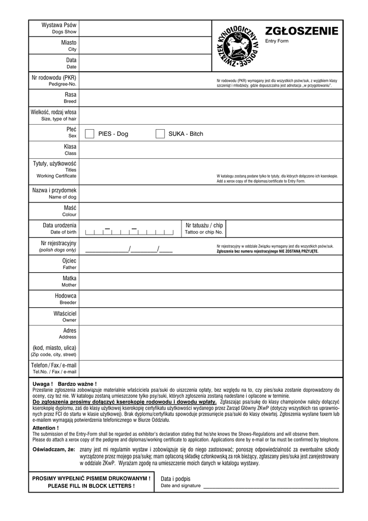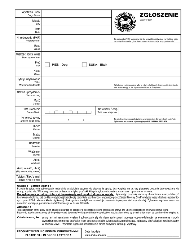 Wystawa Psów ZGŁOSZENIE Dogs Show Entry Form Miasto City Data Date Nr rodowodu (PKR) Nr rodowodu (PKR) wymagany jest dla wszystkich psów/suk, z wyjątkiem klasy szczeniąt i młodzieży, gdzie dopuszczalna jest adnotacja „w przygotowaniu”. Pedigree-No. Rasa Breed Wielkość, rodzaj włosa Size, type of hair Płeć Sex PIES - Dog SUKA - Bitch Klasa Class Tytuły, użytkowość Titles Working Certificate W katalogu zostaną podane tylko te tytuły, dla których dołączono ich kserokopie. Add a xerox copy of the diplomas/certificate to Entry Form. Nazwa i przydomek Name of dog Maść Colour Data urodzenia Nr tatuażu / chip Date of birth Tattoo or chip No. Nr rejestracyjny (polish dogs only) _____________/________/____ Nr rejestracyjny w oddziale Związku wymagany jest dla wszystkich psów/suk. Zgłoszenia bez numeru rejestracyjnego NIE ZOSTANĄ PRZYJĘTE. Ojciec Father Matka Mother Hodowca Breeder Właściciel Owner Adres Address (kod, miasto, ulica) (Zip code, city, street) Telefon / Fax / e-mail Tel.No. / Fax / e-mail Uwaga ! Bardzo ważne ! Przesłanie zgłoszenia zobowiązuje materialnie właściciela psa/suki do uiszczenia opłaty, bez względu na to, czy pies/suka zostanie doprowadzony do oceny, czy też nie. W katalogu zostaną umieszczone tylko psy/suki, których zgłoszenia zostaną nadesłane i opłacone w terminie. Do zgłoszenia prosimy dołączyć kserokopię rodowodu i dowodu wpłaty. Zgłaszając psa/sukę do klasy championów należy dołączyć kserokopię dyplomu, zaś do klasy użytkowej kserokopię certyfikatu użytkowości wydanego przez Zarząd Główny ZKwP (dotyczy wszystkich ras uprawnionych przez FCI do startu w klasie użytkowej). Brak dyplomu/certyfikatu spowoduje przesunięcie psa/suki do klasy otwartej. Zgłoszenia wysłane faxem lub e-mailem wymagają potwierdzenia telefonicznego w Biurze Oddziału. Attention ! The submission of the Entry-Form shall be regarded as exhibitor’s declaration stating that he/she knows the Shows-Regulations and will observe them. Please do attach a xerox copy of the pedigree and diplomas/working certificate to application. Applications done by e-mail or fax must be confirmed by telephone. Oświadczam, że: znany jest mi regulamin wystaw i zobowiązuje się do niego zastosować; ponoszę odpowiedzialność za ewentualne szkody wyrządzone przez mojego psa/sukę; mam opłaconą składkę członkowską za rok bieżący, zgłaszany pies/suka jest zarejestrowany w oddziale ZKwP. Wyrażam zgodę na umieszczenie moich danych w katalogu wystawy. PROSIMY WYPEŁNIĆ PISMEM DRUKOWANYM ! PLEASE FILL IN BLOCK LETTERS ! Data i podpis Date and signature ______________________________________________