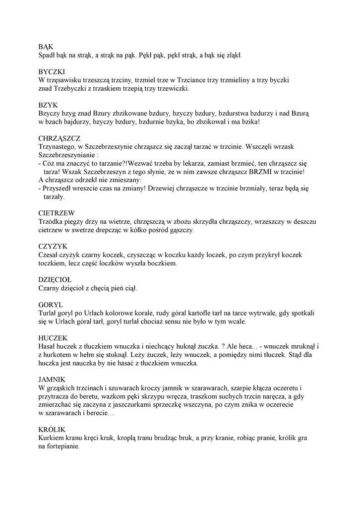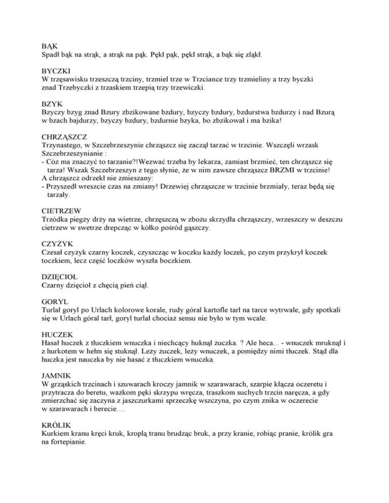 BĄK Spadł bąk na strąk, a strąk na pąk. Pękł pąk, pękł strąk, a bąk się zląkł. BYCZKI W trzęsawisku trzeszczą trzciny, trzmiel trze w Trzciance trzy trzmieliny a trzy byczki znad Trzebyczki z trzaskiem trzepią trzy trzewiczki. BZYK Bzyczy bzyg znad Bzury zbzikowane bzdury, bzyczy bzdury, bzdurstwa bzdurzy i nad Bzurą w bzach bajdurzy, bzyczy bzdury, bzdurnie bzyka, bo zbzikował i ma bzika! CHRZĄSZCZ Trzynastego, w Szczebrzeszynie chrząszcz się zaczął tarzać w trzcinie. Wszczęli wrzask Szczebrzeszynianie : - CóŜ ma znaczyć to tarzanie?!Wezwać trzeba by lekarza, zamiast brzmieć, ten chrząszcz się tarza! Wszak Szczebrzeszyn z tego słynie, Ŝe w nim zawsze chrząszcz BRZMI w trzcinie! A chrząszcz odrzekł nie zmieszany: - Przyszedł wreszcie czas na zmiany! Drzewiej chrząszcze w trzcinie brzmiały, teraz będą się tarzały. CIETRZEW Trzódka piegŜy drŜy na wietrze, chrzęszczą w zboŜu skrzydła chrząszczy, wrzeszczy w deszczu cietrzew w swetrze drepcząc w kółko pośród gąszczy. CZYśYK Czesał czyŜyk czarny koczek, czyszcząc w koczku kaŜdy loczek, po czym przykrył koczek toczkiem, lecz część loczków wyszła boczkiem. DZIĘCIOŁ Czarny dzięcioł z chęcią pień ciął. GORYL Turlał goryl po Urlach kolorowe korale, rudy góral kartofle tarł na tarce wytrwale, gdy spotkali się w Urlach góral tarł, goryl turlał chociaŜ sensu nie było w tym wcale. HUCZEK Hasał huczek z tłuczkiem wnuczka i niechcący huknął Ŝuczka. ? Ale heca... - wnuczek mruknął i z hurkotem w hełm się stuknął. LeŜy Ŝuczek, leŜy wnuczek, a pomiędzy nimi tłuczek. Stąd dla huczka jest nauczka by nie hasać z tłuczkiem wnuczka. JAMNIK W grząskich trzcinach i szuwarach kroczy jamnik w szarawarach, szarpie kłącza oczeretu i przytracza do beretu, waŜkom pęki skrzypu wręcza, traszkom suchych trzcin naręcza, a gdy zmierzchać się zaczyna z jaszczurkami sprzeczkę wszczyna, po czym znika w oczerecie w szarawarach i berecie.... KRÓLIK Kurkiem kranu kręci kruk, kroplą tranu brudząc bruk, a przy kranie, robiąc pranie, królik gra na fortepianie. KRUK Za parkanem wśród kur na podwórku kroczył kruk w purpurowym kapturku, raptem strasznie zakrakał i zrobiła się draka, bo mu kura ukradła robaka. MUSZKA Mała muszka spod Łopuszki chciała mieć róŜowe nóŜki - róŜdŜką nóŜki czarowała, lecz wciąŜ nóŜki czarne miała. - Po cóŜ czary, moja muszko? RuszŜe móŜdŜkiem, a nie róŜdŜką! Wyrzuć wreszcie róŜdŜkę wróŜki i unurzaj w róŜu nóŜki! PCHŁA Na peronie w Poroninie pchła pląsała po pianinie. Przytupnęła, podskoczyła i pianino przewróciła. SZCZENIAK W gąszczu szczawiu we Wrzeszczu klaszczą kleszcze na deszczu, szepcze szczygieł w szczelinie, szczeka szczeniak w Szczuczynie, piszczy pszczoła pod Pszczyną, świszcze świerszcz pod leszczyną, a trzy pliszki i liszka taszczą płaszcze w Szypliszkach. TRZNADLE W krzakach rzekł do trznadla trznadel: - MoŜesz mi poŜyczyć szpadel? Muszę nim przetrzebić chaszcze, bo w nich straszą straszne paszcze. Odrzekł na to drugi trznadel: - Niepotrzebny, trznadlu, szpadel! Gdy wytrzeszczysz oczy w chaszczach, z krzykiem pierzchnie kaŜda, paszcza! śABA Warzy Ŝaba smar, pełen smaru gar, z wnętrza gara bucha para, z pieca bucha Ŝar, smar jest w garze, gar na Ŝarze, wrze na Ŝarze smar.