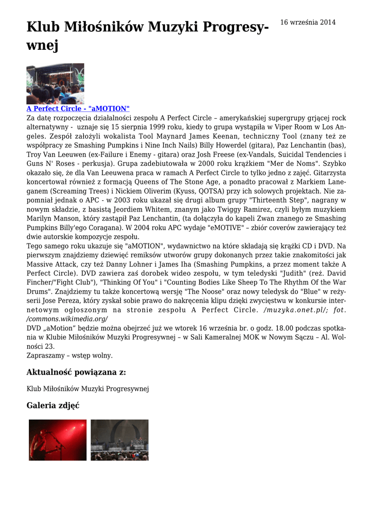 Klub Miłośników Muzyki Progresywnej 16 września 2014 A Perfect Circle - "aMOTION" Za datę rozpoczęcia działalności zespołu A Perfect Circle – amerykańskiej supergrupy grjącej rock alternatywny - uznaje się 15 sierpnia 1999 roku, kiedy to grupa wystąpiła w Viper Room w Los Angeles. Zespół założyli wokalista Tool Maynard James Keenan, techniczny Tool (znany też ze współpracy ze Smashing Pumpkins i Nine Inch Nails) Billy Howerdel (gitara), Paz Lenchantin (bas), Troy Van Leeuwen (ex-Failure i Enemy - gitara) oraz Josh Freese (ex-Vandals, Suicidal Tendencies i Guns N' Roses - perkusja). Grupa zadebiutowała w 2000 roku krążkiem "Mer de Noms". Szybko okazało się, że dla Van Leeuwena praca w ramach A Perfect Circle to tylko jedno z zajęć. Gitarzysta koncertował również z formacją Queens of The Stone Age, a ponadto pracował z Markiem Laneganem (Screaming Trees) i Nickiem Oliverim (Kyuss, QOTSA) przy ich solowych projektach. Nie zapomniał jednak o APC - w 2003 roku ukazał się drugi album grupy "Thirteenth Step", nagrany w nowym składzie, z basistą Jeordiem Whitem, znanym jako Twiggy Ramirez, czyli byłym muzykiem Marilyn Manson, który zastąpił Paz Lenchantin, (ta dołączyła do kapeli Zwan znanego ze Smashing Pumpkins Billy'ego Coragana). W 2004 roku APC wydaje "eMOTIVE" – zbiór coverów zawierający też dwie autorskie kompozycje zespołu. Tego samego roku ukazuje się "aMOTION", wydawnictwo na które składają się krążki CD i DVD. Na pierwszym znajdziemy dziewięć remiksów utworów grupy dokonanych przez takie znakomitości jak Massive Attack, czy też Danny Lohner i James Iha (Smashing Pumpkins, a przez moment także A Perfect Circle). DVD zawiera zaś dorobek wideo zespołu, w tym teledyski "Judith" (reż. David Fincher/"Fight Club"), "Thinking Of You" i "Counting Bodies Like Sheep To The Rhythm Of the War Drums". Znajdziemy tu także koncertową wersję "The Noose" oraz nowy teledysk do "Blue" w reżyserii Jose Pereza, który zyskał sobie prawo do nakręcenia klipu dzięki zwycięstwu w konkursie internetowym ogłoszonym na stronie zespołu A Perfect Circle. /muzyka.onet.pl/; fot. /commons.wikimedia.org/ DVD „aMotion” będzie można obejrzeć już we wtorek 16 września br. o godz. 18.00 podczas spotkania w Klubie Miłośników Muzyki Progresywnej – w Sali Kameralnej MOK w Nowym Sączu – Al. Wolności 23. Zapraszamy – wstęp wolny. Aktualność powiązana z: Klub Miłośników Muzyki Progresywnej Galeria zdjęć