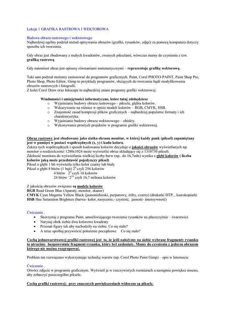 Lekcja 1 GRAFIKA RASTROWA I WEKTOROWA Budowa obrazu rastrowego i wektorowego Najbardziej ogólny podział metod opisywania obrazów (grafiki, rysunków, zdjęć) za pomocą komputera dotyczy sposobu ich tworzenia. Gdy obraz jest zbudowany z małych kwadratów, zwanych pikselami, wówczas mamy do czynienia z tzw. grafiką rastrową. Gdy natomiast obraz jest opisany równaniami matematycznymi – reprezentuje grafikę wektorową. Taki sam podział możemy zastosować do programów graficznych. Paint, Corel PHOTO-PAINT, Paint Shop Pro, Photo Shop, Photo Editor, Gimp to przykłady programów, służących do tworzenia bądź modyfikowania obrazów rastrowych i fotografii. Z kolei Corel Draw oraz Inkscape to najbardziej znane programy grafiki wektorowej. Wiadomości i umiejętności informatyczne, które tutaj zdobędziesz o Wyjaśnianie budowy obrazu rastrowego – piksele, głębia kolorów. o Wskazywanie na różnice w opisie modeli kolorów – RGB, CMYK, HSB. o Znajomość zasad kompresji plików graficznych – najbardziej popularne formaty i ich charakterystyka. o Wyjaśnianie budowy obrazu wektorowego – obiekty. o Wykonywanie prostych projektów w programie grafiki wektorowej. Obraz rastrowy jest zbudowany jako siatka ekranu monitor, w której każdy punk (piksel) zapamiętany jest w pamięci w postaci współrzędnych (x, y) i kodu koloru. Zakres tych współrzędnych i sposób kodowania kolorów decyduje o jakości obrazów wyświetlanych np. monitor o rozdzielczości 1280x1024 może wyświetlić obraz składający się z 1310730 pikseli. Zdolność monitora do wyświetlania wielkiej liczby barw (np.. do 16,7mln) wynika z głębi kolorów ( liczba kolorów jaką może przedstawić pojedynczy piksel) Piksel o głębi 1 bit wyświetla tylko kolor czarny lub biały Piksel o głębi 8 bitów (1 bajt) 28 czyli 256 kolorów 4 bitów 24 czyli 16 kolorów 24 bitów `224 czyli 16,7 miliona kolorów Z jakością obrazów związane są modele kolorów RGB Read Green Blue (Aparaty, monitor, skaner) CMYK Cyan Magenta Yellow Black (jasnoniebieski, purpurowy, żółty, czarny) (drukarki DTP, , kserokopiarki HSB Hue Saturation Brightnes (barwa- kolor, nasycenie,- czystość, jasność- intensywność) Ćwiczenie . Skorzystaj z programu Paint, umożliwiającego tworzenie rysunków na płaszczyźnie – (warstwie) Narysuj obok siebie dwa kolorowe kwadraty Przesuń figury tak aby nachodziły na siebie. Co się stało? A teraz spróbuj przywrócić położenie początkowe Co się stało? Cechą jednowarstwowej grafiki rastrowej jest to, że jeśli nałożymy na siebie wybrane fragmenty rysunku to utracimy bezpowrotnie fragment rysunku, który był zasłonięty. Mamy do czynienia z jednym obrazem którego nie można rozgrupować. Problem ten rozwiązano wykorzystując technikę warstw (np. Corel Photo Paint Gimp) – opis w Internecie Ćwiczenie . Otwórz zdjęcie w programie graficznym. Wyświetl je w rzeczywistych rozmiarach a następnie powiększ mocno, aby zobaczyć poszczególne piksele. Cechą grafiki rastrowej: przy znacznych powiększeniach widoczne są piksele. Ćwiczenie . W programie Paint wybierz polecenie Obraz/Atrybuty. Ustal obraz na 800x600 pikseli. Namaluj dowolny kolorowy, zapełniony rysunek. Zapisz go do folderu grafika w różnych formatach mapy bitowej(głębi kolorów) Grafika 24bity.bmp Grafika 8bitow.bmp Grafika4bity.bmp W tabeli umieść : nazwę pliku, sprawdź lub oblicz wielkość pliku, uwagi o jakości, Sposób obliczania wielkości plików będących mapą bitową: Np. Grafika 24bity.bmp Rozdzielczość obrazu (800x600=320 000) Liczba możliwych kolorów każdego punktu ekranu jest reprezentowana przez 24 bity (/8) czyli 3 bajty Rysunek zajmuje na dysku 320 000x3 bajty = 938 kB Dokładnie 960 054 (54 dodatkowe na nagłówek pliku BMP – więcej w wikipedii Cecha obrazu będącego mapą bitową (.bmp) jest to , że bez względu na stopień skomplikowania rysunku jego rozmiar zależy od rozdzielczości i głebi kolorów Ze względu na duży rozmiar w prezentacjach (szczególnie internetowych nie stosuje się plików bmp) Praktyczne zastosowanie znalazły formaty graficzne GIF PNG – kompresja bezstratna Oraz format JPEG – kompresja stratna Formaty plików graficznych BMP – (BEZ KOMPRESJI) można zapisywać z dowolna głębia kolorów, nie nadaje się do umieszczania w Internecie GIF – Do zapisu obrazów o ostrych krawędziach i wyraźnych granicach kolorów - rysunki, zły format do fotografii Kompresja ograniczona do 256 kolorowej palety barw. Można zapisywać animacje. PNG – następca formatu GIF . Zastosowana metoda kompresji bezstratnej . Można zapisać z 24 – bitową paletą kolorów a w obrazach uzyskać przezroczystość o 256 stopniach co pozwala na wtapianie grafiki w tło innego obrazu lub stronę internetową. Nie można tworzyć animacji JPEG – metoda oparta na stosowaniu kompresji stratnej. Można ustalić dowolny stopień kompresji. Nadaje się do kompresowania zdjęć TIFF – stosowany w DTP (publikowanie zza biurka). Tworzone pliki mogą być zapisane z kompresją bezstratną wg różnych algorytmów lub bez kompresji Ćwiczenie . Zasady związane z kompresją plików opierają się na: 1 Ograniczeniu palety kolorów – dobra przy rysunkach, zła przy foto (format gif) 2 Zmniejszenie rozdzielczości obrazu – lepsza przy foto niż przy rys. (schodki w obramowaniach linii) 3Eliminowanie powtarzających się fragmentów obrazu i zastępowanie ich skompresowanymi zapisami (zapisz jako JPG kompresja najmniejsza, 50%, maksymalna) – kompresja stratna Ćwiczenie . Kompresja grafiki rastrowej 1. Niżej znajduje się link do fotografii o rozmiarze 400 x 300 pikseli zapisanej w formacie BMP. Jak nietrudno obliczyć, zdjęcie zajmuje na dysku 381 kB. 2. Skorzystaj z dowolnego programu graficznego i zapisz fotografię stosując różne formaty graficzne (JPG, PNG, GIF, TIFF) oraz różne współczynniki kompresji (zapisz jako .jpg najniższa kompr