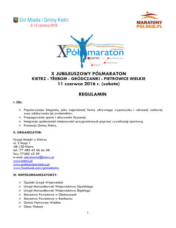 X JUBILEUSZOWY PÓŁMARATON KIETRZ - TŘEBOM - GRÓDCZANKI - PIETROWICE WIELKIE 11 czerwca 2016 r. (sobota) REGULAMIN I. CEL: • Popularyzacja biegania, jako najprostszej formy aktywnego wypoczynku i rekreacji ruchowej oraz zdobywania jej zwolenników. • Propagowanie sportu i aktywności fizycznej. • Integracja społeczności miejscowości przygranicznych poprzez rywalizację sportową. • Promocja Gminy Kietrz. II. ORGANIZATOR: Urząd Miejski w Kietrzu ul. 3 Maja 1 48-130 Kietrz tel.: 77 485 43 56 do 58 fax: 77485 43 59 e-mail: [email protected] www.kietrz.pl www.polmaraton.kietrz.pl www.facebook.com/gminakietrz III. WSPÓŁORGANIZATORZY: • • • • • • • Opolski Urząd Wojewódzki Urząd Marszałkowski Województwa Opolskiego Urząd Marszałkowski Województwa Śląskiego Starostwo Powiatowe w Głubczycach Starostwo Powiatowe w Raciborzu Gmina Pietrowice Wielkie Obec Třebom 1 IV. PATRONAT HONOROWY: • • • • • Wojewoda Opolski Marszałek Województwa Opolskiego Marszałek Województwa Śląskiego Starosta Głubczycki Starosta Raciborski V. TERMIN I MIEJSCE: 1. X Jubileuszowy Półmaraton Kietrz - Třebom - Gródczanki - Pietrowice Wielkie odbędzie się w dniu 11 czerwca 2016 r. (sobota) w Kietrzu. Trasa będzie przebiegać przez Polskę i Czechy, po stronie Polski na terenie województwa opolskiego i śląskiego, w powiecie głubczyckim i raciborskim. 2. START nastąpi o godz. 10:00 z Rynku w Kietrzu (ul. Wojska Polskiego). 3. META znajduje się również przy Rynku w Kietrzu (ul. Wojska Polskiego). VI. TRASA: 1. 2. 3. 4. 5. 6. 7. 8. 9. Trasa liczy 21,097 km. Trasa zróżnicowana: asfalt – 80%, utwardzone drogi gruntowe i trawiaste – 20%. Trasa będzie posiadała oznaczone wszystkie kilometry: od 1 do 21. Trasę będą zabezpieczać: Policja, Straż Graniczna i Straż Pożarna. Na trasie będą przygotowane 4 punkty żywnościowe wraz z wodą pitną, obsługiwane przez Wolontariuszy. Na trasie będą dostępne również 3 punkty odświeżania - kurtyny wodne. Za kolumną biegaczy będzie jechać ambulans wraz z zespołem ratowniczym. Drugi ambulans wraz z zespołem ratowniczym będzie dostępny na mecie. Zawodników obowiązuje limit czasowy pokonania trasy wynoszący 3:15 h, od momentu startu. Pomiar trasy przeprowadzono za pomocą dalmierza – koła do pomiaru drogi (wynik pomiaru = 21100 m) oraz za pomocą nawigacji satelitarnej GPS „GARMIN” - wynik pomiaru = 21097 m. VII. BIURO ZAWODÓW: Biuro Zawodów będzie mieściło się na terenie Zespołu Szkół w Kietrzu przy ul. Kościuszki 14. Biuro czynne będzie 11.06.2016 r. w godz. od 7:00 do godz. 9:15, w tym czasie nastąpi weryfikacja uczestników. Na terenie Zespołu Szkół dostępne będą również szatnie, depozyt, a także miejsca noclegowe. Nieopodal, na kompleksie „ORLIK” do dyspozycji biegaczy będą wykwalifikowani masażyści (bezpłatnie). 1. Depozyt będzie przyjmował rzeczy osobiste zawodników zapakowane do worków (dostarczonych przez Organizatora przy weryfikacji). 2. Szatnie z prysznicami i depozyt będą czynne w dniu 11.06.2016 r. od godz. 7:00 do 16:00. 3. Wydawanie worków z depozytu będzie odbywało się za okazaniem numeru startowego. Zagubienie numeru startowego przez zawodnika zwalnia Organizatora od odpowiedzialności za pobranie worka przez inną osobę. Prosimy o niepozostawianie w depozycie przedmiotów wartościowych oraz dokumentów. 4. Organizator nie odpowiada za rzeczy uczestników pozostawione poza wyznaczonym depozytem. 5. Organizator zapewnia bezpłatne noclegi z 10 na 11 czerwca 2016 r. w Hali Sportowej przy ul. Kościuszki - chętnym zawodnikom, którzy wyślą informację na adres e-mail [email protected]. Organizator nie zapewnia śpiworów, karimat itp. 2 VIII. UCZESTNICTWO: 1. • • • • 2. 3. 4. 5. 6. 7. 8. Udział w biegu jest otwarty dla wszystkich biegaczy, którzy: zgłosili swój start, uiścili opłatę startową, najpóźniej do dnia 11 czerwca 2016 r. ukończą 18 lat, posiadają aktualne badania lekarskie lub podpisali formularz o zdolności do udziału w biegu półmaratońskim. Warunkiem dopuszczenia zawodnika do biegu będzie przedstawienie podczas weryfikacji zaświadczenia lekarskiego o braku przeciwwskazań do udziału w biegu półmaratońskim lub złożenie podpisu pod oświadczeniem o zdolności do udziału w biegu. Wszyscy zawodnicy muszą być zweryfikowani w Biurze Zawodów. Podczas weryfikacji zawodnicy muszą posiadać dowód osobisty lub inny dokument potwierdzający tożsamość. Weryfikacja zawodników, wydawanie numerów startowych oraz pakietów startowych odbędzie się w Biurze Zawodów w dniu 11 czerwca 2016 r. – od godziny 7:00 do 9:15. Wszyscy zawodnicy muszą posiadać numer startowy. Brak numeru startowego spowoduje dyskwalifikację zawodnika. Pomiar czasu oraz ustalenie kolejności zawodników, którzy ukończyli bieg będzie realizowany systemem elektronicznym race result. Każdy z uczestników otrzyma transponder (zwrotny). Transponder należy przytwierdzić do sznurowadła prawego lub lewego buta, aby znajdował się na wysokości kostki. Zawodnicy zobowiązani są do zwrotu transponderów po biegu. W razie zagubienia lub zniszczenia transpondera zawodnik zapłaci Organizatorowi 20 zł. Zwrot transponderów odbędzie się po przebiegnięciu linii mety w wyznaczonym punkcie. Oficjalnym czasem zawodów jest czas brutto. Przekazanie swojego numeru startowego innej osobie spowoduje dyskwalifikację zawodnika. Zawodnicy pokonujący dystans biegu w sposób niedozwolony zostaną zdyskwalifikowani. W czasie trwania biegu uczestnicy powinni stosować się do poleceń osób odpowiedzialnych za bezpieczeństwo, służb porządkowych i osób działających w imieniu Organizatora. Zabrania się startu zawodnikom będącym pod wpływem alkoholu, bądź innych środków odurzających. IX. ZGŁOSZENIA: 1. Zgłoszenia są przyjmowane poprzez wypełnienie formularza zgłoszeniowego na stronie internetowej www.maratony