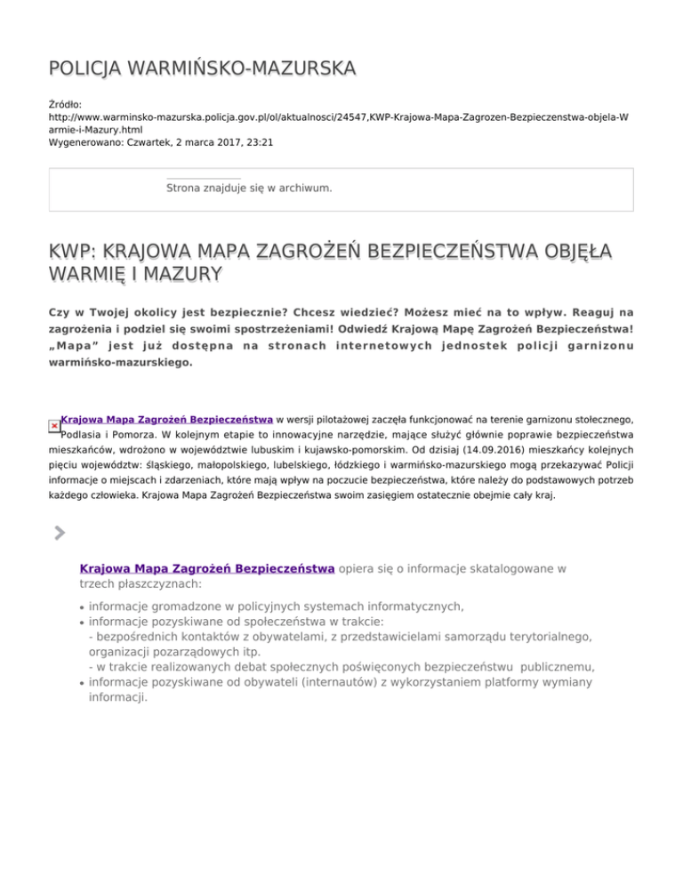 POLICJA WARMIŃSKO-MAZURSKA Źródło: http://www.warminsko-mazurska.policja.gov.pl/ol/aktualnosci/24547,KWP-Krajowa-Mapa-Zagrozen-Bezpieczenstwa-objela-W armie-i-Mazury.html Wygenerowano: Czwartek, 2 marca 2017, 23:21 Strona znajduje się w archiwum. KWP: KRAJOWA MAPA ZAGROŻEŃ BEZPIECZEŃSTWA OBJĘŁA WARMIĘ I MAZURY Czy w Twojej okolicy jest bezpiecznie? Chcesz wiedzieć? Możesz mieć na to wpływ. Reaguj na zagrożenia i podziel się swoimi spostrzeżeniami! Odwiedź Krajową Mapę Zagrożeń Bezpieczeństwa! „Mapa” jest już dostępna na stronach internetowych jednostek policji garnizonu warmińsko-mazurskiego. Krajowa Mapa Zagrożeń Bezpieczeństwa w wersji pilotażowej zaczęła funkcjonować na terenie garnizonu stołecznego, Podlasia i Pomorza. W kolejnym etapie to innowacyjne narzędzie, mające służyć głównie poprawie bezpieczeństwa mieszkańców, wdrożono w województwie lubuskim i kujawsko-pomorskim. Od dzisiaj (14.09.2016) mieszkańcy kolejnych pięciu województw: śląskiego, małopolskiego, lubelskiego, łódzkiego i warmińsko-mazurskiego mogą przekazywać Policji informacje o miejscach i zdarzeniach, które mają wpływ na poczucie bezpieczeństwa, które należy do podstawowych potrzeb każdego człowieka. Krajowa Mapa Zagrożeń Bezpieczeństwa swoim zasięgiem ostatecznie obejmie cały kraj. Krajowa Mapa Zagrożeń Bezpieczeństwa opiera się o informacje skatalogowane w trzech płaszczyznach: ● ● ● informacje gromadzone w policyjnych systemach informatycznych, informacje pozyskiwane od społeczeństwa w trakcie: - bezpośrednich kontaktów z obywatelami, z przedstawicielami samorządu terytorialnego, organizacji pozarządowych itp. - w trakcie realizowanych debat społecznych poświęconych bezpieczeństwu publicznemu, informacje pozyskiwane od obywateli (internautów) z wykorzystaniem platformy wymiany informacji. Informacje prezentowane na mapach uwzględniają zarówno wybrane kategorie przestępstw i wykroczeń jak i zagrożenia, które w subiektywnym odczuciu mieszkańców negatywnie wpływają na ich poczucie bezpieczeństwa. Obsługa „Map” dostępnych na stronach internetowych poszczególnych jednostek Policji na terenie których została już uruchomiona, została zaprojektowana tak, aby bezproblemowo, wręcz intuicyjnie mógł z nich skorzystać każdy obywatel. Aby zgłosić zagrożenie należy wejść na stronę internetową komendy wojewódzkiej, miejskiej lub powiatowej Policji i tam kliknąć baner z logo Krajowej Mapy Zagrożeń Bezpieczeństwa. Przekazanie tych informacji zajmuje tylko kilka chwil. W razie potrzeby można skorzystać z instrukcji obsługi. Pomocą służą także funkcjonariusze. Zgłoszenie trafi do policjantów odpowiedniej komórki Policji. Zebrane informacje pozwolą na jeszcze lepszą dyslokację służb, aby uniknąć w przyszłości ponownego zgłaszania tego samego typu zagrożeń w tym samym miejscu. Mapy zostały opracowane w oparciu o informacje własne Policji, czyli m.in. statystyki policyjne, a także na podstawie informacji przekazanych przez podmioty biorące udział w konsultacjach społecznych oraz w oparciu o wyniki badań opinii publicznej oraz informacje różnych instytucji. Podczas tworzenia mapy zagrożeń na terenie całego kraju przeprowadzono ponad 11 tysięcy spotkań, podczas których mieszkańcy zgłaszali swe uwagi, mówili o potrzebach i zagrożeniach w swojej okolicy. W spotkaniach wzięło udział ponad 217 tysięcy osób. Z narzędzia należy korzystać w sposób rozsądny. Każde naniesione na mapę zagrożenie wywoła odpowiednią reakcję Policji. Z jednego komputera można zgłosić jedno zagrożenie na dobę. Należy pamiętać, że zgłoszenia w ramach Krajowej Mapy Zagrożeń Bezpieczeństwa nie zastępują potrzeby pilnej interwencji Policji. W tego typu przypadkach należy korzystać z numerów alarmowych 112, 997. (KGP/TM) Ocena: 2/5 (8) Tweetnij warmińsko-mazurskie, Krajowa Mapa Zagrożeń Bezpieczeństwa, mazury, warmia