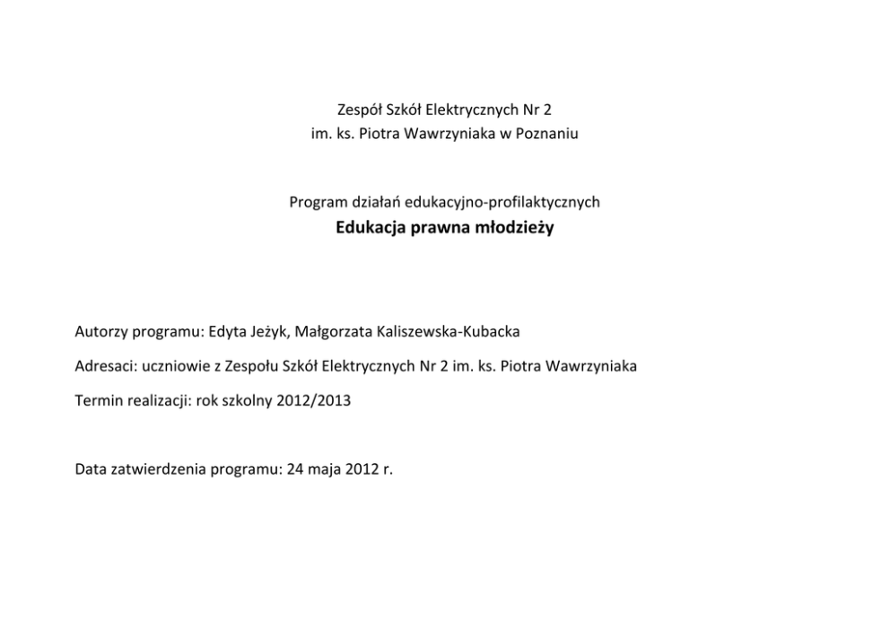 Zespół Szkół Elektrycznych Nr 2 im. ks. Piotra Wawrzyniaka w Poznaniu Program działań edukacyjno-profilaktycznych Edukacja prawna młodzieży Autorzy programu: Edyta Jeżyk, Małgorzata Kaliszewska-Kubacka Adresaci: uczniowie z Zespołu Szkół Elektrycznych Nr 2 im. ks. Piotra Wawrzyniaka Termin realizacji: rok szkolny 2012/2013 Data zatwierdzenia programu: 24 maja 2012 r. Program oparty jest na założeniach zawartych w „Podstawie programowej kształcenia ogólnego dla gimnazjów i szkół ponadgimnazjalnych, których ukończenie umożliwia uzyskanie świadectwa dojrzałości po zdaniu egzaminu maturalnego” oraz Szkolnym programie profilaktyki. W ostatnich latach w przerażającym tempie wzrasta przestępczość wśród młodzieży szkolnej. My, dorośli musimy sobie uświadomić, że bezstresowym wychowaniem wyrządzamy krzywdę własnym dzieciom. Wielu nieszczęściom i konfliktom z prawem można by zapobiec, gdyby proces wychowawczy przebiegał prawidłowo. To, czego nie zapewnia rodzina, szkoła winna uzupełnić, czyli nauczyć młodego człowieka przestrzegania ogólnie przyjętych norm współżycia społecznego, a także zadbać o rozwój jego inteligencji emocjonalnej. Dlatego też zdecydowałyśmy się na opracowanie i wdrożenie programu działań edukacyjnych z zakresu prawa karnego. Z rozmów pedagoga szkolnego z uczniami, ich rodzicami, wychowawcami klas oraz przeprowadzonej wśród uczniów ankiety diagnozującej środowisko wynika, że wielu wychowanków z naszej szkoły pochodzi z rodzin dysfunkcyjnych o zaniżonej świadomości prawnej. Najczęściej popełniane przez młodzież przestępstwa, według danych zamieszczonych na stronie www.policja.pl, to: udział w bójkach i pobiciach, gwałtach, kradzieżach z włamaniem, przestępstwach rozbójniczych i narkotykowych. W związku z powyższym edukacja prawna młodzieży wydaje się koniecznością. W spotkaniach poza szkołą uczestniczyć będzie kilkunastoosobowa grupa zainteresowanych uczniów, którzy zadeklarują swój udział w programie oraz uczniowie pochodzący z rodzin dysfunkcyjnych, wskazani przez autorów programu. W spotkaniach na terenie szkoły uczestniczyć będą uczniowie klas pierwszych, drugich, trzecich. Cele główne: przekazanie młodzieży podstaw wiedzy prawnej, przeciwdziałanie zachowaniom ryzykownym młodzieży, uświadomienie uczniom konsekwencji wynikający z podejmowania zachowań ryzykownych. Cele operacyjne: uczeń przedstawia strukturę sądownictwa w Polsce, uczeń rozumie znaczenie podstawowych pojęć z zakresu prawa karnego, uczeń podaje przykłady przestępstw przeciwko życiu i zdrowiu oraz przeciwko mieniu, rozumie, że za podejmowanie działań o charakterze przestępczym grozi odpowiedzialność karna, uczeń definiuje pojęcie cyberprzemocy, wie jakie formy może przyjmować cyberprzemoc, rozumie konsekwencje cyberprzemocy dla jej ofiar, wie jakie konsekwencje grożą sprawcom przemocy w sieci oraz zna zasady bezpiecznego korzystania z Internetu i telefonu komórkowego, uczeń przedstawia kary i środki karne obowiązujące w polskim prawie, uczeń potrafi wyjaśnić na jakich zasadach nieletni odpowiadają za popełnienie przestępstwa, jakie środki wychowawcze i poprawcze mogą być wobec nich zastosowane, uczeń przedstawia przebieg procesu sądowego oraz jego uczestników, uczeń przedstawia przepisy prawne ustawy o przeciwdziałaniu narkomanii, wskazuje konsekwencje ich łamania. Procedury osiągania celów: spotkanie młodzieży z rzecznikiem prasowym Sądu Okręgowego w Poznaniu, spotkanie młodzieży z policjantem z Wydziału Prewencji Policji, spotkanie z kuratorem sądowym z ZKSS dla dzielnicy Poznań – Grunwald, udział w rozprawach sądowych w Sądzie Okręgowym w Poznaniu oraz w Sądzie Rejonowym Poznań - Grunwald i Jeżyce Wydział IV Rodzinny i Nieletnich, spotkanie całej społeczności uczniowskiej z sędzią Sądu Okręgowego w Łodzi Anną Marią Wesołowską, wizyta młodzieży w Zakładzie Poprawczym w Poznaniu, wizyta młodzieży w Salezjańskim Domu Młodzieży w Poznaniu, wizyta młodzieży w zakładzie karnym lub zaproszenie do szkoły pracownika zakładu bądź byłego więźnia, wizyta w Poradni Profilaktyki i Terapii Uzależnień MONAR w Poznaniu lub zaproszenie psychoterapeuty ds. uzależnień, wystosowanie pism do instytucji na terenie miasta Poznania: Sądu Okręgowego, Sądu Rejonowego, Komendy Wojewódzkiej Policji, Zakładu Poprawczego, Salezjańskiego Domu Młodzieży, Aresztu Śledczego, Poradni Profilaktyki i Terapii Uzależnień MONAR, wspólne czytanie poradnika prawnego Anny Marii Wesołowskiej, pt. Bezpieczeństwo młodzieży – pogadanka na temat przeczytanych fragmentów, zakupienie do biblioteki szkolnej literatury z zakresu prawa karnego, konkurs plastyczny na plakat bądź hasło promujące bezpieczną szkołę. TREŚCI PROGRAMOWE Struktura sądownictwa w Polsce. Podstawowe pojęcia z zakresu prawa karnego. Przestępstwa przeciwko życiu i zdrowiu. Przestępstwa przeciwko mieniu. Konsekwencje prawne popełnianych przestępstw. Przemoc z użyciem mediów elektronicznych. EFEKTY EDUKACYJNE Uczeń potrafi: opisać strukturę sądownictwa w Polsce, wymienić i zdefiniować podstawowe pojęcia z zakresu prawa karnego, wymienić przestępstwa przeciwko życiu i zdrowiu oraz przeciwko mieniu, określić konsekwencje prawne przestępstw najczęściej popełnianych przez młodocianych sprawców, np.: udział w bójce i pobiciu, kradzież, rozbój, kradzież rozbójnicza, wymuszenie rozbójnicze, przywłaszczenie mienia, uszkodzenie rzeczy, paserstwo. Uczeń potrafi: zdefiniować pojęcie cyberprzemocy, wymienić formy cyberprzemocy, opisać konsekwencje cyberprzemocy dla jej ofiar, sformułować zasady bezpiecznego korzystania z Internetu i telefonu komórkowego, wymienić konsekwencje prawne grożące sprawcom przemocy w sieci. METODY REALIZACJI TERMINY spotkanie z sędzią lub/i kuratorem sądowym lub/i policjantem z Wy