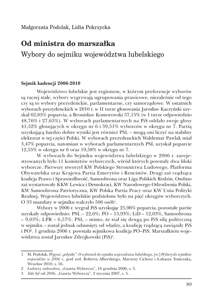 Małgorzata Podolak, Lidia Pokrzycka Od ministra do marszałka Wybory do sejmiku województwa lubelskiego Sejmik kadencji 2006-2010 Województwo lubelskie jest regionem, w którym preferencje wyborów są raczej stałe, wybory wygrywają ugrupowania prawicowe, niezależnie od tego czy są to wybory prezydenckie, parlamentarne, czy samorządowe. W ostatnich wyborach prezydenckich w 2010 r. w II turze głosowania Jarosław Kaczyński uzyskał 62,85% poparcia, a Bronisław Komorowski 37,15% (w I turze odpowiednio 48,76% i 27,65%). W wyborach parlamentarnych na PiS oddało swoje głosy 41,52% głosujących w okręgu nr 6 i 39,51% wyborców w okręgu nr 7. Partią uzyskującą bardzo dobre wyniki jest również PSL – mogą oni liczyć na stabilny elektorat w tej części Polski. W wyborach prezydenckich Waldemar Pawlak miał 3,47% poparcia, natomiast w wyborach parlamentarnych PSL uzyskał poparcie 12,55% w okręgu nr 6 oraz 19,38% w okręgu nr 7. W wyborach do Sejmiku województwa lubelskiego w 2006 r. zarejestrowanych było 11 komitetów wyborczych, wśród których powstały dwa bloki wyborcze. Pierwszy stworzył KW Polskiego Stronnictwa Ludowego, Platforma Obywatelska oraz Krajowa Partia Emerytów i Rencistów. Drugi zaś rządząca koalicja Prawo i Sprawiedliwość, Samoobrona oraz Liga Polskich Rodzin. Osobno zaś wystartowały KKW Lewica i Demokraci, KW Narodowego Odrodzenia Polski, KW Samoobrona Patriotyczna, KW Polska Partia Pracy oraz KW Unia Polityki Realnej. Województwo lubelskie podzielone było na pięć okręgów wyborczych. O 33 mandaty w sejmiku walczyło 506 osób1. Wybory w 2006 r. wygrał PiS uzyskując 25,96% poparcia, pozostałe partie uzyskały odpowiednio: PSL – 22,6%; PO – 15,93%; LiD – 12,03%, Samoobrona – 9,03%; LPR – 6,57%. PSL – mimo, że stał się drugą po PiS siłą polityczną w sejmiku – został jednak odsunięty od władzy, a koalicję rządzącą zawiązały PiS i PO2. 1 grudnia 2006 r. powstała sejmikowa koalicja PO–PiS. Marszałkiem województwa został Jarosław Zdrojkowski (PiS)3. 1 M. Podolak, Wygrać „jedynkę”. O wyborach do sejmiku województwa lubelskiego, [w:] Wybory do sejmików województw w 2006 r., pod red. Roberta Alberskiego, Marzeny Cichosz i Łukasza Tomczaka, Wrocław 2010, s. 56. 2 Ludowcy zadowoleni, „Gazeta Wyborcza”, 18 grudnia 2006, s. 3. 3 Taki był rok 2006, „Gazeta Wyborcza”, 2 stycznia 2007, s. 5. 89 Małgorzata Podolak, Lidia Pokrzycka W trakcie kadencji Sejmiku nastąpiła zmiana na stanowisku marszałka województwa. Pod wnioskiem o odwołanie Jarosława Zdrojkowskiego podpisało się 20 radnych wojewódzkich z PO, PSL, SLD i części Samoobrony. Główny zarzut dotyczył tego, że marszałek z PiS źle rządzi województwem (choć – jak podkreślały media – w pięcioosobowym zarządzie województwa było trzech ludzi z Platformy, a wszystkie uchwały podejmowane były jednogłośnie). Zarzucano także m.in. złą organizację pracy Urzędu Marszałkowskiego i opóźnienia w podejmowaniu decyzji. „Dla PiS prawdziwe motywy ich przeciwników są polityczne. Sami działacze Platformy przyznają, że dostali rozkaz z Warszawy, żeby do władzy w województwie dopuścić ludowców”4. Podczas sprawowania władzy marszałek m.in. rozwiązał departament transportu. Kilka miesięcy wcześniej dziennikarze przyłapali w urzędzie dwóch radnych i wicemarszałka (wszyscy PSL) przy koniaku. Pod koniec grudnia okazało się, że unijne dofinansowanie dostała firma, której współwłaścicielką jest żona członka zarządu województwa5. Pod koniec 2007 r. doszło do zerwania koalicji PO-PiS w sejmiku. Została podpisana nowa koalicja PO-PSL-LiD. Odwołano przewodniczącego Sejmiku Andrzeja Pruszkowskiego i powołano nowego przewodniczącego Jacka Czerniaka z LiD. Za odwołaniem A. Pruszkowskiego opowiedziało się 19 radych (na 30 obecnych), 11 było przeciw. 20 grudnia 2007 r. radni PO, SLD, LiD i Samoobrony złożyli wniosek o odwołanie marszałka województwa Jarosława Zdrojkowskiego. We wniosku radni wytykali m.in. „brak współpracy z radnymi”, „złe wydawanie środków”. Na 32 radnych na sali za odwołaniem było 20, przeciw 12. Dokonano wyboru nowego marszałka. Został nim Krzysztof Grabczuk (PO), były prezydent Chełma. Za głosowało 20 radnych, przeciw 12. Wicemarszałkami zostali Jacek Sobczak (PO) – 22 radnych za, 8 przeciw oraz Sławomir Sosnowski (PSL) – 21 radnych za, 9 – przeciw, 1 wstrzymał się od głosu6. W ten sposób sejmik województwa przypieczętował rozpad koalicji PO i PiS w samorządzie Lubelszczyzny, a władzę przejął sojusz: PO-PSL-SLD. Platforma miała w zarządzie trzy stanowiska odpowiadające za nadzór nad infrastrukturą, funduszami europejskimi i promocję regionu. PSL posiadał dwóch przedstawicieli, którzy nadzorowali departamenty zajmujące się rolnictwem i kulturą. Z kolei SLD otrzymało stanowisko przewodniczącego sejmiku. Wydarzeniem o niższej randze był fakt utraty przez byłego prezydenta Lublina fotela szefa lubelskiego oddziału ANR, w którym zasiadał tylko przez rok. Kiedy władzę w kraju przejęła koalicja PO-PSL pewne było, że Andrzej Pruszkowski straci posadę7. Z kolei Marzena Świnarska (PO) miała problemy 4 Zdrojkowski odwołany, Grabczuk powołany, http://www.dziennikwschodni.pl/apps/pbcs.dll/article ?AID=/20080128/ LUBLIN/152823537. 5 R. Panas, Prestiż 2008 – Polityka, http://www.dziennikwschodni.pl/apps/pbcs.dll/article?AID =/20090202/ PRESTIZ/302903454. 6 S. Skomra, Nowe rozdanie w Sejmiku, „Gazeta Wyborcza Lublin” 29 stycznia 2008, s. 1. 7 Sprawa Andrzeja Pruszkowskiego ponownie na sejmiku, http://www.dziennikwschodni.pl/apps/pbcs. 90 Od ministra do marszałka. Wybory do sejmiku województwa lubelskiego z utrzymaniem mandatu. Radna wojewódzka była współwłaścicielką firmy wygrywającej przetargi na żywienie pacjentów szpitali podległych samorządowi województwa (ostatnio w Chełmie). 