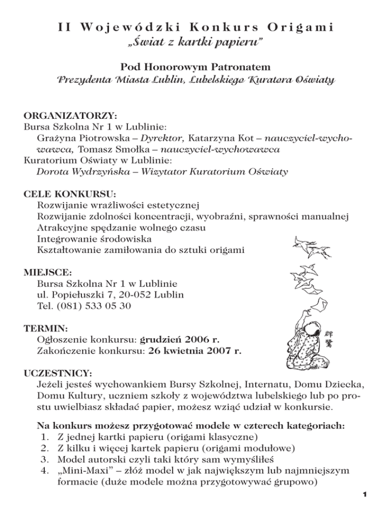 II Wojewódzki Konkurs Origami „Świat z kartki papieru” Pod Honorowym Patronatem Prezydenta Miasta Lublin, Lubelskiego Kuratora Oświaty ORGANIZATORZY: Bursa Szkolna Nr 1 w Lublinie: Grażyna Piotrowska – Dyrektor, Katarzyna Kot – nauczyciel-wychowawca, Tomasz Smołka – nauczyciel-wychowawca Kuratorium Oświaty w Lublinie: Dorota Wydrzyńska – Wizytator Kuratorium Oświaty CELE KONKURSU: Rozwijanie wrażliwości estetycznej Rozwijanie zdolności koncentracji, wyobraźni, sprawności manualnej Atrakcyjne spędzanie wolnego czasu Integrowanie środowiska Kształtowanie zamiłowania do sztuki origami MIEJSCE: Bursa Szkolna Nr 1 w Lublinie ul. Popiełuszki 7, 20-052 Lublin Tel. (081) 533 05 30 TERMIN: Ogłoszenie konkursu: grudzień 2006 r. Zakończenie konkursu: 26 kwietnia 2007 r. UCZESTNICY: Jeżeli jesteś wychowankiem Bursy Szkolnej, Internatu, Domu Dziecka, Domu Kultury, uczniem szkoły z województwa lubelskiego lub po prostu uwielbiasz składać papier, możesz wziąć udział w konkursie. Na konkurs możesz przygotować modele w czterech kategoriach: 1. Z jednej kartki papieru (origami klasyczne) 2. Z kilku i więcej kartek papieru (origami modułowe) 3. Model autorski czyli taki który sam wymyśliłeś 4. „Mini-Maxi” – złóż model w jak największym lub najmniejszym formacie (duże modele można przygotowywać grupowo) 1 Żeby nie było wątpliwości: Origami klasyczne to te modele, które powstają z jednej kartki papieru – najczęściej przybiera formę zwierzątek, ludzi, kwiatów... Z kolei origami modułowe to modele poskładane z wielu kartek – tutaj najczęściej mamy do czynienia z bryłami geometrycznymi... Aha, zawsze obowiązuje zasada: Zero kleju i nacinania! Interesuje nas tylko składanie. WARUNKI UCZESTNICTWA: Jeśli kwalifikujesz się na uczestnika konkursu (patrz punkt „Uczestnicy”) i naprawdę chcesz wziąć w nim udział to musisz: • Własnoręcznie złożyć modele! (możesz oddać pod czujne oko jury do dwóch modeli w każdej kategorii za wyjątkiem kategorii modele autorskie, ponieważ tutaj możesz zgłosić dowolną ilość modeli. Czyli: modułowe = maks. 2 szt.; klasyczne = maks. 2 szt.; „Mini-Maxi” = maks. 2 szt.; autorskie = bez ograniczeń) • W przypadku przygotowania autorskiego modelu postaraj się o narysowanie jego diagramu. • Wypełnić KARTĘ ZGŁOSZENIA, którą znaleźć możesz w załączniku lub pobrać ze strony: www.origami.art.pl Pamiętaj, że cała ta „papierkowa robota” nie może trwać dłużej niż do dnia 4 kwietnia 2007 r. Do tego czasu musisz osobiście lub drogą pocztową dostarczyć modele, ew. diagramy i kartę zgłoszenia do organizatorów z Bursy Szkolnej Nr 1 w Lublinie. JURY I KRYTERIA OCENY (Ktoś przecież musi ocenić Twoje prace!): W składzie jury zasiądą osoby z Polskiego Towarzystwa Origami, Polskiego Centrum Origami oraz artyści-plastycy. Nadesłane modele będą grupowane w następujących kategoriach: Wiek Origami klasyczne Origami modułowe Modele autorskie Modele „Mini-Maxi” do 10 lat 11-14 15-17 18 i więcej Jury dokonując oceny, kierować się będzie: Estetyką wykonania, pięknem modelu (czy zgięcia są dokładne, precyzyjnie wykonane, czy jest dobrze dobrany papier, kolor no i czy model został dobrze wymodelowany) 2 Skomplikowanie modelu (jury zastanowią się tutaj czy dany model jest trudny do złożenia czy też nie... Ale mimo wszystko pamiętaj: celem sztuki, również origami jest piękno a nie to czy dzieło jest trudne czy łatwe do wykonania!) Atrakcyjność modelu (ten punkt dotyczy tego czy wybrałeś dobry model do przedstawienia tematu, którego się podjąłeś) Wierność zasadom origami (Zero kleju i nacinania. Liczy się tylko sprawność Twoich rąk) NAGRODY: Dyplomy, nagrody rzeczowe w tym różne akcesoria do origami – i to nie jakieś tam byle jakie! Ponadto każdy będzie mógł wziąć udział w warsztatach origami przeprowadzonych przez najlepszych origamistów w Polsce! O całym konkursie, warsztatach i wystawie przeczytasz w biuletynie Polskiego Towarzystwa Origami. To nie koniec – na pewno jeszcze coś wymyślimy o czym przekonasz się w dniu zakończenia. Dla instruktorów, opiekunów, wychowawców, nauczycieli będą dyplomy. ZAKOŃCZENIE KONKURSU: Cały konkurs zakończy się w środę, 26 kwietnia 2007 r., w świetlicy Bursy Szkolnej Nr 1 w Lublinie. Porządek zakończenia: 930 Rozpoczęcie (kawa, herbata, słodkie „conieco”) 1000 Otwarcie Ogólnopolskiej Wystawy Modeli Origami 1030 Warsztaty origami 1300 Przerwa, obiad 1345 Ogłoszenie wyników konkursu, wręczenie nagród 1430 Pamiątkowe zdjęcia, zakończenie konkursu PATRONAT MEDIALNY: POLSKIE TOWARZYSTWO ORIGAMI www.origami.art.pl WSZELKIE PYTANIA I WĄTPLIWOŚCI PROSIMY KIEROWAĆ DO ORGANIZATORÓW tel. (081) 533 05 30; e-mail: [email protected] 3 KARTA ZGŁOSZENIA Prosimy o czytelne wypełnienie Imię i nazwisko ............................................................................................................ Data urodzenia (wiek) ................................................................................................ Kontakt (telefon, e-mail) ............................................................................................. Placówka (szkoła, bursa itp.) – adres, kontakt ...................................................... .......................................................................................................................................... Opiekun/instruktor/wychowawca (telefon, e-mail) .............................................. .......................................................................................................................................... Z Ł O Ż O N E Lp. 1. 2. Lp. 1. 2. Lp. 1. 2. Lp. 1. 2. 3. 4 M O D E L E ORIGAMI KLASYCZNE Nazwa modelu Autor modelu Format papieru ORIGAMI MODUŁOWE Nazwa modelu Autor modelu Ilość modułów MODELE „MINI-MAXI” Nazwa modelu Autor mode