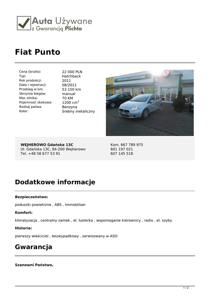 Fiat Punto Cena (brutto) Typ: Rok produkcji: Data I rejestracji: Przebieg w km: Skrzynia biegów: Moc silnika: Pojemność skokowa: Rodzaj paliwa: Kolor: 22 000 PLN Hatchback 2011 08/2011 53 150 km manual 70 KM 1200 cm3 Benzyna Srebny metaliczny WEJHEROWO Gdańska 13C Ul. Gdańska 13C, 84-200 Wejherowo Tel. +48 58 677 53 91 Kom. 667 789 975 601 197 021 607 145 518 Dodatkowe informacje Bezpieczeństwo: poduszki powietrzne , ABS , immobiliser Komfort: klimatyzacja , centralny zamek , el. lusterka , wspomaganie kierownicy , radio , el. szyby Historia: pierwszy właściciel , bezwypadkowy , serwisowany w ASO Gwarancja Szanowni Państwo, 1/2 Pragniemy Państwa poinformować, iż firma Plichta – Autoryzowany Dealer Škoda Auto prowadzi skup oraz sprzedaż samochodów używanych wszystkich marek, oferując także samochody używane z gwarancją objęte programem „Auta używane z Gwarancją Plichta”. W ramach programu „Auta Używane z Gwarancją Plichta ” każdy Klient otrzymuje atrakcyjny pakiet zniżek pozwalający zoptymalizować koszty eksploatacji samochodu: -50% na serwis klimatyzacji -50% na ustawienie zbieżności -50% na kosmetykę auta -50% na ścieżkę diagnostyczną -25% na wymiany oleju -25% na zakup opon + 5zł na sezon za hotelowanie opon -15% na części i akcesoria Oferujemy również kompleksową obsługę w zakresie finansowania i ubezpieczenia: - kredyty już od 4,99% - leasingi i kredyty bez zaświadczeń - uproszczone procedury – decyzja już od 30 min. - atrakcyjne pakiety AC/OC/NW/ASS wiodących firm ubezpieczeniowych Możliwość pozostawienia dotychczas użytkowanego auta w rozliczeniu – BEZPŁATNA WYCENA!!! Zapraszamy wszystkich Klientów na jazdę próbną wybranym autem. Numer oferty: A334 Informacja nie stanowi oferty w rozumieniu art. 66 KC. Podane dane mają charakter wyłącznie informacyjny. 2/2 Powered by TCPDF (www.tcpdf.org)