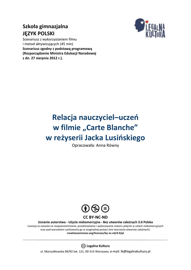 Szkoła gimnazjalna JĘZYK POLSKI Scenariusz z wykorzystaniem filmu i metod aktywizujących (45 min) Scenariusz zgodny z podstawą programową (Rozporządzenie Ministra Edukacji Narodowej z dn. 27 sierpnia 2012 r.). Relacja nauczyciel–uczeń w filmie „Carte Blanche” w reżyserii Jacka Lusińskiego Opracowała: Anna Równy CC BY-NC-ND Uznanie autorstwa - Użycie niekomercyjne - Bez utworów zależnych 3.0 Polska Licencja ta zezwala na rozpowszechnianie, przedstawianie i wykonywanie utworu jedynie w celach niekomercyjnych oraz pod warunkiem zachowania go w oryginalnej postaci (nie tworzenia utworów zależnych). creativecommons.org/licenses/by-nc-nd/3.0/pl ul. Marszałkowska 84/92 lok. 121, 00-514 Warszawa, e-mail: [email protected] Cele lekcji: Uczeń: - odczytuje film jako tekst kultury inspirujący do rozważań i dyskusji; - interpretuje film jako źródło informacji o współczesnym świecie; - doskonali umiejętność czytania ze zrozumieniem; - odczytuje przesłanie filmu w kontekście idei wpisanych w kampanię społeczną fundacji Legalna Kultura. Metody: - miniwykład; - praca w grupach; - dyskusja. Środki dydaktyczne: - Internet; - karty pracy; - tablica lub tablica interaktywna albo flipchart. Przygotowanie do lekcji: Uczniowie samodzielnie lub z nauczycielem oglądają film „Carte Blanche” w reżyserii Jacka Lusińskiego z płyty DVD wydanej przez Kino Świat lub na platformie VOD. Nauczyciel przed projekcją zapoznaje uczniów z zasadami korzystania z legalnych źródeł. Uświadamia im, że fundacja Legalna Kultura od lat prowadzi kampanię społeczną mającą na celu integrację twórców i odbiorców kultury oraz kształtowanie poczucia odpowiedzialności za kulturę w cyfrowej rzeczywistości. Nauczyciel prosi uczniów o zapoznanie się w domu z zasobami zamieszczonymi w serwisie www.legalnakultura.pl. ul. Marszałkowska 84/92 lok. 121, 00-514 Warszawa, e-mail: [email protected] Powiązanie z podstawą programową z języka polskiego: (III etap edukacyjny, wymagania szczegółowe) I. Odbiór wypowiedzi i wykorzystanie zawartych w nich informacji. 1. Czytanie i słuchanie. Uczeń: 1) odbiera komunikaty pisane, mówione, w tym nadawane za pomocą środków audiowizualnych – rozróżnia informacje przekazane werbalnie oraz zawarte w dźwięku i obrazie. II. Analiza i interpretacja tekstów kultury. Uczeń zna teksty literackie i inne teksty kultury wskazane przez nauczyciela. 1. Wstępne rozpoznanie. Uczeń: 1) opisuje odczucia, które budzi w nim dzieło; 2) rozpoznaje problematykę utworu. 2. Analiza. Uczeń: 11) uwzględnia w analizie specyfikę tekstów kultury przynależnych do następujących rodzajów sztuki: literatura, teatr, film, muzyka, sztuki plastyczne, sztuki audiowizualne. 3. Interpretacja. Uczeń: 1) przedstawia propozycję odczytania konkretnego tekstu kultury i uzasadnia ją. 4. Wartości i wartościowanie. Uczeń: 1) ze zrozumieniem posługuje się pojęciami dotyczącymi wartości pozytywnych i ich przeciwieństw oraz określa postawy z nimi związane, np. patriotyzm–nacjonalizm, tolerancja–nietolerancja, piękno-brzydota, a także rozpoznaje ich obecność w życiu oraz w literaturze i innych sztukach; 2) omawia na podstawie poznanych dzieł literackich i innych tekstów kultury podstawowe, ponadczasowe zagadnienia egzystencjalne, np. miłość, przyjaźń, śmierć, cierpienie, lęk, nadzieja, wiara religijna, samotność, inność, poczucie wspólnoty, solidarność, sprawiedliwość; dostrzega i poddaje refleksji uniwersalne wartości humanistyczne; 3) dostrzega zróżnicowanie postaw społecznych, obyczajowych, narodowych, religijnych, etycznych, kulturowych i w ich kontekście kształtuje swoją tożsamość. ul. Marszałkowska 84/92 lok. 121, 00-514 Warszawa, e-mail: [email protected] Przebieg lekcji: FAZA WSTĘPNA Nauczyciel podaje temat lekcji i zadaje uczniom pytanie: „Jakie cechy powinien posiadać idealny nauczyciel?”. Odpowiedzi mogą zostać zapisane na tablicy w formie mapy myśli. Następnie zachęca do krótkiej dyskusji w parach lub czwórkach na temat tego, jaki powinien być uczeń dla idealnego nauczyciela. Na koniec prosi klasę o podzielenie się wrażeniami na temat filmu „Carte Blanche”. FAZA REALIZACYJNA Nauczyciel dzieli uczniów na osiem grup. Każdy zespół otrzymuje inną kartę pracy związaną z filmem „Carte Blanche” (materiały pomocnicze 1). (Jeśli klasa jest mała, można zmniejszyć liczbę grup do czterech i przydzielić po dwie karty pracy). Po wykonaniu ćwiczeń uczniowie prezentują swoje wnioski. FAZA PODSUMOWUJĄCA Nauczyciel prosi uczniów, by wskazali, co wpłynęło na relacje między uczniami klasy IIIB a wychowawcą. Rozdaje fragment artykułu (materiały pomocnicze 2) i prosi uczniów o refleksję, jak sami zachowaliby się, gdyby spotkali nauczyciela mającego podobny problem. Nauczyciel uzupełnia wnioski z lekcji, nawiązując do historii Macieja Białka, który po latach przyznał się do choroby. Wyjaśnia, że jego postawa sprawiła, iż zyskał wsparcie wśród nauczycieli i uczniów. Wskazuje na istotę uczciwości na co dzień – względem samego siebie oraz innych. Przypomina, że troska o uczciwość wpisuje się w założenia kampanii społecznej fundacji Legalna Kultura, która kształtuje poczucie odpowiedzialności za kulturę w cyfrowej rzeczywistości. Zadanie domowe: Wybierz scenę z filmu, która wydaje ci się najważniejsza. Krótko opisz tę sytuację i uzasadnij swój wybór. ul. Marszałkowska 84/92 lok. 121, 00-514 Warszawa, e-mail: [email protected] Materiały pomocnicze 1. Karty pracy Grupa 1 Scharakteryzuj metody nauczania stosowane przez Kacpra oraz reakcję uczniów na wątpliwości nauczyciela w sprawie objęcia wychowawstwa. Wykorzystaj poniższe ilustracje. [Źródło kadrów: zrzuty ekranu z filmu „Carte Blanche”, dystrybutor Kino Świat] ul. Marszałkowska 84/92 lok. 121, 00-514 Warszawa, e-mail: [email protected] Grupa 2 Z jakimi tr