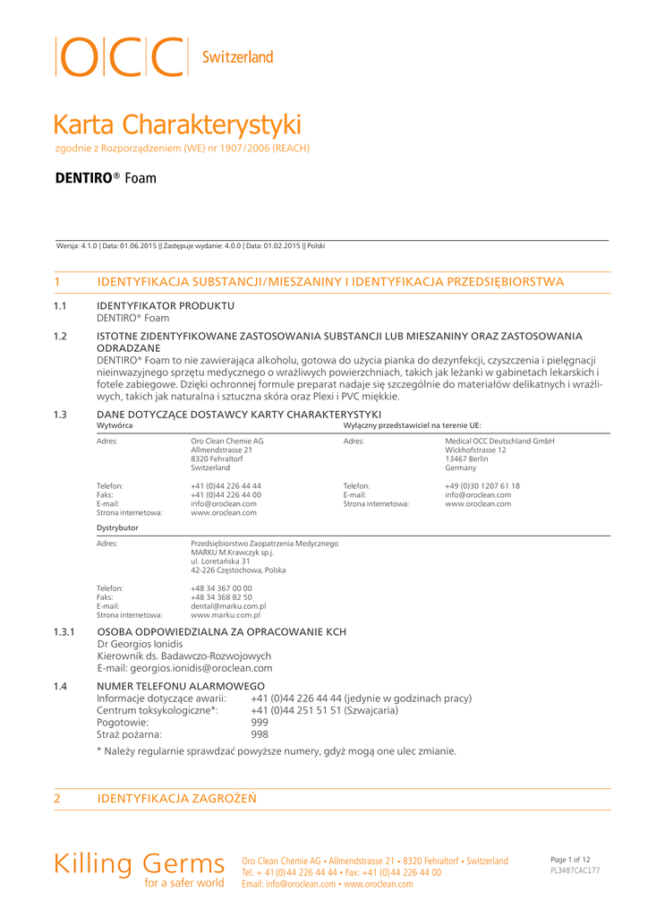 Karta Charakterystyki zgodnie z Rozporządzeniem (WE) nr 1907/2006 (REACH) DENTIRO® Foam Wersja: 4.1.0 | Data: 01.06.2015 || Zastępuje wydanie: 4.0.0 | Data: 01.02.2015 || Polski 1 IDENTYFIKACJA SUBSTANCJI/MIESZANINY I IDENTYFIKACJA PRZEDSIĘBIORSTWA 1.1 IDENTYFIKATOR PRODUKTU DENTIRO® Foam 1.2 ISTOTNE ZIDENTYFIKOWANE ZASTOSOWANIA SUBSTANCJI LUB MIESZANINY ORAZ ZASTOSOWANIA ODRADZANE DENTIRO® Foam to nie zawierająca alkoholu, gotowa do użycia pianka do dezynfekcji, czyszczenia i pielęgnacji nieinwazyjnego sprzętu medycznego o wrażliwych powierzchniach, takich jak leżanki w gabinetach lekarskich i fotele zabiegowe. Dzięki ochronnej formule preparat nadaje się szczególnie do materiałów delikatnych i wrażli wych, takich jak naturalna i sztuczna skóra oraz Plexi i PVC miękkie. 1.3 DANE DOTYCZĄCE DOSTAWCY KARTY CHARAKTERYSTYKI Wytwórca Wyłączny przedstawiciel na terenie UE: Adres: Oro Clean Chemie AG Allmendstrasse 21 8320 Fehraltorf Switzerland Adres: Medical OCC Deutschland GmbH Wickhofstrasse 12 13467 Berlin Germany Telefon: Faks: E-mail: Strona internetowa: +41 (0)44 226 44 44 +41 (0)44 226 44 00 info@oroclean.com www.oroclean.com Telefon: E-mail: Strona internetowa: +49 (0)30 1207 61 18 info@oroclean.com www.oroclean.com Dystrybutor Adres: Przedsiębiorstwo Zaopatrzenia Medycznego MARKU M.Krawczyk sp.j. ul. Loretańska 31 42-226 Częstochowa, Polska Telefon: Faks: E-mail: Strona internetowa: +48 34 367 00 00 +48 34 368 82 50 [email protected] www.marku.com.pl 1.3.1 OSOBA ODPOWIEDZIALNA ZA OPRACOWANIE KCH Dr Georgios Ionidis Kierownik ds. Badawczo-Rozwojowych E-mail: georgios.ionidis@oroclean.com 1.4 NUMER TELEFONU ALARMOWEGO Informacje dotyczące awarii: +41 (0)44 226 44 44 (jedynie w godzinach pracy) Centrum toksykologiczne*: +41 (0)44 251 51 51 (Szwajcaria) Pogotowie: 999 Straż pożarna: 998 * Należy regularnie sprawdzać powyższe numery, gdyż mogą one ulec zmianie. 2 IDENTYFIKACJA ZAGROŻEŃ Killing Germs for a safer world Oro Clean Chemie AG • Allmendstrasse 21 • 8320 Fehraltorf • Switzerland Tel. + 41 (0) 44 226 44 44 • Fax: +41 (0) 44 226 44 00 Email: [email protected] • www.oroclean.com Page 1 of 12 PL3487CAC177 Karta Charakterystyki zgodnie z Rozporządzeniem (WE) nr 1907/2006 (REACH) DENTIRO® Foam Wersja: 4.1.0 | Data: 01.06.2015 || Zastępuje wydanie: 4.0.0 | Data: 01.02.2015 || Polski 2.1 KLASYFIKACJA SUBSTANCJI LUB MIESZANINY 2.1.1 KLASYFIKACJA ZGODNIE Z ROZPORZĄDZENIEM (WE) NR 1272/2008 KLASY I KATEGORIE ZAGROŻEŃ ZWROTY WSKAZUJĄCE RODZAJ ZAGROŻENIA Aquatic Chronic 3 PROCEDURA KLASYFIKACJI H412 Działa szkodliwie na organizmy Zharmonizowana (prawna) klasyfikacja. wodne, powodując długotrwałe skutki. 2.2 ELEMENTY OZNAKOWANIA 2.2.1 OZNACZENIE MIESZANINY ZGODNIE Z ROZPORZĄDZENIEM (WE) NR 1272/2008 Piktogramy oznaczające zagrożenia – Hasło ostrzegawcze: Brak haseł ostrzegawczych zgodnie z Dyrektywą (WE) 1272/2008. Zwroty wskazujące rodzaj zagrożenia H412 Działa szkodliwie na organizmy wodne, powodując długotrwałe skutki. Zwroty wskazujące środki ostrożności: P273 Unikać uwolnienia do środowiska. P305+P351 W PRZYPADKU DOSTANIA SIĘ DO OCZU: Ostrożnie płukać wodą przez kilka minut. P501.1 Zawartość/pojemnik usunąć zgodnie z odpowiednimi przepisami. Uzupełniające informacje o zagrożeniach (UE): – No supplementary labelling requirements according to Regulation (EC) 1272/2008. 2.3 INNE ZAGROŻENIA Niniejsza mieszanina nie należy do kategorii PBT lub vPvB zgodnie z REACH, aneks XIII. 3 SKŁAD / INFORMACJA O SKŁADNIKACH 3.1 SUBSTANCJE Niniejszy produkt jest mieszaniną (patrz część 3.2). 3.2 MIESZANINY Killing Germs for a safer world Oro Clean Chemie AG • Allmendstrasse 21 • 8320 Fehraltorf • Switzerland Tel. + 41 (0) 44 226 44 44 • Fax: +41 (0) 44 226 44 00 Email: [email protected] • www.oroclean.com Page 2 of 12 PL3487CAC177 Karta Charakterystyki zgodnie z Rozporządzeniem (WE) nr 1907/2006 (REACH) DENTIRO® Foam Wersja: 4.1.0 | Data: 01.06.2015 || Zastępuje wydanie: 4.0.0 | Data: 01.02.2015 || Polski 3.2.1 NIEBEZPIECZNE SKŁADNIKI KLASYFIKACJA ZGODNIE Z ROZPORZĄDZENIEM (WE) NR 1272/2008 Nazwa Numer CAS Numer EINECS Numer in deksu Numer REACH Kategorie zagrożeń Chlorek benzylo-C12-18-alk ilodimetylowy 68424-85-1 270-325-2 Aminy, n-C10-16-alkilo trimetylenodi-, produkty reakcji z kwasem chlorooc towym 139734-65-9 n.a. Zwroty wskazujące rodzaj zagrożeni Stężenie n.a. 05-2115874530-460000 Acute Tox. 4, Skin Corr. H302, H314, 1B, Aquatic Acute 1, H400, H410 Aquatic Chronic 1 < 1% n.a. Brak obowiązku zgod Acute Tox. 4, Skin Corr. H302, H314, nie z REACH 1C, Aquatic Acute 1 H400 < 1% 3.2.2 INFORMACJE DODATKOWE Pełen tekst wymienionych zwrotów R i H podano w części 16 . 4 ŚRODKI PIERWSZEJ POMOCY 4.1 OPIS ŚRODKÓW PIERWSZEJ POMOCY 4.1.1 ZALECENIA OGÓLNE Zapewnić środki ochrony. W przypadku korzystania z pomocy lekarskiej pokazać niniejszą kartę charakterystyki. 4.1.2 NARAŻENIE PRZEZ DROGI ODDECHOWE Zapewnić środki zabezpieczające przed oparami lub aerozolami wyrobu. Przenieść osobę poszkodowaną ze strefy narażenia na świeże powietrza. Nie pozostawiać osoby bez opieki. Skorzystać z pomocy lekarskiej w przy padku trudności z oddychaniem lub kaszlu, lub wystąpienia innych objawów. Poluzować opięte ubranie, na przykład kołnierzyk, krawat, pasek lub stan. 4.1.3 W PRZYPADKU KONTAKTU ZE SKÓRĄ Natychmiast zdjąć zanieczyszczoną odzież. Umyć skórę dużą ilością zimnej wody. Nie używać rozpuszczalników. W przypadku wystąpienia podrażnienia lub innych objawów skorzystać z pomocy lekarza. Wyprać odzież przed ponownym użyciem. 4.1.4 W PRZYPADKU KONTAKTU Z OCZAMI Przemyć oczy bieżącą wodą. Skorzystać z pomocy lekarza w przypadku wystąpienia objawów takich, jak zaczer wienienie, podrażnienie lub ból. 4.1.5 W PRZYPADKU POŁKNIĘCIA Jamę ustną dotkniętej osoby wypłukać wodą i podać jej obficie wody do picia.Nie wywoływać wymiotów.Jeśli