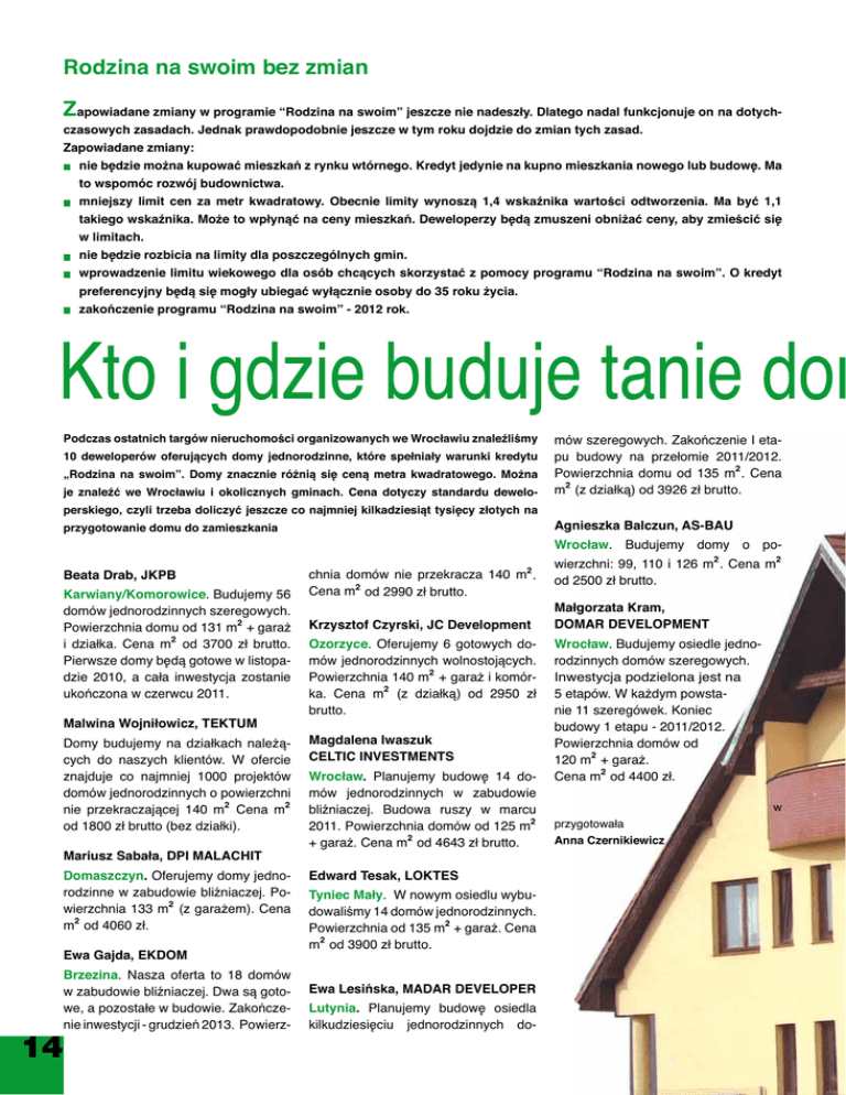 Rodzina na swoim bez zmian Zapowiadane zmiany w programie “Rodzina na swoim” jeszcze nie nadeszły. Dlatego nadal funkcjonuje on na dotychczasowych zasadach. Jednak prawdopodobnie jeszcze w tym roku dojdzie do zmian tych zasad. Zapowiadane zmiany: nie będzie można kupować mieszkań z rynku wtórnego. Kredyt jedynie na kupno mieszkania nowego lub budowę. Ma to wspomóc rozwój budownictwa. mniejszy limit cen za metr kwadratowy. Obecnie limity wynoszą 1,4 wskaźnika wartości odtworzenia. Ma być 1,1 takiego wskaźnika. Może to wpłynąć na ceny mieszkań. Deweloperzy będą zmuszeni obniżać ceny, aby zmieścić się w limitach. nie będzie rozbicia na limity dla poszczególnych gmin. wprowadzenie limitu wiekowego dla osób chcących skorzystać z pomocy programu “Rodzina na swoim”. O kredyt preferencyjny będą się mogły ubiegać wyłącznie osoby do 35 roku życia. zakończenie programu “Rodzina na swoim” - 2012 rok. Podczas ostatnich targów nieruchomości organizowanych we Wrocławiu znaleźliśmy 10 deweloperów oferujących domy jednorodzinne, które spełniały warunki kredytu „Rodzina na swoim”. Domy znacznie różnią się ceną metra kwadratowego. Można je znaleźć we Wrocławiu i okolicznych gminach. Cena dotyczy standardu dewelo- mów szeregowych. Zakończenie I etapu budowy na przełomie 2011/2012. Powierzchnia domu od 135 m2 . Cena m2 (z działką) od 3926 zł brutto. perskiego, czyli trzeba doliczyć jeszcze co najmniej kilkadziesiąt tysięcy złotych na Agnieszka Balczun, AS-BAU przygotowanie domu do zamieszkania Wrocław. Budujemy domy o poBeata Drab, JKPB Karwiany/Komorowice. Budujemy 56 domów jednorodzinnych szeregowych. Powierzchnia domu od 131 m2 + garaż i działka. Cena m2 od 3700 zł brutto. Pierwsze domy będą gotowe w listopadzie 2010, a cała inwestycja zostanie ukończona w czerwcu 2011. chnia domów nie przekracza 140 m2 . Cena m2 od 2990 zł brutto. Krzysztof Czyrski, JC Development Ozorzyce. Oferujemy 6 gotowych domów jednorodzinnych wolnostojących. Powierzchnia 140 m2 + garaż i komórka. Cena m2 (z działką) od 2950 zł brutto. Malwina Wojniłowicz, TEKTUM Domy budujemy na działkach należących do naszych klientów. W ofercie znajduje co najmniej 1000 projektów domów jednorodzinnych o powierzchni nie przekraczającej 140 m2 Cena m2 od 1800 zł brutto (bez działki). Magdalena Iwaszuk CELTIC INVESTMENTS Wrocław. Planujemy budowę 14 domów jednorodzinnych w zabudowie bliźniaczej. Budowa ruszy w marcu 2011. Powierzchnia domów od 125 m2 + garaż. Cena m2 od 4643 zł brutto. Mariusz Sabała, DPI MALACHIT Domaszczyn. Oferujemy domy jednorodzinne w zabudowie bliźniaczej. Powierzchnia 133 m2 (z garażem). Cena m2 od 4060 zł. Ewa Gajda, EKDOM Brzezina. Nasza oferta to 18 domów w zabudowie bliźniaczej. Dwa są gotowe, a pozostałe w budowie. Zakończenie inwestycji - grudzień 2013. Powierz- 14 Edward Tesak, LOKTES Tyniec Mały. W nowym osiedlu wybudowaliśmy 14 domów jednorodzinnych. Powierzchnia od 135 m2 + garaż. Cena m2 od 3900 zł brutto. Ewa Lesińska, MADAR DEVELOPER Lutynia. Planujemy budowę osiedla kilkudziesięciu jednorodzinnych do- wierzchni: 99, 110 i 126 m2 . Cena m2 od 2500 zł brutto. Małgorzata Kram, DOMAR DEVELOPMENT Wrocław. Budujemy osiedle jednorodzinnych domów szeregowych. Inwestycja podzielona jest na 5 etapów. W każdym powstanie 11 szeregówek. Koniec budowy 1 etapu - 2011/2012. Powierzchnia domów od 120 m2 + garaż. Cena m2 od 4400 zł. w przygotowała Anna Czernikiewicz Oprocentowanie kredytu 2 informacje o tanich mieszkaniach znajdziecie na naszej stronie Opłaty i stopy procentowe związane z preferencyjnym kredytem mieszkaniowym w poszczególnych bankach nie są jednakowe. Banki indywidualnie negocjowały swoje umowy z Bankiem Gospodarstwa Krajowego, dlatego warto sprawdzić, gdzie oferta kredytów w ramach programu „Rodzina na swoim” jest najkorzystniejsza. Oprocentowanie kredytów z dopłatami w tych instytucjach jest zmienne, ustalane w oparciu o zmienną stawkę WIBOR powiększoną o marżę danego Banku. www. nieruchomosci-dla-ciebie.pl We wszystkich bankach oferujących kredyty z dopłatą podstawą oprocentowania jest: WIBOR 3M (Warsaw Interbank Offer Rate), czyli stopa procentowa po jakiej banki udzielają pożyczek innym bankom (np. 14.01.2011 WIBOR 3M wynosił 3,97%); własna marża banku, która na początku 2011 roku wynosi 1,3 – 3,5 proc. (ale może być wyższa), podwyższona marża do wpisu hipoteki, co może trwać wiele miesięcy, a nawet lata. Oprocentowanie to tylko jeden z elementów wpływających na koszt kredytu. Znacznie zwiększa go: prowizja pobierana przez bank, wszelkiego rodzaju ubezpieczenia kredytu i kredytobiorcy wymagane przez bank, opłaty związane z wyceną nieruchomości i szacowaniem zaawansowania budowy (w przypadku dopiero budowanych mieszkań czy domów), opłaty notarialne, związane z ustanawianiem księgi wieczystej, wpisy hipotek. UWAGA! PKO BP GBW Bank Polskiej Spółdzielczości Bank Pocztowy Pekao Mazowiecki Bank Regionalny Alior Bank Getin Noble Bank Pekao Bank Hipoteczny Bank BPH Euro Bank Bank Zachodni WBK Bank Handlowy w Warszawie Allianz Bank Polska BGŻ BRE BANK Bank Millennium BNP PARIBAS/FORTIS Rata, którą bank wylicza w momencie zaciągania kredytu nie jest stała. Zmienia się nieustannie. Przy kredycie złotówkowym rośnie automatycznie ze wzrostem stóp procentowych ogłaszanym przez Radę Polityki Pieniężnej. Dokładne koszty kredytu banki wyliczają indywidualnie dla każdego kredytobiorcy. Zdarza się, że podczas takich szacunków, zwykły kredyt mieszkaniowy jest tańszy od dotowanego przez BGK. AC 15