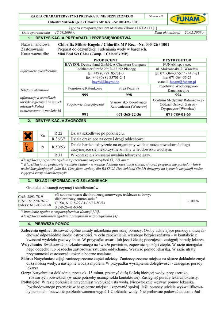 KARTA CHARAKTERYSTYKI PREPARATU NIEBEZPIECZNEGO Strona 1/6 Chlorifix Mikro-Kugeln / Chlorifix MP Rez. –Nr. 000426 / 1001 Zgodna z rozporządzeniem Ministra Zdrowia i REACH [1] Data sporządzenia 12.08.2006 r. Data aktualizacji 1. IDENTYFIKACJA PREPARATU I PRZEDSIĘBIORSTWA Nazwa handlowa Zastosowanie Karta waŜna dla: 20.02.2009 r. Chlorifix Mikro-Kugeln / Chlorifix MP Rez. –Nr. 000426 / 1001 Preparat do dezynfekcji i utleniania wody w basenach. Mini Pool Set Chlor (Comp. 1 Chlorifix MP) Informacje teleadresowe PRODUCENT BAYROL Deutschland GmbH, A Chemtura Company Lochhamer Straβe 29; D-82152 Planegg tel. +49 (0) 89 85701-0 fax: +49 (0) 89 85701-241 [email protected] Telefony alarmowe informacje o ośrodkach toksykologicznych w innych miastach Polski zamieszczono w punkcie 16 DYSTRYBUTOR FUNAM sp. z o.o. ul. Mokronoska 2; Wrocław tel. 071-364-37-57 / - 44 / -21 fax: 071-364-55-23 e-mail: [email protected] Pogotowie WodociągowoKanalizacyjne Pogotowie Ratunkowe StraŜ PoŜarna 999 998 994 Pogotowie Energetyczne Stanowisko Koordynacji Ratownictwa (Wrocław) Centrum Medycyny Ratunkowej Oddział Ostrych Zatruć Dyspozytor (Wrocław) 991 071-368-22-36 071-789-01-65 2. IDENTYFIKACJA ZAGROśEŃ Xn R 22 R 36/37 N R 50/53 R 31 Działa szkodliwie po połknięciu. Działa draŜniąco na oczy i drogi oddechowe. Działa bardzo toksycznie na organizmy wodne; moŜe powodować długo utrzymujące się niekorzystne zmiany w środowisku wodnym. W kontakcie z kwasami uwalnia toksyczne gazy. Klasyfikacja preparatu zgodnie z przepisami rozporządzeń [3, 17] oraz: 1) Klasyfikacja na podstawie wyników badań - w wyniku dodania substancji stabilizujących preparat nie posiada właściwości klasyfikujących jako R8. Certyfikat wydany dla BAYROL Deutschland GmbH dostępny na Ŝyczenie instytucji nadzorujących karty charakterystyki. 3. SKŁAD I INFORMACJA O SKŁADNIKACH Granulat substancji czynnej i stabilizatorów. sól sodowa kwasu dichloroizocyjanurowego; troklozen sodowy; CAS: 2893-78-9 dichloroizocyjanuran sodu1) EINECS: 220-767-7 O, Xn, N, R 8-22-31-36/37-50/53 Indeks: 613-030-00-X S 2-8-26-41-60-61 1) brzmienie zgodne z rozporządzeniem Komisji [18]; Klasyfikacja substancji zgodnie z przepisami rozporządzenia [4]. ~100 % 4. PIERWSZA POMOC Zalecenia ogólne: Stosować ogólne zasady udzielania pierwszej pomocy. Osoby udzielające pomocy muszą zachować odpowiednie środki ostroŜności, w celu zapewnienia własnego bezpieczeństwa – w kontakcie z kwasami wydziela gazowy chlor. W przypadku awarii lub jeŜeli źle się poczujesz - zasięgnij porady lekarza. Wdychanie: Ewakuować poszkodowanego na świeŜe powietrze, zapewnić spokój i ciepło. W razie nieregularnego oddechu lub bezdechu zastosować sztuczne oddychanie. Wezwać pomoc lekarską. W razie utraty przytomności zastosować ułoŜenie boczne ustalone. Skóra: Natychmiast zdjąć zanieczyszczone części odzieŜy. Zanieczyszczone miejsca na skórze dokładnie zmyć duŜą ilością wody, a następnie wodą z mydłem. W przypadku wystąpienia dolegliwości - zasięgnąć porady lekarza. Oczy: Natychmiast dokładnie, przez ok. 15 minut, przemyć duŜą ilością bieŜącej wody, przy szeroko rozwartych powiekach (w razie potrzeby usunąć szkła kontaktowe). Zasięgnąć porady lekarza okulisty. Połknięcie: W razie połknięcia natychmiast wypłukać usta wodą. Niezwłocznie wezwać pomoc lekarską. Poszkodowanego przenieść w bezpieczne miejsce i zapewnić spokój. Jeśli pomocy udziela wykwalifikowany personel – pozwolić poszkodowanemu wypić 1-2 szklanki wody. Nie próbować podawać doustnie Ŝad- KARTA CHARAKTERYSTYKI PREPARATU NIEBEZPIECZNEGO Strona 2/6 Chlorifix Mikro-Kugeln / Chlorifix MP Rez. –Nr. 000426 / 1001 nych środków, jeśli poszkodowany nie jest w pełni przytomny. Nie wywoływać wymiotów. Nie pozostawiać poszkodowanego bez opieki. 5. POSTĘPOWANIE W PRZYPADKU POśARU Zalecane środki gaśnicze: DuŜa ilość wody, dwutlenek węgla, piasek. Nieodpowiednie środki gaśnicze: Mgiełka wodna. Szczególne zagroŜenia ze strony produktów spalania i wydzielających się gazów: Podczas poŜaru, w strefie wysokiej temperatury, powstają produkty pirolizy spalania, m. in. chlor, chlorowodór. Wdychanie produktów rozkładu moŜe powodować powaŜne skutki zdrowotne. Specjalne wyposaŜenie ochronne straŜaków: WyposaŜenie straŜaków dostosować do lokalnych warunków akcji gaśniczej, zalecane jest pełne wyposaŜenie bojowe z aparatami oddechowymi. Inne informacje: Sąsiednie pojemniki chłodzić wodą. W przypadku wydzielania się substancji z rozkładu preparatu, pokrywać uciekające opary mgiełką wodną. 6. POSTĘPOWANIE W PRZYPADKU NIEZAMIERZONEGO UWOLNIENIA DO ŚRODOWISKA Indywidualne środki ostroŜności: Szczegółowe informacje zamieszczone są w punkcie 7 i 8. UniemoŜliwić dostęp osób postronnych. Unikać tworzenia pyłu. UŜywać środków ochrony osobistej. Środki ostroŜności w zakresie ochrony środowiska: Nie dopuszczać do zanieczyszczania wód powierzchniowych (gruntowych) oraz gruntu. Zapobiegać przedostaniu się zanieczyszczeń do kanalizacji. W przypadku przedostania się do rzek, przewodów kanalizacyjnych lub wodociągowych, powiadomić odpowiednie władze (Inspekcja Ochrony Środowiska, Państwowa StraŜ PoŜarna, Przedsiębiorstwo Wodno - Kanalizacyjne). Metody oczyszczania/usuwania: Zebrać mechanicznie unikając tworzenia pyłu - umieścić w zamykanym i oznakowanym pojemniku, w celu dalszego bezpiecznego usunięcia. Zanieczyszczony grunt zebrać i umieścić w oznakowanym pojemniku. Postępowanie z odpadami - pkt 13. Pozostałości na powierzchni utwardzonej, po dokładnym zebraniu, zmyć duŜą ilością wody z detergentem. Nie zbierać przy pomocy odkurzaczy. Informacje dodatkowe: Preparat wydziela gazowy chlor. Jeśli oczyszczanie wykonuje wykwalifikowany personel, moŜna uŜyć środków neutralizujących aktywny chlor, np. roztwory tiosiarczanu sodu. MoŜe powodować odb