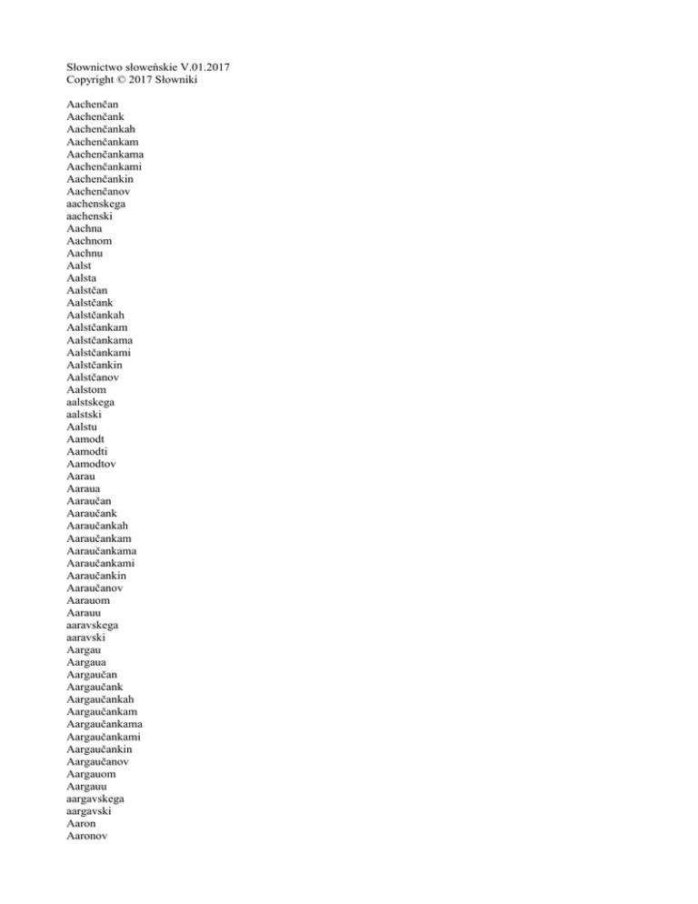 Słownictwo słoweńskie V.01.2017 Copyright © 2017 Słowniki Aachenčan Aachenčank Aachenčankah Aachenčankam Aachenčankama Aachenčankami Aachenčankin Aachenčanov aachenskega aachenski Aachna Aachnom Aachnu Aalst Aalsta Aalstčan Aalstčank Aalstčankah Aalstčankam Aalstčankama Aalstčankami Aalstčankin Aalstčanov Aalstom aalstskega aalstski Aalstu Aamodt Aamodti Aamodtov Aarau Aaraua Aaraučan Aaraučank Aaraučankah Aaraučankam Aaraučankama Aaraučankami Aaraučankin Aaraučanov Aarauom Aarauu aaravskega aaravski Aargau Aargaua Aargaučan Aargaučank Aargaučankah Aargaučankam Aargaučankama Aargaučankami Aargaučankin Aargaučanov Aargauom Aargauu aargavskega aargavski Aaron Aaronov Abadon Abadonov abadonskega abadonski abak Abanki Abankin Abbadi Abbadih Abbado Abbadov Abderčan Abderčank Abderčankah Abderčankam Abderčankama Abderčankami Abderčankin Abderčanov Abderi abderitstev abderitstvo abderskega abderski Abdič Abdiče Abdičev abdicira abdicirajoč abdicirajočega abdiciral abdiciram abdiciranje abdicirati Abdiće Abdićev abdikacij abdikacijah abdikacijam abdikacijama abdikacijami abdomen abdominalen abdomna abdomne abdomnih abdomnoma abdomnu Abdul Abdulah Abdulahov Abdulov abeced abecedah abecedam abecedama abecedami abecedar abecedarskega abecedarski abecedarstev abecedarstvo abeceden abecednic abecednicah abecednicam abecednicama abecednicami abecednik abecedniškega abecedniški Abel Abelarde Abelardev Abelov aberacij aberacijah aberacijam aberacijama aberacijami aberacijskega aberacijski Aberdeen Aberdeena Aberdeenčan Aberdeenčank Aberdeenčankah Aberdeenčankam Aberdeenčankama Aberdeenčankami Aberdeenčankin Aberdeenčanov Aberdeenom aberdeenskega aberdeenski Aberdeenu Aberšek Aberškov abesinskega abesinski Abhaziji Abidžan Abidžana Abidžančev Abidžanec Abidžank Abidžankah Abidžankam Abidžankama Abidžankami Abidžankin Abidžanom abidžanskega abidžanski Abidžanu abiotskega abiotski abisalen abisalnost abisalnosti Abitančan Abitančank Abitančankah Abitančankam Abitančankama Abitančankami Abitančankin Abitančanov Abitante Abitantih abitantskega abitantski abiturient abiturienti abiturientk abiturientkah abiturientkam abiturientkama abiturientkami abiturientkin abiturientov abnormalen abnormalnost abnormalnosti abnormen abnormnost abnormnosti abolicij abolicijah abolicijam abolicijama abolicijami abolicionist abolicionisti abolicionistk abolicionistkah abolicionistkam abolicionistkama abolicionistkami abolicionistkin abolicionistov abolicionizem abolicionizma abolicionizmom abolicionizmu abonent abonenti abonentk abonentkah abonentkam abonentkama abonentkami abonentkin abonentov abonentskega abonentski abonira abonirajoč abonirajočega aboniral aboniram aboniran aboniranega aboniranje aboniranost aboniranosti abonirati abonma abonmajskega abonmajski aborigin aborigink aboriginkah aboriginkam aboriginkama aboriginkami aboriginkin aboriginov aboriginskega aboriginski abortus abot abotah abotam abotama abotami aboten aboti abotneje abotnejšega abotnejši abotnež abotneže abotnežev abotnic abotnicah abotnicam abotnicama abotnicami abotničin abotnost abotnosti Abraham Abrahamov abrakadaber abrakadabrah abrakadabram abrakadabrama abrakadabrami abrakadabri Abram Abramič Abramiče Abramičev Abramiće Abramićev Abramov Abramovič Abramoviče Abramovičev Abramoviće Abramovićev abrazij abrazijah abrazijam abrazijama abrazijami abrazijskega abrazijski abraziv abrogacij abrogacijah abrogacijam abrogacijama abrogacijami Abruce Abrucem Abrucev Abruci Abrucih abruškega abruški absces abscis abscisah abscisam abscisama abscisami abscisen absint absinta absintom absintu Absolon Absolonov absolucij absolucijah absolucijam absolucijama absolucijami absoluten absolutist absolutisti absolutističen absolutistk absolutistkah absolutistkam absolutistkama absolutistkami absolutistkin absolutistov absolutizacij absolutizacijah absolutizacijam absolutizacijama absolutizacijami absolutizem absolutizira absolutizirajoč absolutizirajočega absolutiziral absolutiziram absolutiziran absolutiziranega absolutiziranje absolutizirati absolutnost absolutnosti absolvent absolventi absolventk absolventkah absolventkam absolventkama absolventkami absolventkin absolventov absolventskega absolventski absorbira absorbirajoč absorbirajočega absorbiral absorbiram absorbiran absorbiranega absorbiranje absorbiranost absorbiranosti absorbirati absorpcij absorpcijah absorpcijam absorpcijama absorpcijami absorpcijskega absorpcijski absorptiven absorptivnost absorptivnosti abstinenc abstinencah abstinencam abstinencama abstinencami abstinenčen abstinent abstinenti abstinentk abstinentkah abstinentkam abstinentkama abstinentkami abstinentkin abstinentov abstinira abstinirajoč abstinirajočega abstiniral abstiniram abstiniranje abstinirati abstrahira abstrahirajoč abstrahirajočega abstrahiral abstrahiram abstrahiran abstrahiranega abstrahiranje abstrahirati abstrakcij abstrakcijah abstrakcijam abstrakcijama abstrakcijami abstrakten abstraktiven abstraktneje abstraktnejšega abstraktnejši abstraktnež abstraktneže abstraktnežev abstraktnost abstraktnosti absurd absurden absurdnost absurdnosti Abukir Abukirčan Abukirčank Abukirčankah Abukirčankam Abukirčankama Abukirčankami Abukirčankin Abukirčanov Abukirja Abukirjem Abukirju abukirskega abukirski acetaldehid acetat acetaten acetati acetil acetilen acetilena acetilenk acetilenkah acetilenkam acetilenkama acetilenkami acetilenom acetilenskega acetilenski acetilenu acetilholin acetilholina acetilholinom acetilholinu acetilsalicilen aceton acetona acetonom acetonskega acetonski acetonu acidofilen acidofilnost acidofilnosti acidoz acidozah acidozam acidozama acidozami ačih acikličen acikličnost acikličnosti Ačimovič Ačimoviče Ačimovičev Ackermann Ackermannov Ačkun Ačkunov Acman Acmanov Aconcagui Adam Adamič Adamiče Adamičev adamit adamiti adamitk adamitkah adamitkam adamitkama adamitkam