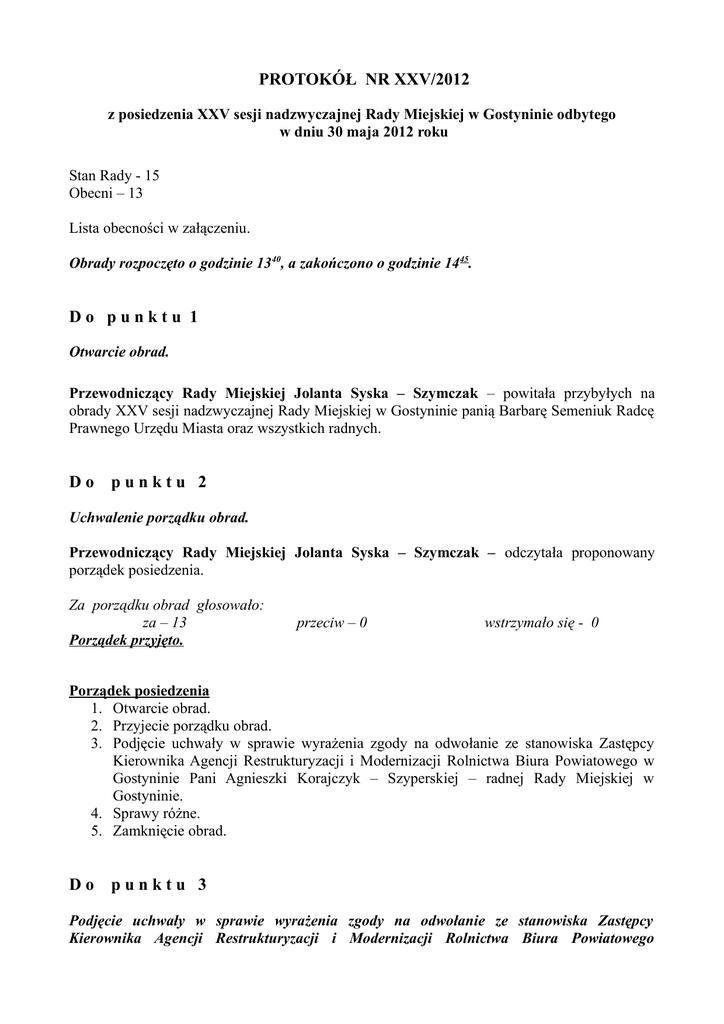 PROTOKÓŁ NR XXV/2012 z posiedzenia XXV sesji nadzwyczajnej Rady Miejskiej w Gostyninie odbytego w dniu 30 maja 2012 roku Stan Rady - 15 Obecni – 13 Lista obecności w załączeniu. Obrady rozpoczęto o godzinie 1340, a zakończono o godzinie 1445. Do punktu 1 Otwarcie obrad. Przewodniczący Rady Miejskiej Jolanta Syska – Szymczak – powitała przybyłych na obrady XXV sesji nadzwyczajnej Rady Miejskiej w Gostyninie panią Barbarę Semeniuk Radcę Prawnego Urzędu Miasta oraz wszystkich radnych. Do punktu 2 Uchwalenie porządku obrad. Przewodniczący Rady Miejskiej Jolanta Syska – Szymczak – odczytała proponowany porządek posiedzenia. Za porządku obrad głosowało: za – 13 Porządek przyjęto. przeciw – 0 wstrzymało się - 0 Porządek posiedzenia 1. Otwarcie obrad. 2. Przyjecie porządku obrad. 3. Podjęcie uchwały w sprawie wyrażenia zgody na odwołanie ze stanowiska Zastępcy Kierownika Agencji Restrukturyzacji i Modernizacji Rolnictwa Biura Powiatowego w Gostyninie Pani Agnieszki Korajczyk – Szyperskiej – radnej Rady Miejskiej w Gostyninie. 4. Sprawy różne. 5. Zamknięcie obrad. Do punktu 3 Podjęcie uchwały w sprawie wyrażenia zgody na odwołanie ze stanowiska Zastępcy Kierownika Agencji Restrukturyzacji i Modernizacji Rolnictwa Biura Powiatowego w Gostyninie Pani Agnieszki Korajczyk – Szyperskiej – radnej Rady Miejskiej w Gostyninie. Przewodniczący Rady Miejskiej Jolanta Syska – Szymczak – do Biura Rady wpłynęło pismo z Agencji Restrukturyzacji i Modernizacji Rolnictwa Mazowiecki Oddział Regionalny, które pozwolę sobie odczytać – treść pisma stanowi załącznik do protokołu. W związku z tym pismem został opracowany projekt uchwały. Wiceprzewodnicząca Rady Miejskiej Miejskiej Agnieszka Korajczyk – Szyperska – w 2008 roku rozpoczęłam pracę w Agencji Restrukturyzacji i Modernizacji Rolnictwa na stanowisku Zastępcy Kierownika Biura Powiatowego, posiadałam i nadal posiadam odpowiednie kwalifikacje ponieważ posiadam wykształcenie w kierunku administracyjnym posiadam również doświadczenie pracy w instytucjach samorządowych i dlatego też zostałam przyjęta do tej pracy. Przez cztery lata wykonywałam swoja pracę zgodnie z zakresem obowiązków który podpisałam i nie było żadnych zastrzeżeń ani od dyrektora ani też od kierownika który był moim zwierzchnikiem w tej instytucji w biurze powiatowym. Wykonywałam również polecenia kierownika odnośnie egzaminów zobowiązujących procedur, zdałam ich około 30, pozostał mi jeden. Owszem 26 kwietnia odmówiłam udziału w egzaminie gdyż powodem była choroba mojego dziecka i z racji tej choroby przedstawiłam zwolnienie od pracy. Niestety nie było mi dane podejść drugi raz do egzaminu ponieważ moja obecna pani kierownik wystosowała pismo do dyrektora o odwołanie mnie ze stanowiska, chociaż podkreślam, że przez cztery lata ani dyrektorzy którzy zarządzają agencją w Warszawie ani mój ówczesny kierownik nie widzieli zastrzeżeń co do moich kompetencji i co do wykonywania mojej pracy. Radny Andrzej Robacki – czy to jest o zamianę stanowiska? Przewodniczący Rady Miejskiej Jolanta Syska – Szymczak – pismem z 27 kwietnia Kierownik Biura Powiatowego w Gostyninie zwrócił się do Dyrektora Mazowieckiego Oddziału Regionalnego o zmianę stanowiska dla pracownika. Radny Andrzej Robacki – rozumiem, że o zamianę stanowiska. Wiceprzewodnicząca Rady Miejskiej Miejskiej Agnieszka Korajczyk – Szyperska – dlaczego tak się stało, że ani Agencja ani Biuro Rady mnie nie powiadomiło, że jest takie pismo w mojej sprawie, tylko dowiaduję się o tym z portalu internetowego, że na najbliższej sesji będzie omawiana moja sprawa dotycząca mojego dalszego zatrudnienia bądź nie. Czy nie powinnam się najpierw ja o tym dowiedzieć i radni a nie na pierwszym miejscu dowiaduje się jakiś portal internetowy. Radny Andrzej Robacki – czy to z Biura Rady wyszła informacja do któregoś z portali internetowych, może to jest jakaś zagrywka polityczna. Przewodniczący Rady Miejskiej Jolanta Syska – Szymczak – pismo to wpłynęło do biura i nigdzie nie zostało wysyłane. Jest również pismo do pana dyrektora Mazowieckiego Oddziału Regionalnego w sprawie prośby o zmianę stanowiska pracy dla pani Agnieszki Korajczyk – Szyperskiej – treść pisma stanowi załącznik do protokołu. Ponadto zostało również odczytane pismo Agencji Restrukturyzacji i Modernizacji Rolnictwa Mazowiecki Oddział Regionalny w sprawie: egzaminy z procedur – pismo stanowi załącznik do protokołu. Radna Małgorzata Kostun – dlaczego to nie było opiniowane na komisji. Przewodniczący Rady Miejskiej Jolanta Syska – Szymczak – projekty uchwał w sprawach personalnych nie podlegają opinii komisji. Naszym zadaniem jest tylko opiniowane, my i tak nie mamy wpływu na decyzję pracodawcy. Radny Andrzej Robacki – ja w kwestii formalnej, chciałem zapytać panią prawnik bo w tym projekcie uchwały mamy w sprawie wyrażenia zgody na odwołanie ze stanowiska a we wniosku jest o zamianę stanowiska. Radca Prawny Barbara Semeniuk – ja rozumiem, że pracodawca wnosi o rozwiązanie. Wiceprzewodnicząca Rady Miejskiej Miejskiej Agnieszka Korajczyk – Szyperska – ja tego nie wiem, gdyż nie otrzymałam żadnego pisma, ja dowiedziałam się o tej sytuacji ze stron internetowych. Przewodniczący Rady Miejskiej Jolanta Syska – Szymczak – w piśmie mamy o odwołanie ze stanowiska. Wiceprzewodnicząca Rady Miejskiej Miejskiej Agnieszka Korajczyk – Szyperska – generalnie jest tak, że jeśli ktoś był powołany na stanowisko a następnie jest odwołanie to wiąże się to z utratą pracy. Przewodniczący Rady Miejskiej Jolanta Syska – Szymczak – proponuje powołanie komisji skrutacyjnej celem przeprowadzenia głosowania tajnego. Zgłaszam wniosek o tajne glosowanie. Radny Andrzej Reder – wydaje mi się, że wynika to z ustawy, że rada podejmuje swoje uchw