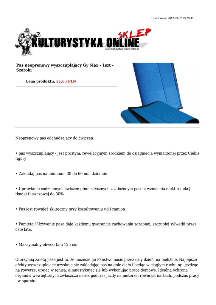 Utworzono: 2017-03-02 23:29:45 Pas neoprenowy wyszczuplający Gy Max - 1szt Szeroki Cena produktu: 21,65 PLN Neoprenowy pas odchudzający do ćwiczeń: • pas wyszczuplający - jest prostym, rewelacyjnym środkiem do osiągnięcia wymarzonej przez Ciebie figury • Zakładaj pas na minimum 30 do 60 min dziennie • Uprawianie codziennych ćwiczeń gimnastycznych z założonym pasem wzmacnia efekt redukcji tkanki tłuszczowej do 30% • Pas jest również skuteczny przy kształtowaniu ud i ramion • Pamietaj! Używanie pasa daje każdemu gwarancje zachowania zgrabnej, szczupłej sylwetki przez całe lata. • Maksymalny obwód talii 125 cm Olbrzymią zaletą pasa jest to, że możecie go Państwo nosić przez cały dzień, na bieliźnie. Najlepsze efekty wyszczuplające uzyskuje się zakładając pas na gołe ciało i będąc w ciągłym ruchu np. jeżdżąc na rowerze, grając w tenisa, gimnastykując się lub wykonując prace domowe. Idealna ochrona organów wewnętrznych zwłaszcza nerek podczas jazdy na motorze, rowerze, nartach, podczas pracy i w sporcie. Pas ma wymiary: 100cm długości i aż 25cm szerokości. Adres: http://www.ko.sklep.pl/ Telefon: kom. 782 010 880 Email: [email protected]