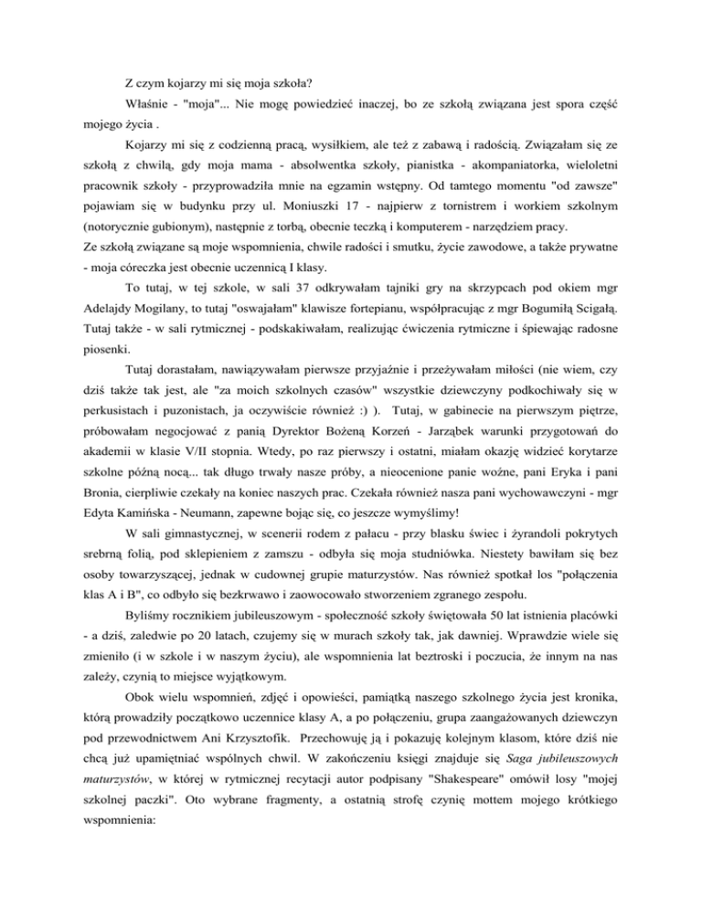 Z czym kojarzy mi się moja szkoła? Właśnie - "moja"... Nie mogę powiedzieć inaczej, bo ze szkołą związana jest spora część mojego życia . Kojarzy mi się z codzienną pracą, wysiłkiem, ale też z zabawą i radością. Związałam się ze szkołą z chwilą, gdy moja mama - absolwentka szkoły, pianistka - akompaniatorka, wieloletni pracownik szkoły - przyprowadziła mnie na egzamin wstępny. Od tamtego momentu "od zawsze" pojawiam się w budynku przy ul. Moniuszki 17 - najpierw z tornistrem i workiem szkolnym (notorycznie gubionym), następnie z torbą, obecnie teczką i komputerem - narzędziem pracy. Ze szkołą związane są moje wspomnienia, chwile radości i smutku, życie zawodowe, a także prywatne - moja córeczka jest obecnie uczennicą I klasy. To tutaj, w tej szkole, w sali 37 odkrywałam tajniki gry na skrzypcach pod okiem mgr Adelajdy Mogilany, to tutaj "oswajałam" klawisze fortepianu, współpracując z mgr Bogumiłą Scigałą. Tutaj także - w sali rytmicznej - podskakiwałam, realizując ćwiczenia rytmiczne i śpiewając radosne piosenki. Tutaj dorastałam, nawiązywałam pierwsze przyjaźnie i przeżywałam miłości (nie wiem, czy dziś także tak jest, ale "za moich szkolnych czasów" wszystkie dziewczyny podkochiwały się w perkusistach i puzonistach, ja oczywiście również :) ). Tutaj, w gabinecie na pierwszym piętrze, próbowałam negocjować z panią Dyrektor Bożeną Korzeń - Jarząbek warunki przygotowań do akademii w klasie V/II stopnia. Wtedy, po raz pierwszy i ostatni, miałam okazję widzieć korytarze szkolne późną nocą... tak długo trwały nasze próby, a nieocenione panie woźne, pani Eryka i pani Bronia, cierpliwie czekały na koniec naszych prac. Czekała również nasza pani wychowawczyni - mgr Edyta Kamińska - Neumann, zapewne bojąc się, co jeszcze wymyślimy! W sali gimnastycznej, w scenerii rodem z pałacu - przy blasku świec i żyrandoli pokrytych srebrną folią, pod sklepieniem z zamszu - odbyła się moja studniówka. Niestety bawiłam się bez osoby towarzyszącej, jednak w cudownej grupie maturzystów. Nas również spotkał los "połączenia klas A i B", co odbyło się bezkrwawo i zaowocowało stworzeniem zgranego zespołu. Byliśmy rocznikiem jubileuszowym - społeczność szkoły świętowała 50 lat istnienia placówki - a dziś, zaledwie po 20 latach, czujemy się w murach szkoły tak, jak dawniej. Wprawdzie wiele się zmieniło (i w szkole i w naszym życiu), ale wspomnienia lat beztroski i poczucia, że innym na nas zależy, czynią to miejsce wyjątkowym. Obok wielu wspomnień, zdjęć i opowieści, pamiątką naszego szkolnego życia jest kronika, którą prowadziły początkowo uczennice klasy A, a po połączeniu, grupa zaangażowanych dziewczyn pod przewodnictwem Ani Krzysztofik. Przechowuję ją i pokazuję kolejnym klasom, które dziś nie chcą już upamiętniać wspólnych chwil. W zakończeniu księgi znajduje się Saga jubileuszowych maturzystów, w której w rytmicznej recytacji autor podpisany "Shakespeare" omówił losy "mojej szkolnej paczki". Oto wybrane fragmenty, a ostatnią strofę czynię mottem mojego krótkiego wspomnienia: Dziewiętnaście, dwie siódemki - rok to był naprawdę wielki! Fakt to jest nie byle jaki - narodziły się Dzieciaki! Dzieci pełne były zalet, no i jeden miały talent: Szkoło, szkoło! O Muzyczna! O, Ty Piękna! O, Ty Śliczna! -------------------------------------Tak więc wszystko było jasne - kuć talenty trzeba własne! 1 - 9 - 8 - 4 i zaczęły się numery! Lecz Rodzice się uparli: skryli autka, lalki Barbie, i gnębiono biedne dzieci w podstawówce, a czas leci! ---------------------------------------I zaczęły się terminy - wielkie wstępne egzaminy; hista muzy, mata, polski - to już nowe obowiązki! Geografia, chemia, hista - no a wiedza była śliska! I kolokwia, egzaminy! Co my tu jeszcze robimy?!? ------------------------------------------Teraz skupcie się (...), bo ważniejsze padną daty: 1 - 9 - 9 - 2: każdy "A", "B" klasę ma! 1 - 9 - 9 - 3: odtąd razem - MY i WY! Wychowawca jeden wspólny, pokój - problem był ogólny. Ach, to były piękne czasy! Te turnieje i zapasy! -----------------------------------------------(...) Teraz mózgiem ruszyć trzeba - AKADEMIA - wielkie nieba! (...) Marzec przyszedł wnet gorący - POŻEGNANIA czas pędzący! (...) Mecz to była już igraszka, taniec dziewcząt - czysta fraszka, i wygrana się liczyła - grupa chłopców ją zdobyła! Wiele walki, dużo krzyku, a oceny już w dzienniku! ------------------------------------------Lipiec, sierpień piękna sprawa, teraz nowa już zabawa: to matura się szykuje, każdy siedzi więc i kuje! Czternastego, piętnastego grudnia grali "na całego"! To soliści się spotkali mieli zagrać, to zagrali! ------------------------------------------------Święta, święta i po świętach! Klasa świeża, wypoczęta! Głowy mają kwadratowe, wieści chłoną ciągle nowe! Mahler, Chopin, Liszt i Haendel, walc, chaconna, marsz i laendler! Formy, formy, śnią się w nocy! Wiemy, że to sen proroczy! ---------------------------------------------Lecz do dnia sądnego tego, dość daleko jest, Kolego! Baw się dzisiaj na całego w sali pałacu owego! (...) Morał z bajki płynie taki - trzeba uczyć się Dzieciaki! Repertuar i technika, z kucia wszystko to wynika! Na maturze wiedzę zważą, wyjść z niej trzeba z dumną twarzą! Kiedyś będą się chwalili, że Cię niegdyś docenili! ------------------------------------------------(...) Przez pół kwietnia teraz gramy, serca jury zdobywamy! Matma, polski - to już w maju i czujemy się jak w raju! Otaczany uwielbieniem KONIEC, stał się już marzeniem! 1 - 9, 9 i 6!!! Wreszcie KONIEC! Wreszcie CZEŚĆ! --------------------------------------------------Jubileusz świętujemy, co złe było - my nie wiemy! Wszystkim pięknie dziękujemy, prosto z serca - jak umiemy! Skończy się wnet bajka nasza, wielki świat 