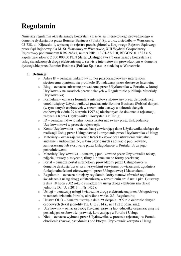 Regulamin Niniejszy regulamin określa zasady korzystania z serwisu internetowego prowadzonego w domenie dyskusja.biz przez Bonnier Business (Polska) Sp. z o.o., z siedzibą w Warszawie, 03-738, ul. Kijowska 1, wpisaną do rejestru przedsiębiorców Krajowego Rejestru Sądowego przez Sąd Rejonowy dla M. St. Warszawy w Warszawie, XIII Wydział Gospodarczy Rejestrowy pod numerem KRS 24847, numer NIP 113-01-55-210, REGON: 011823316, kapitał zakładowy: 2 000 000,00 PLN (dalej: „Usługodawca”) oraz zasady korzystania z usług świadczonych drogą elektroniczną w serwisie internetowym prowadzonym w domenie dyskusja.biz przez Bonnier Business (Polska) Sp. z o.o., z siedzibą w Warszawie. 1. Definicje o Adres IP – oznacza unikatowy numer przyporządkowany interfejsowi sieciowemu opartemu na protokole IP, nadawany przez dostawcę Internetu; o Blog – oznacza substronę prowadzoną przez Użytkownika w Portalu, w której Użytkownik na zasadach przewidzianych w Regulaminie publikuje Materiały Użytkownika; o Formularz – oznacza formularz internetowy stosowany przez Usługodawcę, umożliwiający Użytkownikowi przekazanie Bonnier Business (Polska) danych (w tym danych osobowych w rozumieniu ustawy o ochronie danych osobowych z dnia 29 sierpnia 1997 r.) niezbędnych do dokonania rejestracji, założenia Konta Użytkownika i korzystania z Usług; o ID – oznacza indywidualny identyfikator nadawany przez Usługodawcę Użytkownikowi w procesie rejestracji; o Konto Użytkownika – oznacza bazę zawierającą dane Użytkownika służące do realizacji Usług przez Usługodawcę i korzystania przez Użytkownika z Usług; o Materiały – oznaczają wszelkie treści tekstowe oraz utrwalenia wizualne, audialne i audiowizualne, w tym bazy danych i aplikacje publikowane, zamieszczane lub stosowane przez Usługodawcę w Portalu lub za jego pośrednictwem; o Materiały Użytkownika – oznaczają publikowane przez Użytkownika teksty, zdjęcia, utwory plastyczne, filmy lub inne znane formy przekazu; o Portal – oznacza portal internetowy prowadzony przez Usługodawcę w domenie dyskusja.biz wraz z wszystkimi serwisami powiązanymi, zgodnie z funkcjonalnościami oferowanymi przez Usługodawcę i Materiałami; o Regulamin – oznacza niniejszy regulamin, który stanowi również regulamin świadczenia usług drogą elektroniczną w rozumieniu art. 8 ust 1 pkt. 1) ustawy z dnia 18 lipca 2002 roku o świadczeniu usług drogą elektroniczna (tekst jednolity Dz. U. z 2013 r., Nr 1422); o Usługi – oznaczają usługi świadczone drogą elektroniczną przez Usługodawcę w ramach działania Portalu, określone w pkt. 2.3. Regulaminu; o Ustawa ODO – oznacza ustawę z dnia 29 sierpnia 1997 r. o ochronie danych osobowych (tekst jednolity Dz. U. z 2014 r., nr 1182 z późn. zm.); o Użytkownik – oznacza osobę fizyczną, prawną lub jednostkę organizacyjną nie posiadającą osobowości prawnej, korzystającą z Portalu i Usług; o Nick – oznacza wybrane przez Użytkownika w procesie rejestracji w Portalu określenie (nazwę, pseudonim) pod którym Użytkownik korzysta z Usług. 2. Usługi 1. Portal jest informacyjno – publicystycznym serwisem internetowym poświęconym tematyce ekonomicznej i gospodarczej, mającym w pierwszym rzędzie na celu umożliwienie Użytkownikowi publikacji w formie Materiałów Użytkownika informacji, opinii i wypowiedzi publicystycznych oraz polemicznych poświęconych gospodarce, w formie stałego tematycznego Bloga. 2. W części w jakiej do korzystania z funkcjonalności Portalu nie jest wymagana rejestracja Portal jest internetowym publikatorem informacyjnym i opiniotwórczym, umożliwiającym na zasadach przewidzianych w Regulaminie, dostęp do Materiałów oraz Materiałów Użytkownika, w celu zapoznawania się z ich treścią. 3. Usługami świadczonymi przez Usługodawcę w ramach funkcjonowania Portalu są w szczególności: 1 udostępnianie Materiałów, w celu zapoznawania się z ich treścią; 2 udostępnianie Użytkownikowi narzędzi umożliwiających prowadzenie Bloga, w tym udostępnienie miejsca na serwerach Usługodawcy w celu przechowywania danych stanowiących Materiały Użytkownika zamieszczane przez Użytkownika w treści Bloga. 4. Z zastrzeżeniem postanowień rozdziału 6 Regulaminu Usługi świadczone w Portalu są bezpłatne. 5. Korzystanie z Usług jest możliwe pod warunkiem spełnienia przez Użytkownika co najmniej następujących wymagań technicznych i sprzętowych: 1 dostęp do Internetu, co najmniej 512 kbps lub szybszy; 2 zainstalowania przeglądarki internetowej; 3 zainstalowany system operacyjny (Windows XP lub nowszy system operacyjny firmy Microsoft Inc., OS X 10.7 lub nowszy system operacyjny firmy Apple Inc. lub Ubuntu 12.04 LTS lub nowszy); 4 dysponowania komputerem osobistym o pamięci RAM 512 MB lub większej, wyposażonym w procesor o wydajności Intel Pentium 4 lub wyższej. 6. Użytkownik, który korzysta z funkcjonalności Portalu w części, do której dostęp nie wymaga procesu rejestracji związany jest zasadami korzystania z tej części Portalu określonymi w Regulaminie, w szczególności zasadami dostępności i korzystania z Materiałów lub Materiałów Użytkownika. 7. Zasady objęte Regulaminem wiążą każdego Użytkownika, który decyduje się na korzystanie z Portalu. 3. Rejestracja 1. Warunkiem rozpoczęcia korzystania z Usług, o których mowa w pkt. 2.3.2. Regulaminu jest przeprowadzenie przez Użytkownika procesu rejestracji w Portalu zrealizowane poprzez wypełnienie i przesłanie Formularza oraz zaakceptowanie postanowień Regulaminu. 2. W przypadku Blogów sponsorowanych dodatkowym warunkiem dla rozpoczęcia korzystania z Usługi, o której mowa w pkt. 2.3.2. Regulaminu jest zawarcie z Usługodawcą odrębnej, indywidualnej umowy o której mowa w pkt. 6.1 Regulaminu. Umowa wraz z treścią Regulaminu stanowią Umowę o prowadzenie Bloga w Portalu. 3. Z momentem zaakceptowania postanowień Regul