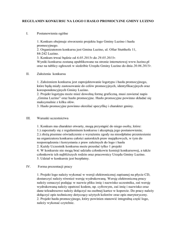 REGULAMIN KONKURSU NA LOGO I HASŁO PROMOCYJNE GMINY LUZINO I. Postanowienia ogólne 1. Konkurs obejmuje stworzenie projektu logo Gminy Luzino i hasła promocyjnego. 2. Organizatorem konkursu jest Gmina Luzino, ul. Ofiar Stutthofu 11, 84-242 Luzino. 3. Konkurs trwać będzie od 6.05.2015r.do 29.05.2015r. Wyniki konkursu zostaną opublikowane na stronie internetowej www.luzino.pl oraz na tablicy ogłoszeń w siedzibie Urzędu Gminy Luzino do dnia 20.06.2015r. II. Założenia konkursu 1. Założeniem konkursu jest zaprojektowanie logotypu i hasła promocyjnego, które będą miały zastosowanie do celów promocyjnych, identyfikacyjnych oraz korespondencyjnych Gminy Luzino. 2. Projekt logotypu może mieć dowolną formę graficzną, musi zawierać napis „Gmina Luzino” oraz hasło promocyjne. Hasło promocyjne powinno składać się maksymalnie z kilku słów. 3. Hasło promocyjne powinno określać specyfikę i charakter gminy. III. Warunki uczestnictwa 1. Konkurs ma charakter otwarty, mogą przystąpić do niego osoby, które: 1.) zapoznały się z regulaminem konkursu i akceptują jego postanowienia; 2.) złożą pisemne oświadczenie o wyrażeniu zgody na nieodpłatne przeniesienie na organizatora konkursu całości autorskich praw majątkowych, w tym do rozporządzenia i korzystania z praw zależnych do logo i hasła 2. Każdy Uczestnik konkursu może przesłać tylko 1 projekt 4. W konkursie nie mogą brać udziału członkowie komisji konkursowej, a także członkowie ich najbliższych rodzin oraz pracownicy Urzędu Gminy Luzino. 5. Udział w konkursie jest bezpłatny. IV. Forma prezentacji pracy 1. Projekt logo należy wykonać w wersji elektronicznej zapisanej na płycie CD, dostarczyć należy również wersję wydrukowaną. Wersję elektroniczną pracy należy oznaczyć podając w nazwie pliku imię i nazwisko uczestnika, zaś wersję wydrukowaną należy opatrzeć kodem, np. cyfrowym, zaś imię i nazwisko oraz dane teleadresowe należy dołączyć na osobnej kartce w kopercie. Do pracy należy dołączyć opis techniczny dotyczący użytych kolorów oraz opis merytoryczny. 2. Projekt hasła promocyjnego, który powinien stanowić integralną część logo, należy wykonać czytelnie. 3. Praca konkursowa zapisana na płycie CD, obejmująca logo i hasło, powinna znajdować się w kopercie z napisem: „Konkurs na logo i hasło promocyjne gminy Luzino”. Na kopercie należy zamieścić imię i nazwisko autora oraz jego dane teleadresowe. V. Miejsce i termin składania prac konkursowych 1.Prace konkursowe należy składać w siedzibie organizatora, tj. w Kancelarii Urzędu Gminy Luzino, ul. Ofiar Stutthofu 11, 84-242 Luzino, w terminie do 29.05.2015r. do godz.15.00. 2. Prace konkursowe nie spełniające wymagań, o których mowa w regulaminie konkursu, lub nadesłane po upływie terminu, o jakim mowa w ust. 1, nie będą podlegały ocenie komisji konkursowej VI. Zasady przyznawania nagród 1. Wyboru zwycięzcy konkursu dokona czteroosobowa komisja konkursowa powołana przez Organizatora w 50% oraz 50% oceny stanowić będą głosy mieszkańców, które oddawać będzie można na Fanpage’u Gminy Luzino od 1.06.2015r do 7.06.2015 r. do godziny 15. 2. Komisja konkursowa przyzna jedną nagrodę główną- 2500 zł 3. Z przebiegu konkursu komisja konkursowa sporządzi protokół. 4. Odbiór nagrody nastąpi w siedzibie organizatora. O terminie odbioru nagrody organizator poinformuje zwycięzcę w ciągu 1 tygodnia od dnia ogłoszenia wyników konkursu. VII. Prawa autorskie i dane osobowe 1. W konkursie mogą brać udział jedynie propozycje logo i haseł będące wynikiem samodzielnej i indywidualnej pracy 2. Z chwilą zgłoszenia projektu logo i hasła do konkursu uczestnik wyraża zgodę na korzystanie z tego projektu przez organizatora dla celów konkursowych. 3. Dane osobowe przekazane organizatorowi przez uczestników konkursu będą przez niego przetwarzane zgodnie z przepisami ustawy z dnia 29 sierpnia 1997r. o ochronie danych osobowych, tylko i wyłącznie do celów niniejszego konkursu, 4. Z chwilą ogłoszenia wyników konkursu następuje ostateczne przeniesienie przez zwycięzcę konkursu na Gminę Luzino praw autorskich do zwycięskiego logo i hasła, rozporządzanie nabytymi autorskimi prawami majątkowymi, w tym zezwalanie na rozporządzanie i korzystanie z zależnego prawa autorskiego i nieodpłatnego korzystania na wszystkich polach eksploatacji znanych w chwili ogłoszenia konkursu. 5. Gmina Luzino będzie uprawniona do korzystania z logo i hasła jako symboli w sposób anonimowy – bez konieczności każdorazowego podawania danych autora. Na warunki te uczestnik konkursu wyraża zgodę poprzez przystąpienie do konkursu. 6. Organizator konkursu będzie mógł: 1) modyfikować i upowszechniać logo i hasło promocyjne; 2) rozpowszechniać logo i hasło w każdy inny sposób, tj. poprzez publiczne wykonanie i wystawienie, odtworzenie oraz nadawanie i reemitowanie, w szczególności udostępniać publicznie tak, aby każdy mógł mieć do nich dostęp w miejscu i w czasie przez siebie wybranym VIII. Postanowienia końcowe 1. Treść regulaminu konkursu dostępna jest na stronie internetowej organizatora www.luzino.pl oraz w Urzędzie Gminy Luzino 2. Zgłoszenie do udziału w konkursie jest równoznaczne z akceptacją niniejszego regulaminu. 3. Organizator konkursu nie zwraca nadesłanych prac konkursowych. 4. Organizator nie ponosi odpowiedzialności za szkody (zarówno majątkowe, jak i niemajątkowe) poniesione przez uczestnika konkursu bądź przez osoby trzecie, w związku z uczestnictwem w konkursie. 5. Wszelkie wątpliwości dotyczące konkursu wyjaśnia organizator.