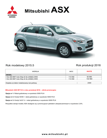 Mitsubishi ASX Rok produkcji 2016 Rok modelowy 2015.5 WERSJA DIESEL 1.6L DiD 6MT Auto Stop & Go (AS&G) 2WD 1.6L DiD 6MT Auto Stop & Go (AS&G) 4WD MOC INVITE 114 KM 114 KM 92 990 102 990 Dopłata za lakier metalizowany lub perłowy Mitsubishi ASX MY15.5 z roku produkcji 2016 – oferta promocyjna Opcja nr 1: Rabat gotówkowy w wysokości 5000 PLN Opcja nr 2: Kredyt 50/50 + rabat gotówkowy w wysokości 5000 PLN Opcja nr 3: Kredyt 3x33 % + rabat gotówkowy w wysokości 5000 PLN Wszystkie wersje modelu ASX dostępne są z promocyjnym pakietem ubezpieczeniowym w wysokości 2,9%. 2300 Wersja wyposażenia Invite Silnik i układ napędowy / Opony i koła Silnik diesla 1.6 114 KM Auto Stop & Go (AS&G) z napędem na koła przednie (2WD) Silnik diesla 1.6 114 KM Auto Stop & Go (AS&G) z napędem na wszystkie koła (4WD) Opony 215/70R16 z felgami aluminiowymi 16" + zestaw naprawczy Bezpieczeństwo System stabilizacji toru jazdy i kontroli trakcji (ASC + TCL) System wspomagania ruszania pod górę (HSA) + System wspomagania hamowania System ABS z elektronicznym rozdziałem siły hamowania Konstrukcja nadwozia typu RISE Czołowe, boczne i kurtynowe poduszki powietrzne + kolanowa poduszka dla kierowcy Czujniki parkowania z tyłu Oświetlenie i widoczność Przednie reflektory halogenowe Przednie reflektory przeciwmgielne Światła do jazdy dziennej ( żarówka ) Światła mijania z czujnikiem zmierzchu / Wycieraczki szyby przedniej z czujnikiem deszczu Oświetlenie wnętrza w podsufitce z przodu Elementy zewnętrzne Podgrzewane i elektrycznie regulowane lusterka boczne 1 Obudowy lusterek bocznych i klamki w kolorze nadwozia Chromowane wykończenie osłony chłodnicy Chromowane obramowanie okien Chromowana końcówka wydechu Elementy wewnętrzne Materiałowa tapicerka siedzeń Skórzane obszycie kierownicy i gałki dźwigni zmiany biegów Wykończenie kierownicy czarnym, błyszczącym materiałem Kolorowy wyświetlacz wielofunkcyjny LCD Komfort i wygoda Klimatyzacja automatyczna Tempomat ze sterowaniem na kierownicy Elektrycznie sterowane szyby (przód/tył) Gniazdko elektryczne 12V x2 Centralny podłokietnik ze schowkiem (I rząd siedzeń) Audio i komunikacja Radioodtwarzacz 2DIN CD/MP3 Ilość głośników 1 ● ▬ ● ● ● ● ● ● ● ● ● ● ●/● ● ● ● ● ● ● ● ● ● ● ● ● ● ● ● ● 6 Dla koloru nadwozia X42 obudowy lusterek wykonana z czarnego materiału o wysokim połysku WERSJA Pojemność silnika Maks. moc/obr.min. Maks. moment obrotowy/obr.min. Skrzynia biegów Przyspieszenie 0-100 km/h Invite 2WD Invite 4WD UKŁAD NAPĘDOWY I OSIĄGI cm3 1560 KM 114/3600 Nm 270/1750 Manualna 6-biegowa sek. 11.2 Prędkośc maksymalna km/h 182 ŚREDNIE ZUŻYCIE PALIWA (EMISJA CO2) Tryb mieszany l/100km (g/km) 4,6 (119) 11.5 180 5 (132) Dane zawarte w niniejszym cenniku samochodu Mitsubishi mają wyłącznie charakter informacyjny. Podane informacje nie stanowią oferty ani zapewnienia, w szczególności w rozumieniu art. 66 § 1 oraz art. 556 Kodeksu Cywilnego. Zawarte w cenniku informacje na temat gwarancji samochodu nie stanowią udzielenia kupującemu gwarancji, w szczególności w rozumieniu art. 577 Kodeksu cywilnego. Gwarancja zostanie udzielona przy sprzedaży samochodu, a jej warunki zostaną określone w dokumencie gwarancyjnym. Ze względu na ograniczenia techniczne (np. odwzorowanie kolorów przez monitor lub sposób wydruku), kolory przedstawione w niniejszym cenniku mogą się różnić od rzeczywistych kolorów nadwozia i tapicerki. Prezentowane zdjęcia mogą zawierać wyposażenie opcjonalne (akcesoryjne), dodatkowo płatne. MMC Car Poland sp. z o.o. zastrzega sobie prawo do wprowadzenia zmian cennika oraz parametrów technicznych i wyposażenia samochodów Mitsubishi oferowanych na rynku polskim bez uprzedzenia. Należy pamiętać, że wpływ na rzeczywiste parametry samochodu, w tym w zakresie zużycia paliwa, emisji CO2, prędkości maksymalnej, przyspieszenia (także innych właściwości trakcyjnych) ma m.in. wyposażenie dodatkowe, obsługa, styl jazdy, warunki drogowe i atmosferyczne. Dlatego rzeczywiste dane mogą nieco różnić się od podanych w niniejszym cenniku. Informacje o recyklingu samochodów Mitsubishi, w tym o ich konstrukcji zgodnej z przepisami o recyklingu, o zgodnym z wymogami ochrony środowiska postępowaniu z samochodami stanowiącymi odpady, jak też informacje o postępie i rozwoju w zakresie odzysku i recyklingu samochodów i ich części, oraz informacje o stacjach odbioru wysłużonych samochodów znajdują się na stronie internetowej: www.mitsubishi.pl.